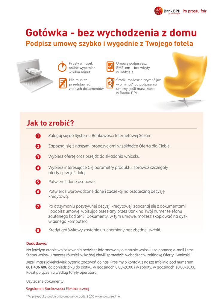 Gotówka - bez wychodzenia z domu Podpisz umowę szybko i wygodnie z Twojego fotela Prosty wniosek online wypełnisz w kilka minut Umowę podpiszesz SMS-em – bez wizyty w Oddziale Nie musisz przedstawiać żadnych dokumentów Środki możesz otrzymać już w 5 minut* po podpisaniu umowy, jeśli masz konto w Banku BPH. Jak to zrobić? 1 Zaloguj się do Systemu Bankowości Internetowej Sezam. 2 Zapoznaj się z naszymi propozycjami w zakładce Oferta dla Ciebie. 3 Wybierz ofertę oraz przejdź do składania wniosku. 4 Wybierz interesujące Cię parametry produktu, sprawdź szczegóły oferty i przejdź dalej. 5 Potwierdź dane osobowe. 6 Potwierdź wprowadzone dane i zaczekaj na ostateczną decyzję kredytową. 7 Po otrzymaniu pozytywnej decyzji kredytowej, zapoznaj się z dokumentami i podpisz umowę, wpisując przesłany przez Bank na Twój numer telefonu zaufanego kod SMS. Dokumenty, w tym umowę, możesz skopiować na dysk własnego komputera. 8 Kredyt gotówkowy zostanie uruchomiony bez zbędnej zwłoki. Dodatkowo: Na każdym etapie wnioskowania będziesz informowany o statusie wniosku za pomocą e-mail i sms. Status wniosku możesz również w każdej chwili sprawdzić, wchodząc w zakładkę Oferty i Wnioski. Jeżeli masz jakiekolwiek pytania zadzwoń do nas. Prosimy o kontakt z naszą Infolinią pod numerem 801 406 406 od poniedziałku do piątku, w godzinach 8:00-20:00 i w soboty, w godzinach 10.00-16.00. Koszt połączenia według taryfy operatora. Użyteczne dokumenty: * W przypadku podpisania umowy do godz. 20:00 w dni powszednie. Odpowiedzi na najczęściej zadawane pytania W jakich godzinach mogę złożyć wniosek o kredyt gotówkowy online? Wniosek o kredyt gotówkowy możesz złożyć o dowolnej godzinie, 7 dni w tygodniu. W jakich godzinach mogę podpisać umowę? Po pozytywnej decyzji kredytowej masz 14 dni na podpisanie umowy. Umowę możesz podpisać w wygodnej dla Ciebie chwili. Jak wygląda podpisanie umowy online? Umowę podpiszesz online za pomocą sześciocyfrowego kodu przesyłanego SMS-em pod numer Twojego telefonu komórkowego (tzw. zaufanego numeru telefonu). Jest to ten sam numer telefonu, którym autoryzujesz transakcje zawierane poprzez system bankowości internetowej Sezam. Numer telefonu zaufanego został zdefiniowany przez Ciebie przy zawieraniu Umowy o udostępnienie kanałów elektronicznych dla Klientów Indywidualnych / Umowy rachunku oszczędnościowo-rozliczeniowego, usług bankowości elektronicznej i karty debetowej. Podpisanie umowy będzie możliwe po zapoznaniu się i akceptacji listy dokumentów dot. kredytu. Dokumenty możesz skopiować na dysk własnego komputera. Kiedy zostanie uruchomiony kredyt? Kredyt gotówkowy jest uruchamiany: - w dniu zawarcia umowy, w przypadku, gdy wskazany zostanie do przelewu Rachunek prowadzony w Banku BPH, - w pierwszej sesji przelewów Elixir wychodzącej po zawarciu umowy, w przypadku wskazania rachunku w innym banku niż Bank BPH. Jeżeli umowa została podpisana w sobotę lub niedzielę lub w dni uznane ustawowo za wolne od pracy lub po godzinie 20:00 w dniach od poniedziałku do piątku, przelew środków z kredytu zostanie wykonany w pierwszym dniu roboczym po podpisaniu Umowy. Gdzie mogę znaleźć dokumenty dotyczące uruchomionego kredytu? Dokumenty są dostępne w systemie bankowości internetowej w zakładce Szczegóły produktu. Gdzie mogę sprawdzić status wniosku w Systemie Bankowości Internetowej? Status wniosku możesz w każdej chwili sprawdzić przechodząc do listy Złożonych Wniosków w zakładce Oferty i Wnioski w Systemie Bankowości Internetowej. Jak mogę odstąpić od umowy zawartej online? Możesz odstąpić od umowy w terminie 21 dni od jej podpisania poprzez wysłanie dyspozycji ze skrzynki wiadomości w Serwisie Internetowym Sezam lub wysyłając oświadczenie o odstąpieniu, na adres: Bank BPH SA, ul. płk. Jana Pałubickiego 2, 80-175 Gdańsk.