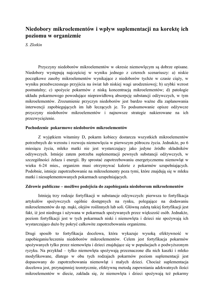 Niedobory mikroelementów i wpływ suplementacji na korektę ich poziomu w organizmie S. Zlotkin Przyczyny niedoborów mikroelementów w okresie niemowlęcym są dobrze opisane. Niedobory występują najczęściej w wyniku jednego z czterech scenariuszy: a) niskie początkowe zasoby mikroelementów wynikające z niedoborów tychże w czasie ciąży, w wyniku przedwczesnego przyjścia na świat lub niskiej wagi urodzeniowej; b) szybki wzrost postnatalny; c) spożycie pokarmów z niską koncentracją mikroelementów; d) patologie układu pokarmowego powodujące nieprawidłową absorpcję substancji odżywczych, w tym mikroelementów. Zrozumienie przyczyn niedoborów jest bardzo ważne dla zaplanowania interwencji zapobiegających im lub leczących je. To podsumowanie opisze odżywcze przyczyny niedoborów mikroelementów i najnowsze strategie nakierowane na ich przezwyciężenie. Pochodzenie pokarmowe niedoborów mikroelementów Z wyjątkiem witaminy D, pokarm kobiecy dostarcza wszystkich mikroelementów potrzebnych do wzrostu i rozwoju niemowlęcia w pierwszym półroczu życia. Jednakże, po 6 miesiącu życia, mleko matki nie jest wystarczający jako jedyne źródło składników odżywczych. Istnieje zatem potrzeba suplementacji pewnych substancji odżywczych, w szczególności żelaza i energii. By sprostać zapotrzebowaniu energetycznemu niemowląt w wieku 6-24 mies., organizm musi otrzymywać kalorie z pokarmów uzupełniających. Podobnie, istnieje zapotrzebowanie na mikroelementy poza tymi, które znajdują się w mleku matki i niesuplementowanych pokarmach uzupełniających. Zdrowie publiczne – możliwe podejścia do zapobiegania niedoborom mikroelementów Istnieją trzy rodzaje fortyfikacji w substancje odżywczych: pierwsza to fortyfikacja artykułów spożywczych ogólnie dostępnych na rynku, polegające na dodawaniu mikroelementów do np. mąki, olejów roślinnych lub soli. Główną zaletą takiej fortyfikacji jest fakt, iż jest niedroga i używana w pokarmach spożywanych przez większość osób. Jednakże, poziom fortyfikacji jest w tych pokarmach niski i niemowlęta i dzieci nie spożywają ich wystarczająco dużo by pokryć całkowite zapotrzebowaniu organizmu. Drugi sposób to fortyfikacja docelowa, która wykazuje wysoką efektywność w zapobieganiu/leczeniu niedoborów mikroelementów. Celem jest fortyfikacja pokarmów spożywanych tylko przez niemowlęta i dzieci znajdujące się w populacjach o podwyższonym ryzyku. Na przykład – tylko niemowlęta spożywają przeznaczone dla nich kaszki i mleko modyfikowane, dlatego w obu tych rodzajach pokarmów poziom suplementacji jest dopasowany do zapotrzebowania niemowląt i małych dzieci. Chociaż suplementacja docelowa jest, przynajmniej teoretycznie, efektywną metodą zapewniania adekwatnych ilości mikroelementów w diecie, zakłada się, że niemowlęta i dzieci spożywają też pokarmy fortyfikowane ogólnie dostępne dla wszystkich. Jednakże w większości gospodarstw domowych w krajach rozwijających się, niemowlęta nie spożywają tychże pokarmów, są one raczej wytwarzane przez lokalnych producentów i potem przygotowywane w domach. Dlatego takie podejście nie jest efektywne w wielu rozwijających się krajach. Trzeci model - koncepcja „domowej fortyfikacji” - został wprowadzony i rozwinięty przez badaczy w szpitalu w Toronto w Kanadzie. Rozwiązanie to jest nakierowane na poprawę jakości odżywczej pokarmów przygotowywanych w domu poprzez dodanie proszków mikroelementowych zawierających minerały i witaminy. Dla przypadków, kiedy ilość makroelementów i energii dostarczona niemowlęciu jest adekwatna, ale pokarmom brakuje mikroelementów, proszek może zostać dodany do jedzenia bezpośrednio przed posiłkiem. Systematyczne badania i metaanaliza domowej fortyfikacji pokarmów uzupełniających zostały niedawno przeprowadzone przez zespól Deweya. Badania wykazują, że proszki mikroelementowe są tak samo efektywne, jak krople żelaza, ale są lepiej przyswajalne i dają mniej efektów ubocznych. Wnioski Z tych trzech sposobów fortyfikacji pokarmu tylko dwa ostatnie są efektywne w grupie niemowląt i małych dzieci. Badania przeprowadzone w krajach rozwijających się, takich, jak Ghana, Indie, Bangladesz wykazały skuteczność domowej fortyfikacji w zapobieganiu i leczeniu niedoborów mikroelementów. W związku z powyższym, domowa suplementacja proszkami mikroelementowymi została niedawno włączona do strategii rekomendowanych przez WHO/UNICEF.