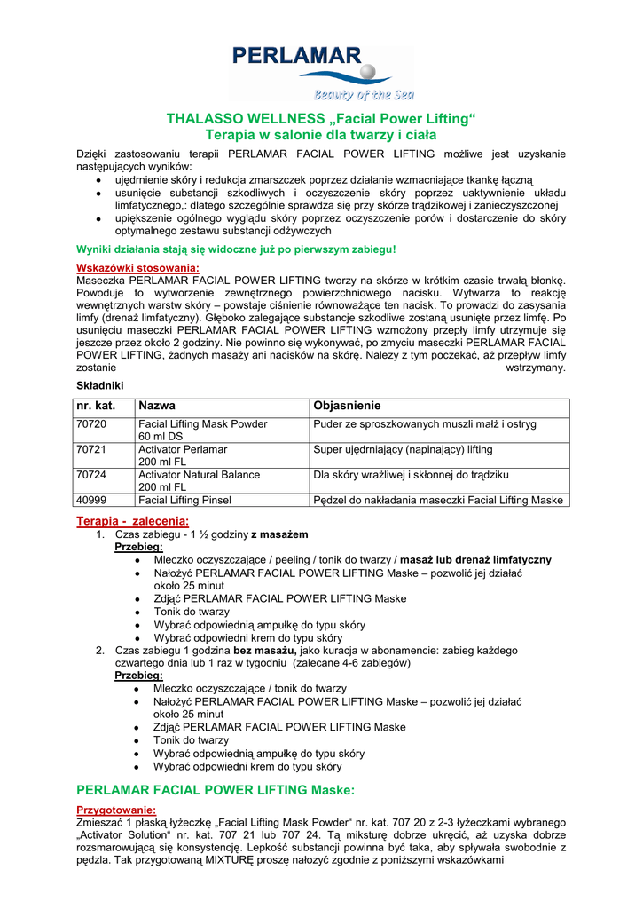 THALASSO WELLNESS „Facial Power Lifting“ Terapia w salonie dla twarzy i ciała Dzięki zastosowaniu terapii PERLAMAR FACIAL POWER LIFTING możliwe jest uzyskanie następujących wyników: ujędrnienie skóry i redukcja zmarszczek poprzez działanie wzmacniające tkankę łączną usunięcie substancji szkodliwych i oczyszczenie skóry poprzez uaktywnienie układu limfatycznego,: dlatego szczególnie sprawdza się przy skórze trądzikowej i zanieczyszczonej upiększenie ogólnego wyglądu skóry poprzez oczyszczenie porów i dostarczenie do skóry optymalnego zestawu substancji odżywczych Wyniki działania stają się widoczne już po pierwszym zabiegu! Wskazówki stosowania: Maseczka PERLAMAR FACIAL POWER LIFTING tworzy na skórze w krótkim czasie trwałą błonkę. Powoduje to wytworzenie zewnętrznego powierzchniowego nacisku. Wytwarza to reakcję wewnętrznych warstw skóry – powstaje ciśnienie równoważące ten nacisk. To prowadzi do zasysania limfy (drenaż limfatyczny). Głęboko zalegające substancje szkodliwe zostaną usunięte przez limfę. Po usunięciu maseczki PERLAMAR FACIAL POWER LIFTING wzmożony przepły limfy utrzymuje się jeszcze przez około 2 godziny. Nie powinno się wykonywać, po zmyciu maseczki PERLAMAR FACIAL POWER LIFTING, żadnych masaży ani nacisków na skórę. Nalezy z tym poczekać, aż przepływ limfy zostanie wstrzymany. Składniki nr. kat. Nazwa Objasnienie 70720 Facial Lifting Mask Powder 60 ml DS Activator Perlamar 200 ml FL Activator Natural Balance 200 ml FL Facial Lifting Pinsel Puder ze sproszkowanych muszli małż i ostryg 70721 70724 40999 Super ujędrniający (napinający) lifting Dla skóry wrażliwej i skłonnej do trądziku Pędzel do nakładania maseczki Facial Lifting Maske Terapia - zalecenia: 1. Czas zabiegu - 1 ½ godziny z masażem Przebieg: Mleczko oczyszczające / peeling / tonik do twarzy / masaż lub drenaż limfatyczny Nałożyć PERLAMAR FACIAL POWER LIFTING Maske – pozwolić jej działać około 25 minut Zdjąć PERLAMAR FACIAL POWER LIFTING Maske Tonik do twarzy Wybrać odpowiednią ampułkę do typu skóry Wybrać odpowiedni krem do typu skóry 2. Czas zabiegu 1 godzina bez masażu, jako kuracja w abonamencie: zabieg każdego czwartego dnia lub 1 raz w tygodniu (zalecane 4-6 zabiegów) Przebieg: Mleczko oczyszczające / tonik do twarzy Nałożyć PERLAMAR FACIAL POWER LIFTING Maske – pozwolić jej działać około 25 minut Zdjąć PERLAMAR FACIAL POWER LIFTING Maske Tonik do twarzy Wybrać odpowiednią ampułkę do typu skóry Wybrać odpowiedni krem do typu skóry PERLAMAR FACIAL POWER LIFTING Maske: Przygotowanie: Zmieszać 1 płaską łyżeczkę „Facial Lifting Mask Powder“ nr. kat. 707 20 z 2-3 łyżeczkami wybranego „Activator Solution“ nr. kat. 707 21 lub 707 24. Tą miksturę dobrze ukręcić, aż uzyska dobrze rozsmarowującą się konsystencję. Lepkość substancji powinna być taka, aby spływała swobodnie z pędzla. Tak przygotowaną MIXTURĘ proszę nałozyć zgodnie z poniższymi wskazówkami Sposób nałożenia: Nakładać PERLAMAR FACIAL POWER LIFTING Maske przy pomocy specjalnego pędzla od kroku 1 do 6 zawsze stopniowo: najpierw lewa strona, potem równolegle prawa strona. krok 1:proszę zacząć od szyi i dekoltu po lewej stronie (strona serca) potem prawa strona. (Uwaga: Przy wrażliwej tarczycy, jej okolice pozostawić wolne) krok 2:od środka podbródka – wzdłuż przebiegu mięśni, aż do brwi (zacząć z lewej strony, potem prawa strona). krok 3:od górnej wargi do brwi (lewa strona – potem prawa strona). krok 4:od nozdrzy i czubka nosa w górę aż do czoła (z lewej – potem z prawej). krok 5:wzdłuż brwi, na zewnątrz aż do skroni, potem pod okiem (utrzymać odstęp od oka około 3 cm), do nasady nosa i dalej w górę przez czoło do włosów (z lewej - potem z prawej krok 6:czoło, aż do włosów Uwaga: - Pozostawić PERLAMAR FACIAL POWER LIFTING Maske na skórze około 25 minut. Jeżeli posmarujemy dokładnie grzbiet dłoni klientki PERLAMAR FACIAL POWER LIFTING Maske, to po zmyciu maseczki zobaczy ona natychmiast różnicę w wyglądzie tej dłoni i dłoni nie poddanej działaniu maseczki. - Ważne: Podczas działania PERLAMAR FACIAL POWER LIFTING Maske (25 minut) klientka nie może mówić, ani śmiać się, w przeciwnym razie maseczka PERLAMAR FACIAL LIFTING zostanie porwana. Przez to jej działanie oczyszczające zostanie w znacznej części utracone. - Do pierwszego zabiegu pozostawić wolne powieki, aby klientka mogła przed usunięciem PERLAMAR FACIAL POWER LIFTING Mask spojrzeć w lustro (pokazać falistość). - Należy umówic się z klientką, że w przypadku gdy nacisk na szyję (tarczycę) będzie za mocny, da ona znak ręką. Wtedy należy posmarować maseczkę PERLAMAR FACIAL POWER LIFTING mokrym pędzlem. Nacisk natychmiast ustąpi. Zdejmowanie maseczki PERLAMAR FACIAL POWER LIFTING Wymieszać około 10 ml wody z niewielką ilością mleczka kosmetycznego (około 2 ml). Posmarować lekko, bez naciskania, 3-4 razy maseczkę PERLAMAR FACIAL LIFTING namoczonym specjalnym pędzlem (według tej samej zasady jak przy nakładaniu od dołu do góry). Maseczka PERLAMAR FACIAL POWER LIFTING stanie się miękka i można ją usunąć przy pomocy r gąbki lub okładem. Skórę dokładnie zmyć wodą – zmienić ją 1 raz. skórę oczyścić tonikiem nałożyć PERLAMAR-Ampulle dobraną do typu skóry Ważne: z zasady nalezy korzystać wyłącznie z PERLAMAR-Ampullen. To daje 100 % gwarancję prawdziwego sukcesu pielęgnacja kończąca: nałożyć dobrany do typu skóry krem dzienny Wskazówki: Falistość oznacza słabość tkanki łącznej spojrzenie w przyszłość: Jeżeli powierzchnia maseczki PERLAMAR FACIAL POWER LIFTING po przeschnięciu okaże się falista, to jest to oznaką słabości tkanki łącznej – w tej sytuacji wkrótce uwidocznią się zmarszczki. Tu można zaoferować specjalne produktu do pielęgnacji w domu: np. Q10 Serum Concentrat lub 