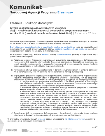Erasmus+ Edukacja dorosłych: Wyniki konkursu wniosków złożonych w ramach akcji 1 - Mobilność kadry edukacji dorosłych w programie Erasmus+ w roku 2014 (termin składania wniosków: 24.03.2014) | 2 czerwca 2014 r. Narodowa Agencja Programu Erasmus+ ogłasza wyniki konkursu wniosków złożonych w terminie do 24 marca 2014 r. w akcji 1 – Mobilność kadry edukacji dorosłych. Indywidualne powiadomienia o wynikach konkursu wniosków, wraz ze szczegółowymi informacjami na temat przeprowadzonej oceny, zostaną wysłane drogą mailową na adresy wnioskodawców podane we wniosku o dofinansowanie. W przypadku organizacji, których wnioski zostały zatwierdzone, prosimy o zapoznanie się z poniższymi informacjami: 1) Podpisanie umowy finansowej gwarantującej przyznanie zaakceptowanego dofinansowania może poprzedzić badanie wiarygodności finansowo-operacyjnej. Szczegółowe informacje na temat sposobu postępowania w przypadku konieczności przeprowadzenia takiego badania zostaną przekazane w indywidualnych powiadomieniach. 2) Płatności zaliczkowe zostaną zrealizowane w terminie gwarantowanym w umowie pomiędzy NA a beneficjentem, o ile NA otrzyma na ten cel środki z Komisji Europejskiej. 3) W przypadku projektów angażujących Kraje Programu spoza UE (Turcja i Była Jugosłowiańska Republika Macedonii), których udział w programie Erasmus+ uzależniony jest od podpisania przez każde z państw porozumienia z Komisją Europejską, przyjmuje się następujące zasady: - Decyzja dotycząca przyznania dofinansowania z udziałem partnerów z tych krajów ma charakter warunkowy i wejdzie w życie w momencie zakończenia formalnego procesu przystępowania tych państw do programu Erasmus+. - Narodowa Agencja podejmie ostateczną decyzję odnośnie projektów z udziałem Krajów Programu spoza UE najpóźniej 30.06.2014. - Jeżeli do tego czasu nie zakończy się formalny proces przystąpienia do programu Erasmus+ Krajów Programu spoza Unii Europejskiej projekty z udziałem partnerów z Kraju Programu spoza UE, umieszczone na liście do zatwierdzenia oraz na liście rezerwowej, zostaną rozpatrzone według następujących zasad: w sytuacji, kiedy projekt zakłada więcej działań angażujących innych partnerów, a wykluczenie partnerów z Krajów Programu spoza UE i działań z ich udziałem nie powoduje znaczącej zmiany jakościowej i formalnej w projekcie, projekt taki może być nadal dofinansowany. W umowie finansowej zawarta zostanie klauzula dotycząca braku możliwości finansowania działań z udziałem Krajów Programu spoza UE, a budżet zostanie adekwatnie zredukowany o nienależne dofinansowanie. 4) Organizacje, którym przyznano dofinansowanie - beneficjenci - otrzymają drogą mailową informacje o dalszych krokach związanych z zawarciem umowy finansowej. W przypadku organizacji, których wnioski zostały umieszczone na liście rezerwowej, prosimy o zapoznanie się z poniższymi informacjami: str. 1/7 Narodowa Agencja Programu Erasmus+ Dokument dostępny na: www.erasmusplus.org.pl/dokumenty 1) Wnioski umieszczone na liście rezerwowej mają szansę na zatwierdzenie do realizacji w miarę sukcesywnego uwalniania się dostępnych środków finansowych dla sektora Edukacja dorosłych. Wnioski z listy rezerwowej są kierowane do realizacji wg kolejności na liście rezerwowej. W przypadku uzyskania środków finansowych Narodowa Agencja niezwłocznie poinformuje o zaistniałej sytuacji. 2) Decyzje w tej sprawie mogą być podejmowane najpóźniej do 31.12.2014. Wyniki konkursu wniosków złożonych w ramach akcji 1 – Mobilność kadry edukacji dorosłych w programie Erasmus+ w roku 2014 Pozycja na liście rankingowej Numer wniosku Nazwa organizacji 1 2014-1-PL01KA104-001664 2 2014-1-PL01KA104-001765 3 2014-1-PL01KA104-001398 Ośrodek Języków Obcych Perfect 4 2014-1-PL01KA104-001985 Europejskie Forum Młodzieży 5 2014-1-PL01KA104-001984 Stowarzyszenie Lokalna Grupa Działania "Nad Białą Przemszą" 6 7 8 2014-1-PL01KA104-001203 2014-1-PL01KA104-001823 2014-1-PL01KA104-001988 9 2014-1-PL01KA104-000310 10 2014-1-PL01KA104-000804 11 2014-1-PL01KA104-001978 12 13 14 2014-1-PL01KA104-001982 2014-1-PL01KA104-001345 2014-1-PL01KA104-001802 Stowarzyszenie Bona Fides SPEAK EUROPE Language Club M.Kośnik i A.Pawłowska Sp.j. Fundacja MaMa Fundacja Gaudete Fundacja Family Center Stowarzyszenie Akademia Pełni Życia im. Joanny Boehnert Centrum Przedsiębiorczości i Innowacji Stowarzyszenie Instytut Nowych Technologii Globalnet sp. z o.o. Eduprofesja s.c. Polska Fundacja Ośrodków Wspomagania Rozwoju Gospodarczego OIC POLAND Adres organizacji Przyznane dofinanso wanie (EUR) Decyzja ul. Warszawska 19 40-009 Katowice 8 706,00 Zatwierdzony ul. Krakowskie Przedmieście 62/1 00-322 Warszawa 31 927,00 Zatwierdzony 14 618,00 Zatwierdzony 24 473,00 Zatwierdzony 33 228,00 Zatwierdzony 48 134,00 Zatwierdzony 12 590,00 Zatwierdzony 9 040,00 Zatwierdzony ul. Lea 5a/2 30-046 Kraków 15 589,00 Zatwierdzony ul. Chabrowa 8 22-400 Zamość 28 816,00 Zatwierdzony ul. Sienkiewicza 55 90-009 Łódź 59 584,00 Zatwierdzony 31 823,00 Zatwierdzony 23 084,00 Zatwierdzony 9 540,00 Zatwierdzony ul. Osadnicza 20 96-321 Kaleń Towarzystwo gm. Żabia Wola ul. Plac Wolności 5/5 57-500 Bystrzyca Kłodzka ul. Partyzantów 1 32-310 Klucze ul. Wilcza 27b 00-544 Warszawa ul. Pocztowa 9 40-001 Katowice ul. Jainty 18/1 41-902 Bytom ul. Ratajczaka 20/18 61-815 Poznań al. Wolności 22b lok. 10 42-200 Częstochowa ul. Gospodarcza 26 20-213 Lublin str. 2/7 Narodowa Agencja Programu Erasmus+ Dokument dostępny na: www.erasmusplus.org.pl/dokumenty 15 2014-1-PL01KA104-001816 Fundacja Wspierania Organizacji Pozarządowych "UMBRELLA" ul. Legnicka 65 54-206 Wrocław 23 202,00 Zatwierdzony 16 2014-1-PL01KA104-001369 Fundacja Synapsis ul. Ondraszka 3 02-085 Warszawa 15 965,00 Zatwierdzony 17 2014-1-PL01KA104-001383 ul. Kasprowicza 9a/1 31-523 Kraków 19 815,00 Zatwierdzony 20 938,00 Zatwierdzony 18 770,00 Zatwierdzon