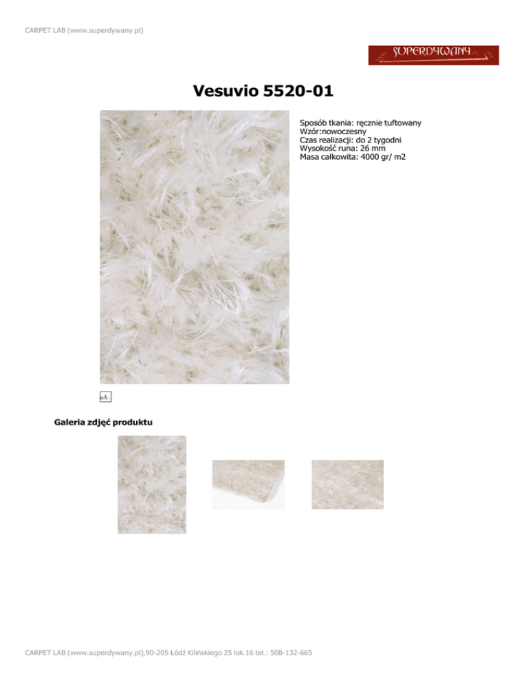CARPET LAB (www.superdywany.pl) Vesuvio 5520-01 Sposób tkania: ręcznie tuftowany Wzór:nowoczesny Czas realizacji: do 2 tygodni Wysokość runa: 26 mm Masa całkowita: 4000 gr/ m2 nowoÅÄ Galeria zdjęć produktu CARPET LAB (www.superdywany.pl),90-205 Łódź Kilińskiego 25 lok.16 tel.: 508-132-665