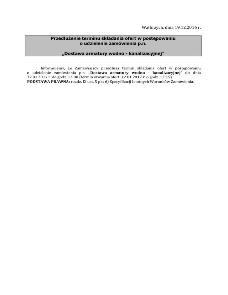 Wałbrzych, dnia 19.12.2016 r. Przedłużenie terminu składania ofert w postępowaniu o udzielenie zamówienia p.n. „Dostawa armatury wodno - kanalizacyjnej” Informujemy, że Zamawiający przedłuża termin składania ofert w postępowaniu o udzielenie zamówienia p.n. „Dostawa armatury wodno - kanalizacyjnej” do dnia 12.01.2017 r. do godz. 12:00 (termin otwarcia ofert: 12.01.2017 r. o godz. 12:15). PODSTAWA PRAWNA: rozdz. IX ust. 5 pkt 6) Specyfikacji Istotnych Warunków Zamówienia.