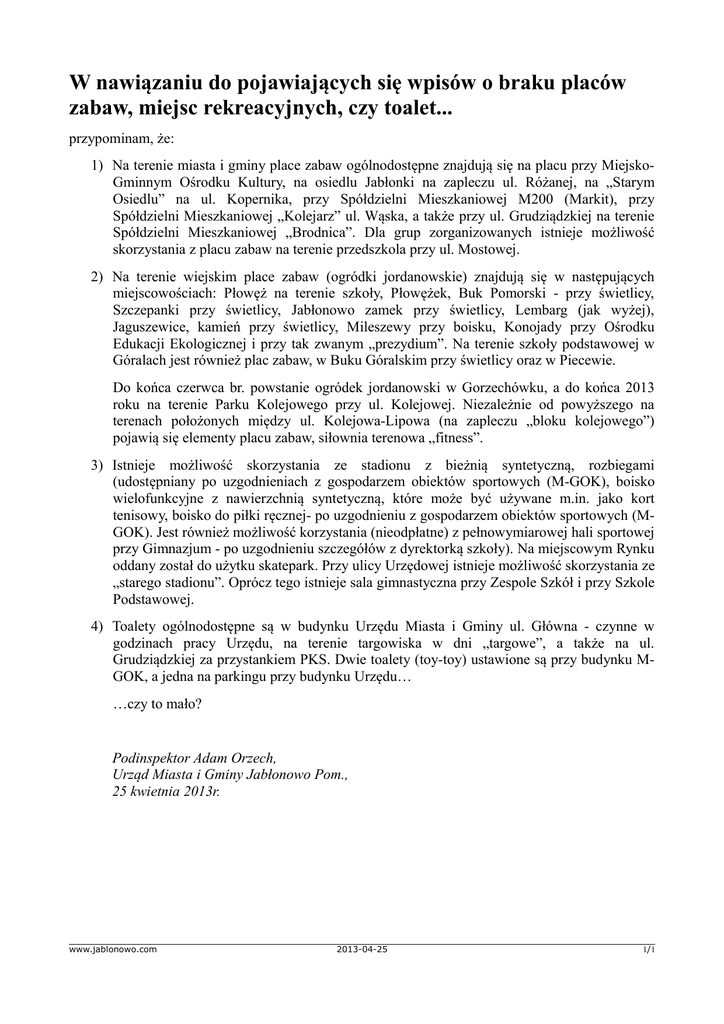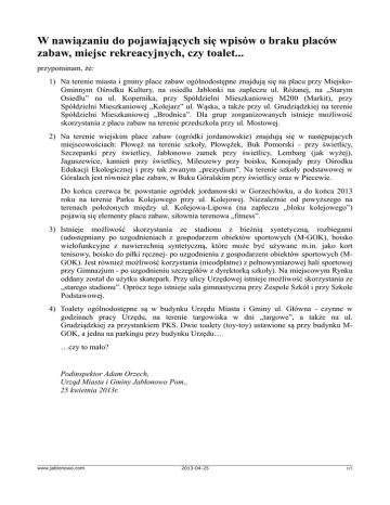 W nawiązaniu do pojawiających się wpisów o braku placów zabaw, miejsc rekreacyjnych, czy toalet... przypominam, że: 1) Na terenie miasta i gminy place zabaw ogólnodostępne znajdują się na placu przy MiejskoGminnym Ośrodku Kultury, na osiedlu Jabłonki na zapleczu ul. Różanej, na „Starym Osiedlu” na ul. Kopernika, przy Spółdzielni Mieszkaniowej M200 (Markit), przy Spółdzielni Mieszkaniowej „Kolejarz” ul. Wąska, a także przy ul. Grudziądzkiej na terenie Spółdzielni Mieszkaniowej „Brodnica”. Dla grup zorganizowanych istnieje możliwość skorzystania z placu zabaw na terenie przedszkola przy ul. Mostowej. 2) Na terenie wiejskim place zabaw (ogródki jordanowskie) znajdują się w następujących miejscowościach: Płowęż na terenie szkoły, Płowężek, Buk Pomorski - przy świetlicy, Szczepanki przy świetlicy, Jabłonowo zamek przy świetlicy, Lembarg (jak wyżej), Jaguszewice, kamień przy świetlicy, Mileszewy przy boisku, Konojady przy Ośrodku Edukacji Ekologicznej i przy tak zwanym „prezydium”. Na terenie szkoły podstawowej w Góralach jest również plac zabaw, w Buku Góralskim przy świetlicy oraz w Piecewie. Do końca czerwca br. powstanie ogródek jordanowski w Gorzechówku, a do końca 2013 roku na terenie Parku Kolejowego przy ul. Kolejowej. Niezależnie od powyższego na terenach położonych między ul. Kolejowa-Lipowa (na zapleczu „bloku kolejowego”) pojawią się elementy placu zabaw, siłownia terenowa „fitness”. 3) Istnieje możliwość skorzystania ze stadionu z bieżnią syntetyczną, rozbiegami (udostępniany po uzgodnieniach z gospodarzem obiektów sportowych (M-GOK), boisko wielofunkcyjne z nawierzchnią syntetyczną, które może być używane m.in. jako kort tenisowy, boisko do piłki ręcznej- po uzgodnieniu z gospodarzem obiektów sportowych (MGOK). Jest również możliwość korzystania (nieodpłatne) z pełnowymiarowej hali sportowej przy Gimnazjum - po uzgodnieniu szczegółów z dyrektorką szkoły). Na miejscowym Rynku oddany został do użytku skatepark. Przy ulicy Urzędowej istnieje możliwość skorzystania ze „starego stadionu”. Oprócz tego istnieje sala gimnastyczna przy Zespole Szkół i przy Szkole Podstawowej. 4) Toalety ogólnodostępne są w budynku Urzędu Miasta i Gminy ul. Główna - czynne w godzinach pracy Urzędu, na terenie targowiska w dni „targowe”, a także na ul. Grudziądzkiej za przystankiem PKS. Dwie toalety (toy-toy) ustawione są przy budynku MGOK, a jedna na parkingu przy budynku Urzędu… …czy to mało? Podinspektor Adam Orzech, Urząd Miasta i Gminy Jabłonowo Pom., 25 kwietnia 2013r. www.jablonowo.com 2013-04-25 1/1