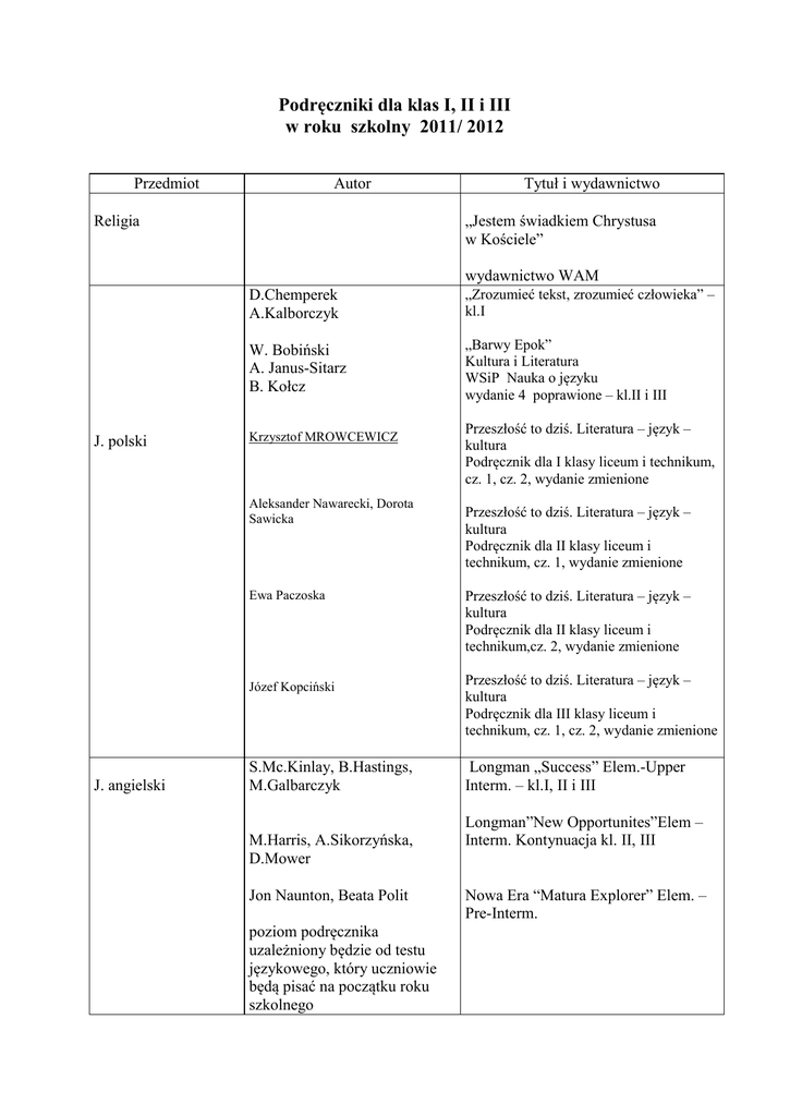 Podręczniki dla klas I, II i III w roku szkolny 2011/ 2012 Przedmiot Autor Tytuł i wydawnictwo „Jestem świadkiem Chrystusa w Kościele” Religia wydawnictwo WAM J. polski D.Chemperek A.Kalborczyk „Zrozumieć tekst, zrozumieć człowieka” – kl.I W. Bobiński A. Janus-Sitarz B. Kołcz „Barwy Epok” Kultura i Literatura WSiP Nauka o języku wydanie 4 poprawione – kl.II i III Krzysztof MROWCEWICZ Aleksander Nawarecki, Dorota Sawicka Przeszłość to dziś. Literatura – język – kultura Podręcznik dla II klasy liceum i technikum, cz. 1, wydanie zmienione Ewa Paczoska Przeszłość to dziś. Literatura – język – kultura Podręcznik dla II klasy liceum i technikum,cz. 2, wydanie zmienione Józef Kopciński J. angielski Przeszłość to dziś. Literatura – język – kultura Podręcznik dla I klasy liceum i technikum, cz. 1, cz. 2, wydanie zmienione S.Mc.Kinlay, B.Hastings, M.Galbarczyk M.Harris, A.Sikorzyńska, D.Mower Jon Naunton, Beata Polit poziom podręcznika uzależniony będzie od testu językowego, który uczniowie będą pisać na początku roku szkolnego Przeszłość to dziś. Literatura – język – kultura Podręcznik dla III klasy liceum i technikum, cz. 1, cz. 2, wydanie zmienione Longman „Success” Elem.-Upper Interm. – kl.I, II i III Longman”New Opportunites”Elem – Interm. Kontynuacja kl. II, III Nowa Era “Matura Explorer” Elem. – Pre-Interm. J. francuski kl.I Grażyna Migdalska C.Billard-Woźniak M.Szczucka-Smagowicz kl.II j/w +A.Ratuszyniak Historia Wiedza o społeczeństwie Wiedza o kulturze “Déjà vu 2” podr.+ ćwicz. Wydawnictwo Szkolne PWN Georgio Motta B.Ćwikowska “Déjà vu 3” podr.+ ćwicz. Wydawnictwo Szkolne PWN kl.I Direkt NEU 1A, 1B Lektor Klett wydanie z 2011 Georgio Motta B.Ćwikowska kl.II Direkt 2A, 2B Lektor Klett K.Łuniewska U.Tworek Bogumiła Burda Bohdan Halczak Roman Maciej Józefiak Małgorzata Szymczak kl.III Alles Klar 2b, 3 – WSiP zakres podstawowy Historia 1 cz.I i cz.II Historia 2 – czasy nowożytne Historia 3 – czasy nowożytne wydawnictwo Operon zakres podstawowy i rozszerzony Z.Smutek J.Maleska B.Surmacz „Wiedza o społeczeństwie” - zakres rozszerzony cz.I i II Wydawnictwo Operon Z.Majchrowski K.Mrocewicz P.Sitarski D.Szwarcman „Człowiek-twórca kultury” podręcznik dla liceum i technikum poziom podstawowy i rozszerzony kl.III j/w J. niemiecki “Déjà vu 1” podr.+ ćwicz. Wydawnictwo Szkolne PWN Wydawnictwo Stentor Matematyka W.Babiański L.Chańko D.Ponczek Matematyka Kształcenie ogólne w zakresie podstawowym i rozszerzonym (podręcznik + zeszyt ćwiczeń) Wydawnictwo Nowa Era Wydania opatrzona znakiem Nowa podstawa Fizyka i astronomia B.Sagnowska Fizyka i astronomia dla każdego wyd.Zamkor poziom podstawowy pod.red.J.Salach 1a,2a Fizyka dla szkół ponadgimn. wyd. Zamkor „Kurs podstawowy z elem. kursu rozszerz Chemia 3b zakres rozszerzony z fizyki S.Hejwowska R.Marcinkowski J.Staluszka Zamkor „Wybieram Fizykę” Poziom podstawowy: W.Lewinski, J.Prokop G.Skirmuntt, J.Walkiewicz Biologia 1 zakres podstawowy Wyd.Operon Poziom rozszerzony: J.Balerstet W.Lewiński i inni Biologia 1 – zakres rozszerzony Wyd.Operon Poziom podstawowy W.Kosakowski, W.Kowalik, E.Zastrożna, kl.I „System przyrodniczy Ziemi”cz.I Wydawnictwo SOP- Toruń Ia, Ib,Ic,Id, Ie – Chemia 1 – zakres podstawowy Wydawnictwo Operon Biologia kl.II- „Człowiek gospodarzem przestrzeni geogr”” Wydawnictwo SOP-Toruń A.Stark,G.Wnuk, A.Zimończyk kl.III – „Świat w fazie przemian” wyd.SOP-Toruń T.Krynicka, G.Wnuk, Z.Wątkowicz Geografia Poziom rozszerzony: D.Grudzińska, W.Kowalik, T.Taszecka kl.I „Świat i Polska – środowisko przyrodnicze wyd.SOP Toruń kl.II i III „Świat i Poklska.System Społ. – gosp.” Wyd.SOP Toruń Podstawy przedsiębiorczości CEO – praca zbiorowa Tomasz Merta Alicja Pacewicz „ Z ekonomią na Ty” Technologia informacyjna E.Gurbiel G.Hardt – Olejniczak E.Kołczyk H.Krupicka M.Sysło Technologia Informacyjna (podręcznik + CD) WSiP – kształcenie w zakresie podstawowym Informatyka E.Gorbiel G.Hardt – Olejniczak E.Kołczyk M.Sysło 1a. 2a,3a,3b Informatyka w zakresie rozszerzonym WSiP Przysposobienie obronne M.Goniewicz A.W.Nowak Z.Smutek Kl.I i II Przysposobienie Obronne cz.I Przysposobienie Obronne cz.II wyd. Operon Uczniowie klas pierwszych! Wykaz obowiązujących podręczników zostanie zamieszczony na drzwiach szkoły po 25 czerwca 2011