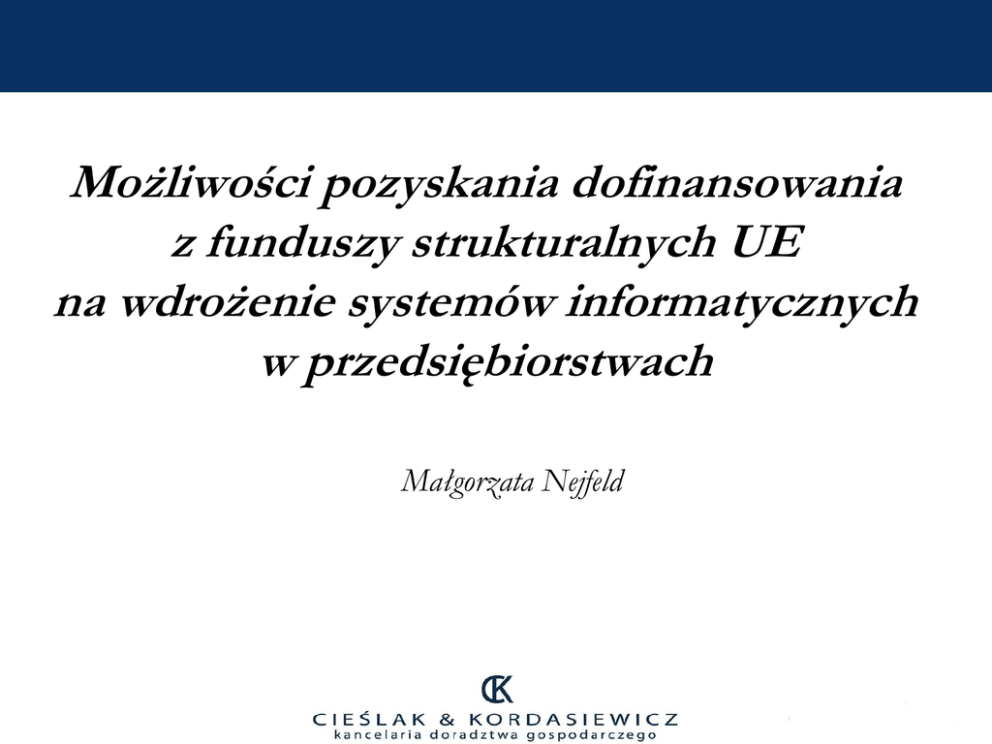 Możliwości pozyskania dofinansowania z funduszy strukturalnych UE na wdrożenie systemów informatycznych w przedsiębiorstwach Małgorzata Nejfeld KDG CIEŚLAK & KORDASIEWICZ – ZAKRES DZIAŁALNOŚCI Główny przedmiot działalności: doradztwo w zakresie pozyskiwania zewnętrznych źródeł dofinansowania, w szczególności funduszy unijnych. Doradztwo prawne oraz partnerstwo publiczno – prywatne. Współpraca z przedsiębiorstwami wdrażającymi innowacyjne systemy informatyczne oraz nowoczesne technologie ICT. Główni klienci: Instytut Turystyki, Instytut Hematologii i Transfuzjologii, Instytut Fizjologii i Patologii Słuchu, Szpital Bródnowski, SP ZOZ Wola, Instytut Lotnictwa, Akademia Wychowania Fizycznego w Warszawie, Odmet S.A, POLFER S.A., Multimed Sp. z o.o., Supersklepy.pl sp. z o.o., Ministerstwo Gospodarki, Ministerstwo Rozwoju Regionalnego, Ministerstwo Sportu i Turystyki, Polska Agencja Rozwoju Przedsiębiorczości. Postępy w realizacji NSRO 2007-2013 Stan na dzień 17.05.2015 r.: • Liczba złożonych wniosków o dofinansowanie (poprawnych formalnie): 301,7 tys. • Podpisanych umów o dofinansowanie: 106 029 na kwotę 410,4 mld pln, co stanowi 102,6 % alokacji na lata 2007-2013 • Źródło: www.mir.gov.pl/ Fundusze Europejskie RODZAJE PROJEKTÓW IT REALIZOWANYCH W LATACH 2007 - 2013 Dofinansowanie działań na klasyczną informatyzację firmy – wprowadzenie systemów do zarządzania, CRM oraz zakup sprzętu Dofinansowanie e-usług Informatyzacja jako część inwestycji Dofinansowanie współpracy B2B Projekty B + R Polityka spójności – podział alokacji pomiędzy obszary Udziały 2007-2013 Udziały 2014-2020 Innowacje 13,90% 14,70% 2. Technologie ICT 5,30% 5,31% 3. MŚP, sektor rolny, sektor rybołówstwa 3,20% 6,25% 4. Gospodarka niskoemisyjna 2,10% 10,29% 5. Zmiany klimatu 1,40% 0,86% 6. Ochrona środowiska, zrównoważony rozwój 12,20% 8,38% 7. Transport 39,10% 31,95% 8. Wspieranie zatrudnienia 6,10% 6,67% 9. Wspieranie włączenia społ., walka z ubóstwem 6,00% 7,83% 10. Umiejętności, edukacja 8,20% 5,01% 11. Administracja, potencjał instytucjonalny 0,7% 0,28% Lp. Cele tematyczne 1. PERSPEKTYWA 2014 - 2020 ALOKACJA OGÓŁEM NA LATA 2014-2020 82,5 mld euro POLITYKA SPÓJNOŚCI 1.PO Infrastruktura i Środowisko 2.PO Inteligentny Rozwój 3.PO Polska Cyfrowa 4.PO Wiedza Edukacja Rozwój 5.PO Polska Wschodnia 6.Europejska Współpraca Terytorialna 7.Regionalne programy operacyjne (15 + Mazowsze) WSPÓLNA POLITYKA ROLNA 1.Program Rozwoju Obszarów Wiejskich PO POLSKA CYFROWA • Alokacja ogółem: 2,17 mld euro • Cel główny: wzmocnienie cyfrowych fundamentów dla społecznogospodarczego rozwoju gospodarczego rozwoju kraju. Zgodnie z Umową Partnerstwa, jako fundamenty przyjęto: szeroki dostęp do szybkiego Internetu, efektywne i przyjazne użytkownikom e-usługi publiczne oraz stale rosnący poziom kompetencji cyfrowych społeczeństwa. • Beneficjenci: jednostki administracji rządowej oraz jednostki im podległe, jednostki naukowe, państwowe organizacje kultury, organizacje pozarządowe, przedsiębiorstwa telekomunikacyjne. • Obszary wsparcia – powszechny dostęp do szybkiego Internetu 1 020,22 mln euro – e-administracja i otwarty rząd 949,60 mln euro – cyfrowa aktywizacja społeczeństwa 135 mln euro PODSTAWOWE INFORMACJE DOTYCZĄCE RPO 1. Alokacja na rpo ogółem 31,28 mld euro 2. Decentralizacja zarządzania funduszami – więcej środków dla regionów; samorządy województw będą zarządzać ok. 40% funduszy polityki spójności 3. Nowość: dwufunduszowe programy tj. finansowane z EFRR oraz EFS PROGRAMY REGIONALNE ALOKACJA WOJEWÓDZTWO EURO 1 Dolnośląskie 2 252 546 589 2 Kujawsko-Pomorskie 1 903 540 287 3 Lubelskie 2 230 958 174 4 Lubuskie 906 929 693 5 Łódzkie 2 256 049 115 6 Małopolskie 2 878 215 972 7 Opolskie 8 Podkarpackie 2 114 243 760 9 Podlaskie 1 213 595 877 10 Pomorskie 1 864 811 698 11 Śląskie 3 476 937 134 12 Świętokrzyskie 1 364 543 593 13 Warmińsko-Mazurskie 1 728 272 095 14 Wielkopolskie 2 450 206 417 15 Zachodniopomorskie 1 601 239 216 16 Mazowieckie 2 089 840 138 944 967 792 RPO MAZOWSZE • • • • • • • • • • OP I Wykorzystanie działalności badawczo-rozwojowej OP II Wzrost e-potencjału Mazowsza OP III Rozwój potencjału innowacyjnego i przedsiębiorczości OP IV Przejście na gospodarkę niskoemisyjną OP V Gospodarka przyjazna środowisku OP VI Jakość życia OP VII Rozwój regionalnego systemu transportowego OP VIII Rozwój rynku pracy OP IX Wspieranie włączenia społecznego i walka z ubóstwem OP X Edukacja dla rozwoju regionu Źródła informacji o funduszach • mir.gov.pl • funduszeeuropejskie.gov.pl • Centrum Projektów Europejskich – Centralny Punkt Informacyjny (cpe.gov.pl/cpi) DZIĘKUJĘ ZA UWAGĘ www.kdg.waw.pl