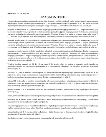 Sygn. akt III Ca 257/16 UZASADNIENIE Postanowieniem z dnia 29 października 2015r. Sąd Rejonowy w Skierniewicach zniósł współwłasność nieruchomości obejmującej działkę ewidencyjną oznaczoną nr (...) o powierzchni 0,6132 ha położoną w S., dla której w Sądzie Rejonowym w Skierniewicach prowadzona jest księga wieczysta (...) o wartości 278.700 zł w ten sposób, że: przyznał na własność M. K. (1) nieruchomość obejmującą działkę ewidencyjną oznaczoną nr (...) o powierzchni 0,1523 ha o wartości 205.800 zł, w granicach i położeniu jak na sporządzonej przez biegłego geodetę M. C. mapie, obejmującej wariant 2 podziału nieruchomości, zarejestrowanej w Urzędzie Miasta S. w dniu 14 stycznia 2015 roku za nr P. (...).2015.19, znajdującej się na k. 882 akt sprawy, stanowiącej integralną część niniejszego orzeczenia (pkt 1 lit. a), przyznał na własność Z. K. nieruchomość obejmującą działkę ewidencyjną oznaczoną nr (...) o powierzchni 0,4319 ha o wartości 58.800 zł, w granicach i położeniu jak na sporządzonej przez biegłego geodetę M. C. mapie, obejmującej wariant 2 podziału nieruchomości, zarejestrowanej w Urzędzie Miasta S. w dniu 14 stycznia 2015 roku za nr P. (...).2015.19, znajdującej się na k. 882 akt sprawy, stanowiącej integralną część niniejszego orzeczenia (pkt 1 lit. b), przyznał na współwłasność M. K. (1) oraz Z. K. w udziałach po ½ części nieruchomość obejmującą działkę ewidencyjną oznaczoną nr (...) o powierzchni 0,0290 ha o wartości 14.100 zł, w granicach i położeniu jak na sporządzonej przez biegłego geodetę M. C. mapie, obejmującej wariant 2 podziału nieruchomości, zarejestrowanej w Urzędzie Miasta S. w dniu 14 stycznia 2015 roku za nr P. (...).2015.19, znajdującej się na k. 882 akt sprawy, stanowiącej integralną część niniejszego orzeczenia (pkt 1 lit. c). Tytułem dopłaty zasądził od M. K. (1) na rzecz Z. K. kwotę 3.825 zł, płatną w terminie trzech tygodni od uprawomocnienia się niniejszego postanowienia, z ustawowymi odsetkami na wypadek uchybienia terminowi płatności (pkt 2), nakazał Z. K., aby w terminie trzech tygodni od uprawomocnienia się niniejszego postanowienia wydał M. K. (1) zajmowane przez niego pomieszczenia na parterze budynku mieszkalnego oraz zajmowaną przez niego piwnicę w budynku gospodarczym, mieszczącym się na działce ewidencyjnej nr (...) (pkt 3), nakazał M. K. (1), aby w terminie trzech tygodni od uprawomocnienia się niniejszego postanowienia wydała Z. K. zajmowane przez nią pomieszczenia, znajdujące się na działce ewidencyjnej nr (...), tj. garaż, garaż dwudrzwiowy z płyty pilśniowej, budynek gospodarczy (pkt 4), oddalił wniosek Z. K. o rozliczenie nakładów na nieruchomość oraz o naprawienie szkody wynikłej ze zniszczenia upraw (pkt 5), orzekł, że wnioskodawczyni i uczestnik ponoszą koszty postępowania związane ze swoim udziałem w sprawie (pkt 6), pobrał od M. K. (1) na rzecz Skarbu Państwa – Sądu Rejonowego w Skierniewicach kwotę 11.934,19 zł tytułem nieuiszczonych przez nią kosztów sądowych (pkt 7), nakazał ściągnąć od Z. K. na rzecz Skarbu Państwa – Sądu Rejonowego w Skierniewicach – z roszczenia zasądzonego w pkt 2 postanowienia kwotę 3.825 zł tytułem nieuiszczonych przez niego kosztów sądowych (pkt 8), nakazał pobrać od Z. K. na rzecz Skarbu Państwa – Sądu Rejonowego w Skierniewicach kwotę 9.177,48 zł tytułem nieuiszczonych kosztów sądowych (pkt 9). Sąd Rejonowy oparł swoje rozstrzygnięcie na następujących ustaleniach faktycznych: nieruchomość objęta wnioskiem położona jest w S. przy ul. (...). Składa się z działki ewidencyjnej nr (...), o powierzchni 0,6132 ha i jest zapisana w Sądzie Rejonowym w Skierniewicach w księdze wieczystej nr (...). Wartość nieruchomości wynosi 278.700 zł. Zgodnie z miejscowym planem zagospodarowania przestrzennego nieruchomość objęta wnioskiem położona jest w części na terenach przeznaczonych pod zabudowę mieszkaniową jednorodzinną z usługami, zaś w części za linią szklarni - na terenach przeznaczonych pod rolnictwo – uprawy polowe z zakazem realizacji budynków. Nieruchomość w chwili złożenia wniosku o zniesienie współwłasności stanowiła współwłasność wnioskodawczyni M. K. (1) w udziale ½ części na podstawie umowy darowizny z dnia 24 listopada 2000r. i uczestników G. R. oraz Z. K. w udziałach po ¼ części. W toku postępowania G. R. darowała M. K. (1) udział ¼ części w prawie własności wskazanej nieruchomości. Obecnie zamieszkuje w niej wnioskodawczyni M. K. (1) wspólnie z córką i wnukami. M. K. (1) utrzymuje się z renty rodzinnej w wysokości 1.200 zł netto miesięcznie. Nie ma żadnych oszczędności. Uczestnik postępowania Z. K. korzysta z dwóch pomieszczeń w budynku mieszkalnym, które znajdują się na parterze budynku. Uczestnik postępowania mieszka w W.. Utrzymuje się z emerytury w wysokości 2.550 zł miesięcznie i prowadzi gospodarstwo domowe samodzielnie. Nadto, uczestnik osiąga dochód z prowadzonych na objętej wnioskiem nieruchomości upraw, którego wysokości nie jest w stanie oszacować. W latach 1978 – 1982 uczestnik Z. K. poczynił na objętą wnioskiem nieruchomość nakłady w postaci: wybudowania dwóch szklarni o powierzchni zabudowy 368 m2, a także służących do ich obsługi kotłowni, instalacji wodociągowej i centralnego ogrzewania, instalacji elektrycznej, drenażu i odwodnienia kotłowni, podwórka i piwnicy. W dniu 25 lutego 1981 roku Prezydent Miasta S. wydał decyzję o pozwoleniu Z. K. na użytkowanie dwóch szklarni wzniesionych na objętej wnioskiem nieruchomości bez wymaganego przepisami pozwolenia na budowę. Opłatę skarbową od tej decyzji w wysokości 12.000 zł uiścił Z. K.. Nakłady te nie przestawiają żadnej wartości rynkowej wobec ich złego stanu technicznego i obniżają wartość nieruchomości. Wykorz