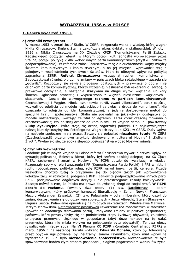 WYDARZENIA 1956 r. w POLSCE 1. Geneza wydarzeń 1956 r. a) czynniki zewnętrzne: W marcu 1953 r. zmarł Józef Stalin. W ZSRR rozgorzała walka o władzę, którą wygrał Nikita Chruszczow. Śmierć Stalina zakończyła okres dyktatury stalinowskiej. W lutym 1956 r. Nikita Chruszczow na XX Zjeździe KPZR (Komunistycznej Partii Związku Radzieckiego) odczytał referat, w którym potępił kult jednostki wprowadzony przez Stalina, potępił politykę ZSRR wobec innych partii komunistycznych (czystki i całkowite podporządkowanie). W referacie zniósł Chruszczow tezę o nieuchronności wojny między światem komunistycznym i kapitalistycznym, a na jej miejsce wprowadził tezę o pokojowym współistnieniu tych dwóch światów. Miało to olbrzymi wpływ na politykę zagraniczną ZSRR. Referat Chruszczowa wstrząsnął ruchem komunistycznym. Zapoczątkował równieŜ olbrzymie zmiany w państwach bloku radzieckiego – zaczęła się „odwilŜ”. Rozpoczęły się rewizje procesów politycznych – przywracano dobre imię członkom partii komunistycznej, którzy wcześniej niesłusznie byli oskarŜani o zdradę, o prawicowe odchylenia, a następnie skazywani na długie wyroki więzienia lub kary śmierci. Ogłoszono amnestię i wypuszczono z więzień niesłusznie uwięzionych i skazanych. Doszło do wewnętrznego rozłamu w partiach komunistycznych Czechosłowacji i Węgier. Młodzi członkowie partii, zwani „liberałami”, coraz częściej wzywali do odejścia od modelu radzieckiego i za „własną drogą do komunizmu”. Nie oznaczało to odejścia od idei komunistycznej, a jedynie dostosowanie metod do specyfiki kraju i społeczeństwa. Stalin nie pozwalał na jakiekolwiek odstępstwa od modelu radzieckiego, uwaŜając Ŝe zdał on egzamin. Teraz coraz częściej mówiono o czechosłowackiej czy polskiej drodze do komunizmu. W krajach demoludu powstawały kluby dyskusyjne, które stają się areną zagorzałej polityki. Do najsławniejszych naleŜą klub dyskusyjny im. Petofiego na Węgrzech czy klub K231 w CSRS. DuŜy wpływ na nastroje społeczne miała prasa. Zaczęły się pojawiać niezaleŜne tytuły. W CSRS (Czechosłowacji) przełomowe artykuły drukowano w „Literarni Noviny” i „Kulturni śivoti”. Wydawało się, ze epoka ślepego posłuszeństwa wobec Moskwy minęła. b) czynniki wewnętrzne: Podobnie jak w innych krajach w Polsce referat Chruszczowa wywarł olbrzymi wpływ na sytuację polityczną. Bolesław Bierut, który był szefem polskiej delegacji na XX Zjazd KPZR, zachorował i zmarł w Moskwie. W PZPR doszło do rywalizacji o władzę. Rozgorzały spory o rolę i znaczenie KPP (Komunistyczna Partię Polski) i PPS w historii ruchu robotniczego, politykę rolną, rolę PZPR wśród innych partii, cenzurę. Przede wszystkim chodziło tutaj o przyznanie się do błędów takich jak wprowadzenie kolektywizacji w rolnictwie, potępienie KPP i całkowite podporządkowanie innych partii PZPR, podejmowanie odgórnych decyzji i nie przestrzeganie zasady kolektywności. Zaczęto mówić o tym, Ŝe Polska ma prawo do „własnej drogi do socjalizmu”. W PZPR doszło do rozłamu. Powstały dwa obozy: (1) tzw. Natolińczycy – odłam konserwatywny, który próbował hamować liberalizację – Zenon Nowak, Franciszek Mazur, Aleksander Zawadzki. (2) tzw. Puławianie – odłam liberalny, który dąŜył do zmian, dostosowanie się do oczekiwań społecznych – Jerzy Albrecht, Stefan Staszewski, Eligiusz Lasota. Puławianie opierali się na młodych sekretarzach: Władysławie Malwinie i Jerzym Morawskim. Reformatorzy postulowali utworzenie rad robotniczych w fabrykach (powrót do oddolnego sterowania partią), radykalne zmiany w polityce gospodarczej państwa, które przyczyniłyby się do podniesienia stopy Ŝyciowej obywateli, zniesienie priorytetu przemysłu cięŜkiego w gospodarce (zbyt duŜe nakłady na tę gałąź przemysłu, która nie miała wpływu na polepszenie bytu obywateli). Te dwa obozy rywalizowały między sobą. Na VI Plenum KC PZPR (Komitetu Centralnego PZPR) w marcu 1956 r. na następcę Bieruta wybrano Edwarda Ochaba, który był tolerowany przez obydwa ugrupowania, był neutralny. Innym czynnikiem, który miał wpływ na wydarzenia 1956 r. było niezadowolenie społeczeństwa. Niezadowolenie te było spowodowane bardzo złym stanem gospodarki, ciągłym pogarszaniem warunków Ŝycia. 1 Jednocześnie dowiedziano się jak Ŝyje część społeczeństwa korzystająca z licznych przywilejów zastrzeŜonych dla nielicznych przedstawicieli władzy. Było to moŜliwe dzięki Radiu „Wolna Europa”. Od września 1954 r. zaczęły do Polski docierać audycje Józefa Światły, wysokiego funkcjonariusza Ministerstwa Bezpieczeństwa Publicznego (MBP), który zbiegł na Zachód. Informował on w swoich audycjach przywilejach jakimi obdarzeni są przywódcy partii, o pełnej zaleŜności od Moskwy i o metodach bezpieki. Informacje zawarte w audycjach ukazywały dysproporcje poziomu Ŝycia w ludowym państwie, gdzie wszyscy mieli być sobie równi. śądano równieŜ ukarania zbrodniarzy okresu stalinizmu. Reformatorzy wewnątrz partii zdawali sobie sprawę z tego, Ŝe część wysokich funkcjonariuszy partii odpowiedzialnych za terror, masowe mordy, oszczerstwa, musi odejść. Na wiosnę 1956 r. nastąpiły zmiany kadrowe w PZPR: aresztowano gen. Romkowskiego, płk. RóŜańskiego, odwołano ministra sprawiedliwości Światkowskiego, prokuratora generalnego Kalinowskiego i naczelnego prokuratora wojskowego Zarakowskiego. Z rządu usunięto Radkiewicza, ustąpił Jakub Berman. Zredukowano liczbę urzędników UB (Urzędu Bezpieczeństwa). Jak widać „odwilŜ” dotknęła równieŜ członków partii i najwyŜsze władze państwowe. W kwietniu 1956 r. ogłoszono amnestię. Objęła ona prawie 6 tysięcy osób skazanych za „przestępstwa przeciwko PRL” oraz ponad 1 tysiąc skazanych za „winy przedwojenne”. Karę śmierci zamieniono na 15 lat wi