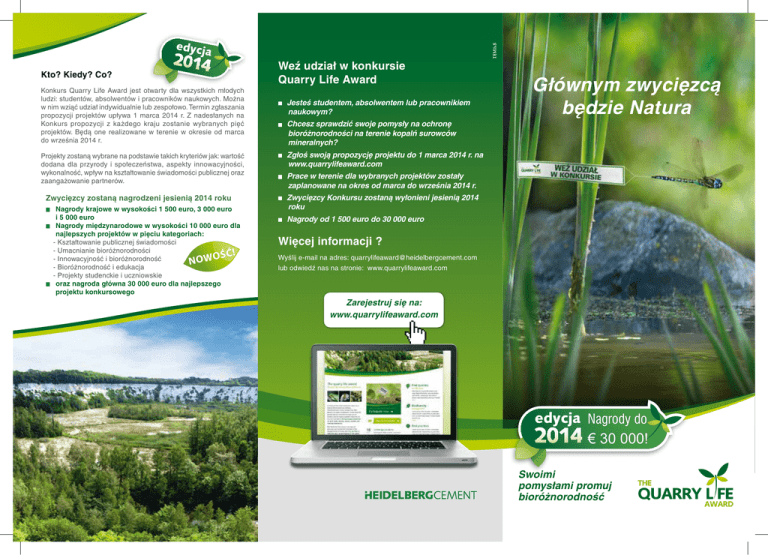 edycja Kto? Kiedy? Co? Konkurs Quarry Life Award jest otwarty dla wszystkich młodych ludzi: studentów, absolwentów i pracowników naukowych. Można w nim wziąć udział indywidualnie lub zespołowo. Termin zgłaszania propozycji projektów upływa 1 marca 2014 r. Z nadesłanych na Konkurs propozycji z każdego kraju zostanie wybranych pięć projektów. Będą one realizowane w terenie w okresie od marca do września 2014 r. Projekty zostaną wybrane na podstawie takich kryteriów jak: wartość dodana dla przyrody i społeczeństwa, aspekty innowacyjności, wykonalność, wpływ na kształtowanie świadomości publicznej oraz zaangażowanie partnerów. Zwycięzcy zostaną nagrodzeni jesienią 2014 roku Nagrody krajowe w wysokości 1 500 euro, 3 000 euro i 5 000 euro Nagrody międzynarodowe w wysokości 10 000 euro dla najlepszych projektów w pięciu kategoriach: - Kształtowanie publicznej świadomości - Umacnianie bioróżnorodności Ć! - Innowacyjność i bioróżnorodność owo Ś N - Bioróżnorodność i edukacja - Projekty studenckie i uczniowskie oraz nagroda główna 30 000 euro dla najlepszego projektu konkursowego Weź udział w konkursie Quarry Life Award Jesteś studentem, absolwentem lub pracownikiem naukowym? Głównym zwycięzcą będzie Natura Chcesz sprawdzić swoje pomysły na ochronę bioróżnorodności na terenie kopalń surowców mineralnych? Zgłoś swoją propozycję projektu do 1 marca 2014 r. na www.quarrylifeaward.com Prace w terenie dla wybranych projektów zostały zaplanowane na okres od marca do września 2014 r. Zwycięzcy Konkursu zostaną wyłonieni jesienią 2014 roku Nagrody od 1 500 euro do 30 000 euro Więcej informacji ? Wyślij e-mail na adres: [email protected] lub odwiedź nas na stronie: www.quarrylifeaward.com Zarejestruj się na: www.quarrylifeaward.com edycja Nagrody do € 30 000! Swoimi pomysłami promuj bioróżnorodność Więcej szczegółów: www.quarrylifeaward.com Wybierz kopalnię, wybierz temat Unikalne siedliska otwarte dla badań Kopalnia to wielkie bogactwo krajobrazów i naturalnych siedlisk w niewielkim stopniu zakłócanych działalnością człowieka. Jako wiodący producent cementu i kruszyw, firma HeidelbergCement angażuje się w ochronę bioróżnorodności zarówno w trakcie, jak i po zakończeniu prac wydobywczych. W ponad 1000 kamieniołomów i wyrobisk na całym świecie staramy się promować wyjątkową lokalną florę i faunę. Poprzez nasz konkurs Quarry Life Award i projekty badawcze chcemy rozwijać i umacniać wiedzę na temat wartości przyrodniczej terenów kopalnianych. Możesz nam pomóc w realizacji tego celu, biorąc udział w drugiej edycji Quarry Life Award. Potraktuj udział w naszym międzynarodowym Konkursie naukowodydaktycznym jako wyzwanie. Podziel się swoimi pomysłami dotyczącymi promocji ekologii oraz bioróżnorodności terenów górniczych. Co można zyskać? Nagrody od 1 500 do 30 000 euro, a przede wszystkim: wielkie podziękowania od samej natury! Pokaż się ze swojej najbardziej (bio)różnorodnej strony. Konkurs Quarry Life Award oferuje wyjątkową szansę, aby wprowadzić do środowiska kopalni prawdziwą wartość ekologiczną i edukacyjną. Przekonasz się o tym, analizując świetne pomysły i projekty z pierwszej edycji. Wybierz jedną z kopalni prezentowanych na stronie www.quarrylifeaward.com i stwórz dla niej autorski projekt. Pamiętaj: Twój pomysł na promocję bioróżnorodności musi koncentrować się na jednym z czterech głównych tematów: Odkryj bioróżnorodność w kopalniach Poprzez swój projekt chcesz zwiększyć stan wiedzy na temat bioróżnorodności na terenach wybranych kopalni. Bioróżnorodność i rekultywacja Twój projekt promuje bioróżnorodność w rekultywacji kopalni (ochrona przyrody, leśnictwo, rolnictwo, rekreacja, tereny mieszkaniowe...). ał w udzi cji ź e y W ej e d i g 2 Bioróżnorodność i edukacja Opracowujesz koncepcję działalności społecznej związanej z górnictwem i bioróżnorodnością (imprezy, ścieżki przyrodnicze, współpraca ze szkołami, organizacjami pozarządowymi, uniwersytetami). Ochrona bioróżnorodności w trakcie prac wydobywczych Twój projekt ma na celu optymalizację walorów bioróżnorodności kopalni w czasie trwania prac wydobywczych. Inne tematy będą brane pod uwagę w oparciu o ich znaczenie dla walorów bioróżnorodności oraz związek z naszymi spółkami i produktami. o oj e k t d r p j ó sw Zg ł o ś 2014. a c r a 1m