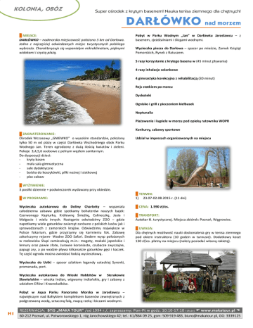 KOLONIA, OBÓZ Super ośrodek z krytym basenem! Nauka tenisa ziemnego dla chętnych! DARŁÓWKO nad morzem MIEJSCE: DARŁÓWKO – nadmorska miejscowość położona 3 km od Darłowa. Jedno z najczęściej odwiedzanych miejsc turystycznych polskiego wybrzeża. Charakteryzuje się wspaniałym mikroklimatem, pięknymi widokami i czystą plażą. Pobyt w Parku Wodnym „Jan” w Darłówku Jarosławcu – z basenem, zjeżdżalniami i ślizgami wodnymi. Wycieczka piesza do Darłowa – spacer po mieście, Zamek Książąt Pomorskich, Rynek z Ratuszem. 5 razy korzystanie z krytego basenu w (45 minut pływania) 4 razy inhalacje solankowe 4 gimnastyka korekcyjna z rehabilitacją (30 minut) Rejs statkiem po morzu Dyskoteki Ognisko i grill z pieczeniem kiełbasek Neptunalia Plażowanie i kąpiele w morzu pod opieką ratownika WOPR Konkursy, zabawy sportowe ZAKWATEROWANIE: Ośrodek Wczasowy „GNIEWKO” o wysokim standardzie, położony tylko 50 m od plaży w części Darłówka Wschodniego obok Parku Wodnego Jan. Teren ogrodzony z dużą ilością kwiatów i zieleni. Pokoje 3,4,5,6 osobowe z pełnym węzłem sanitarnym. Do dyspozycji dzieci: kryty basen mała sala gimnastyczna sale dydaktyczne boiska do koszykówki, piłki nożnej i siatkowej plac zabaw Udział w imprezach organizowanych na miejscu WYŻYWIENIE: 3 posiłki dziennie + podwieczorek wydawany przy obiedzie. W PROGRAMIE: Wycieczka autokarowa do Doliny Charlotty – wspaniała całodzienna zabawa gdzie spotkamy bohaterów naszych bajek: Czerwonego Kapturka, Królewnę Śnieżkę, Calineczkę, Jasia i Małgosie i wielu innych. Następnie odwiedzimy ZOO – gdzie napotkamy wiele gatunków zwierząt zarówno z polskich lasów jak i sprowadzanych z zamorskich krajów. Odwiedzimy największe w Polsce fokarium, gdzie przyjrzymy się karmieniu fok. Zabawę zakończymy rejsem- Wodne ZOO Safari. Siedem wysp położonych w rozlewisku Słupi zamieszkują m.in.: magoty, makaki japońskie i lemury oraz pawie złote, żurawie koroniaste, czubacze zwyczajne, papugi ary, a po wodzie pływa kilkanaście gatunków gęsi i kaczek. Tę część ogrodu można zwiedzać łodzią wycieczkową. 1) TERMIN: 23.07-02.08.2015 r. (11 dni) CENA: 1.590 zł/os. TRANSPORT: Autokar kl. turystycznej. Miejsca zbiórek: Poznań, Wągrowiec. UWAGA: Dla chętnych możliwość nauki doskonalenia gry w tenisa ziemnego pod okiem instruktora (10 godzin w turnusie). Dodatkowy koszt 130 zł/os. płatny na miejscu (należy posiadać własną rakietę). Wycieczka do Ustki – spacer szlakiem legendy usteckiej Syrenki, promenada, port. Wycieczka autokarowa do Wioski Hobbitów w Sierakowie Sławieńskim – wioska Indian, wigwamy indiańskie, gry i zabawy z udziałem Elfów i Krasnoludków. Pobyt w Aqua Parku Panorama Morska w Jarosławcu – największym nad Bałtykiem kompleksem basenów zewnętrznych z podgrzewaną wodą, sztuczną falą, rwącą rzeką i biczami wodnymi. H1 REZERWACJA: BTiS „MAKA TOUR” /od 1994 r./, zapraszamy: Pon-Pt w godz. 10:10-17:10 i dłużej  www.makatour.pl  60-212 Poznań, ul. Potworowskiego 1, róg Jarochowskiego 42; tel.: 61/864 09 25, gsm: 509 919 483, [email protected], GG: 3339125