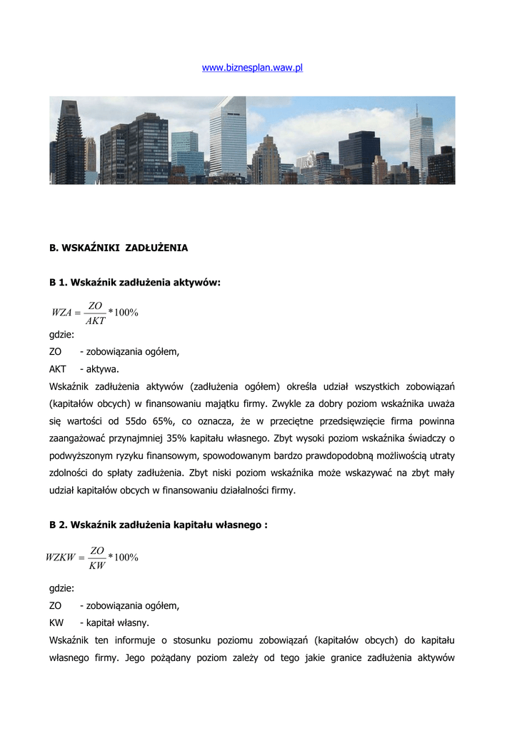 www.biznesplan.waw.pl B. WSKAŹNIKI ZADŁUŻENIA B 1. Wskaźnik zadłużenia aktywów: WZA ZO *100% AKT gdzie: ZO - zobowiązania ogółem, AKT - aktywa. Wskaźnik zadłużenia aktywów (zadłużenia ogółem) określa udział wszystkich zobowiązań (kapitałów obcych) w finansowaniu majątku firmy. Zwykle za dobry poziom wskaźnika uważa się wartości od 55do 65%, co oznacza, że w przeciętne przedsięwzięcie firma powinna zaangażować przynajmniej 35% kapitału własnego. Zbyt wysoki poziom wskaźnika świadczy o podwyższonym ryzyku finansowym, spowodowanym bardzo prawdopodobną możliwością utraty zdolności do spłaty zadłużenia. Zbyt niski poziom wskaźnika może wskazywać na zbyt mały udział kapitałów obcych w finansowaniu działalności firmy. B 2. Wskaźnik zadłużenia kapitału własnego : WZKW ZO *100% KW gdzie: ZO - zobowiązania ogółem, KW - kapitał własny. Wskaźnik ten informuje o stosunku poziomu zobowiązań (kapitałów obcych) do kapitału własnego firmy. Jego pożądany poziom zależy od tego jakie granice zadłużenia aktywów uznamy za dopuszczalne. Jeśli będą one należeć do przedziału <55 – 65%>, to pożądany poziom zadłużenia kapitału własnego powinien wynosić od 122 – 186%. B 3. Wskaźnik zadłużenia długoterminowego: WZDG ZOD *100% KW gdzie: ZO - zobowiązania długoterminowe, KW - kapitał własny. Określa on relacje między zobowiązaniami długoterminowymi, które muszą być uregulowane w okresie dłuższym niż jeden rok, do kapitału własnego. Zwykle za pożądaną wartość składnika uznaje się jego wartość do 50 – 100%. B 4. Wskaźnik pokrycia obsługi długu I: WPODI ZB ODS RATK ODS gdzie: ZB - zysk brutto, ODS - odsetki, RATK - rata kredytu. Powyższy wskaźnik określa stosunek wielkości zysku przed potrąceniem kosztów odsetek oraz podatku dochodowego do poziomu obciążeń wynikających z obsługi zadłużenia. Zadowalający poziom wskaźnika znajduje się w przedziale <1,3 – 2,5>, a wzrost jego wartości jest równoznaczny ze zmniejszeniem się ryzyka związanego z udzieleniem firmie kredytu. Inne: - wskaźniki płynności finansowej - www.biznesplan.waw.pl/wskA.pdf - wskaźniki rentowności (zyskowności) - www.biznesplan.waw.pl/wskC.pdf - wskaźniki operacyjności (sprawności działania) - www.biznesplan.waw.pl/wskD.pdf - wskaźniki płynności, zadłużenia, rentowności, operacyjności - www.biznesplan.waw.pl/wskazniki.pdf - analiza wskaźnikowa - www.biznesplan.waw.pl/wskaz.html