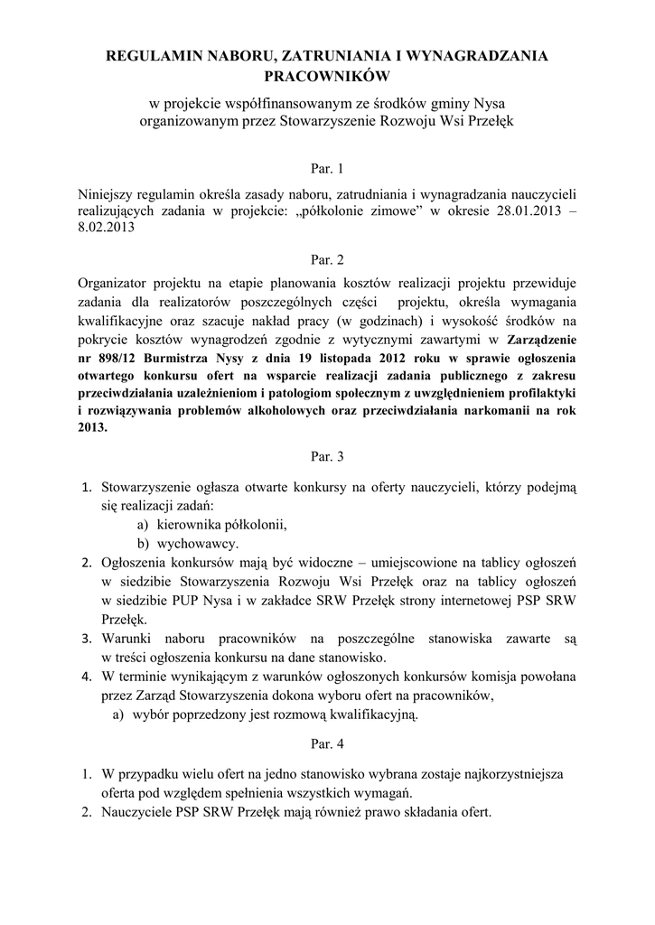 REGULAMIN NABORU, ZATRUNIANIA I WYNAGRADZANIA PRACOWNIKÓW w projekcie współfinansowanym ze środków gminy Nysa organizowanym przez Stowarzyszenie Rozwoju Wsi Przełęk Par. 1 Niniejszy regulamin określa zasady naboru, zatrudniania i wynagradzania nauczycieli realizujących zadania w projekcie: „półkolonie zimowe” w okresie 28.01.2013 – 8.02.2013 Par. 2 Organizator projektu na etapie planowania kosztów realizacji projektu przewiduje zadania dla realizatorów poszczególnych części projektu, określa wymagania kwalifikacyjne oraz szacuje nakład pracy (w godzinach) i wysokość środków na pokrycie kosztów wynagrodzeń zgodnie z wytycznymi zawartymi w Zarządzenie nr 898/12 Burmistrza Nysy z dnia 19 listopada 2012 roku w sprawie ogłoszenia otwartego konkursu ofert na wsparcie realizacji zadania publicznego z zakresu przeciwdziałania uzależnieniom i patologiom społecznym z uwzględnieniem profilaktyki i rozwiązywania problemów alkoholowych oraz przeciwdziałania narkomanii na rok 2013. Par. 3 1. Stowarzyszenie ogłasza otwarte konkursy na oferty nauczycieli, którzy podejmą się realizacji zadań: a) kierownika półkolonii, b) wychowawcy. 2. Ogłoszenia konkursów mają być widoczne – umiejscowione na tablicy ogłoszeń w siedzibie Stowarzyszenia Rozwoju Wsi Przełęk oraz na tablicy ogłoszeń w siedzibie PUP Nysa i w zakładce SRW Przełęk strony internetowej PSP SRW Przełęk. 3. Warunki naboru pracowników na poszczególne stanowiska zawarte są w treści ogłoszenia konkursu na dane stanowisko. 4. W terminie wynikającym z warunków ogłoszonych konkursów komisja powołana przez Zarząd Stowarzyszenia dokona wyboru ofert na pracowników, a) wybór poprzedzony jest rozmową kwalifikacyjną. Par. 4 1. W przypadku wielu ofert na jedno stanowisko wybrana zostaje najkorzystniejsza oferta pod względem spełnienia wszystkich wymagań. 2. Nauczyciele PSP SRW Przełęk mają również prawo składania ofert. 3. Kierownikiem kolonii może zostać dyrektor PSP SRW Przełęk, w przypadku braku zgłoszenia odpowiedniej oferty. Par. 5 Z wybranymi nauczycielami Stowarzyszenie podpisuje umowy Zlecenia na okres i warunkach określonych w ogłoszeniu konkursu, o którym mowa w par. 3 ust. 1. Par. 6 1. Wynagrodzenie wypłacane jest po zrealizowaniu zadania w okresie rozliczeniowym, na podstawie przedłożonej przez nauczyciela dokumentacji określonej w warunkach konkursu, o którym mowa w par. 3 ust. 1. oraz rachunku za wykonane zadanie. 2. Wysokość wynagrodzenia wynika z Zarządzenia Burmistrza Nysy, o którym mowa w par. 2 i ilości zrealizowanych godzin zajęć w okresie wykonywania zadania. 3. Stawka wynagrodzenia brutto nauczyciela zawiera składkę ZUS pracodawcy. 4. Jedna godzina zajęć wynosi 60 minut. Par. 7 1. Nauczyciel realizuje zajęcia wg zatwierdzonego harmonogramu i planu zajęć ustalonego z koordynatorem projektu. 2. Okres rozliczeniowy ustala koordynator projektu w porozumieniu z kierownikiem półkolonii. Par. 8 Koordynatora projektu Zarząd Stowarzyszenia wyznacza z pośród pracowników Stowarzyszenia. Par.9 Pracownicy zatrudnieni w ramach projektu potwierdzają zapoznanie się z niniejszym regulaminem. Opracował: Edward Krawecki Zatwierdził: Prezes SRW Przełęk Małgorzata Zarzycka Przełęk, 17 grudzień 2012 r. Potwierdzenie zapoznania się z regulaminem wynagradzania i zatrudniania nauczycieli w projekcie. 1. ………………………………………… 2. ………………………………………… 3. ………………………………………… 4. …………………………………………