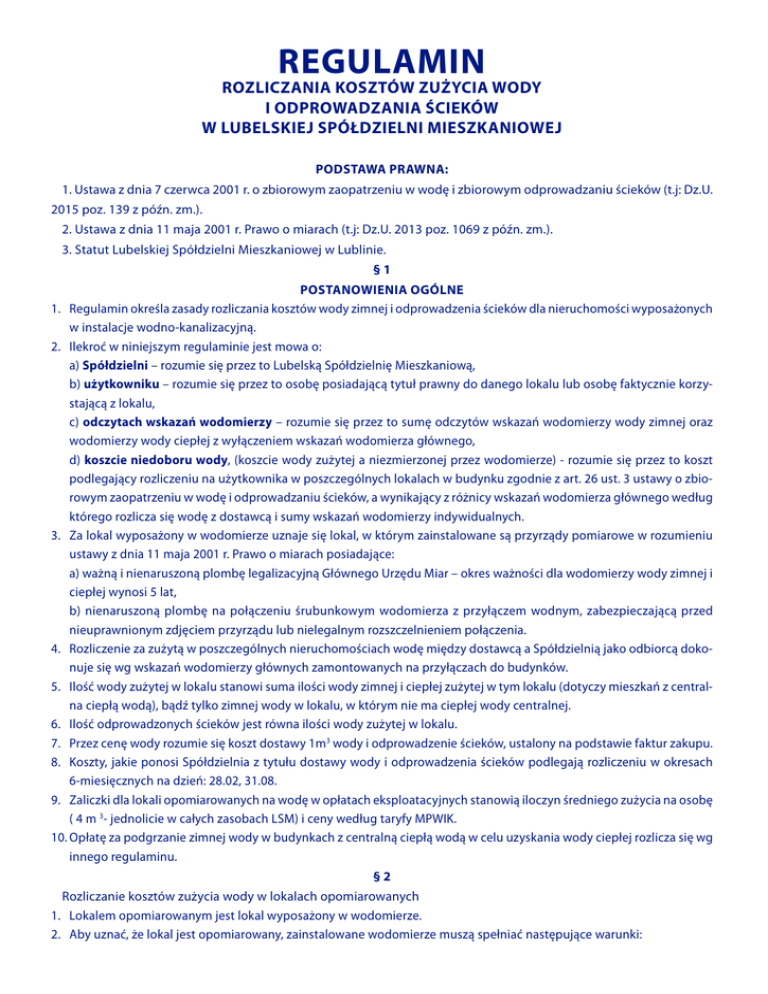 REGULAMIN ROZLICZANIA KOSZTÓW ZUŻYCIA WODY I ODPROWADZANIA ŚCIEKÓW W LUBELSKIEJ SPÓŁDZIELNI MIESZKANIOWEJ PODSTAWA PRAWNA: 1. Ustawa z dnia 7 czerwca 2001 r. o zbiorowym zaopatrzeniu w wodę i zbiorowym odprowadzaniu ścieków (t.j: Dz.U. 2015 poz. 139 z późn. zm.). 2. Ustawa z dnia 11 maja 2001 r. Prawo o miarach (t.j: Dz.U. 2013 poz. 1069 z późn. zm.). 3. Statut Lubelskiej Spółdzielni Mieszkaniowej w Lublinie. §1 POSTANOWIENIA OGÓLNE 1. Regulamin określa zasady rozliczania kosztów wody zimnej i odprowadzenia ścieków dla nieruchomości wyposażonych w instalacje wodno-kanalizacyjną. 2. Ilekroć w niniejszym regulaminie jest mowa o: a) Spółdzielni – rozumie się przez to Lubelską Spółdzielnię Mieszkaniową, b) użytkowniku – rozumie się przez to osobę posiadającą tytuł prawny do danego lokalu lub osobę faktycznie korzystającą z lokalu, c) odczytach wskazań wodomierzy – rozumie się przez to sumę odczytów wskazań wodomierzy wody zimnej oraz wodomierzy wody ciepłej z wyłączeniem wskazań wodomierza głównego, d) koszcie niedoboru wody, (koszcie wody zużytej a niezmierzonej przez wodomierze) - rozumie się przez to koszt podlegający rozliczeniu na użytkownika w poszczególnych lokalach w budynku zgodnie z art. 26 ust. 3 ustawy o zbiorowym zaopatrzeniu w wodę i odprowadzaniu ścieków, a wynikający z różnicy wskazań wodomierza głównego według którego rozlicza się wodę z dostawcą i sumy wskazań wodomierzy indywidualnych. 3. Za lokal wyposażony w wodomierze uznaje się lokal, w którym zainstalowane są przyrządy pomiarowe w rozumieniu ustawy z dnia 11 maja 2001 r. Prawo o miarach posiadające: a) ważną i nienaruszoną plombę legalizacyjną Głównego Urzędu Miar – okres ważności dla wodomierzy wody zimnej i ciepłej wynosi 5 lat, b) nienaruszoną plombę na połączeniu śrubunkowym wodomierza z przyłączem wodnym, zabezpieczającą przed nieuprawnionym zdjęciem przyrządu lub nielegalnym rozszczelnieniem połączenia. 4. Rozliczenie za zużytą w poszczególnych nieruchomościach wodę między dostawcą a Spółdzielnią jako odbiorcą dokonuje się wg wskazań wodomierzy głównych zamontowanych na przyłączach do budynków. 5. Ilość wody zużytej w lokalu stanowi suma ilości wody zimnej i ciepłej zużytej w tym lokalu (dotyczy mieszkań z centralna ciepłą wodą), bądź tylko zimnej wody w lokalu, w którym nie ma ciepłej wody centralnej. 6. Ilość odprowadzonych ścieków jest równa ilości wody zużytej w lokalu. 7. Przez cenę wody rozumie się koszt dostawy 1m3 wody i odprowadzenie ścieków, ustalony na podstawie faktur zakupu. 8. Koszty, jakie ponosi Spółdzielnia z tytułu dostawy wody i odprowadzenia ścieków podlegają rozliczeniu w okresach 6-miesięcznych na dzień: 28.02, 31.08. 9. Zaliczki dla lokali opomiarowanych na wodę w opłatach eksploatacyjnych stanowią iloczyn średniego zużycia na osobę ( 4 m 3- jednolicie w całych zasobach LSM) i ceny według taryfy MPWIK. 10.Opłatę za podgrzanie zimnej wody w budynkach z centralną ciepłą wodą w celu uzyskania wody ciepłej rozlicza się wg innego regulaminu. §2 Rozliczanie kosztów zużycia wody w lokalach opomiarowanych 1. Lokalem opomiarowanym jest lokal wyposażony w wodomierze. 2. Aby uznać, że lokal jest opomiarowany, zainstalowane wodomierze muszą spełniać następujące warunki: 3. 4. 5. 6. a) wodomierz – montowany za zaworem głównym - spełnia polskie normy, posiada atest i aktualne świadectwo legalizacji, b) wodomierze w lokalu muszą zliczać 100% wody pobieranej w tym lokalu , c) wielkość wodomierza jest dobrana do rozbiorów wody w lokalu, d) fakt zamontowania wodomierza został niezwłocznie zgłoszony do Administracji Osiedla celem dokonania odbioru, zaplombowania i przyjęcia do rozliczenia oraz podpisania umowy na wodomierz, Rozliczanie kosztów zużycia wody w oparciu o wskazania wodomierza rozpoczyna się od pierwszego dnia miesiąca następującego po miesiącu, w którym zainstalowano wodomierz. Użytkownik lokalu może podawać indywidulane odczyty wodomierzy telefonicznie, osobiście, pisemnie, pocztą elektroniczną do właściwej administracji. Należy tego dokonać nie później niż w ciągu 5 dni po okresie rozliczeniowym. Spółdzielnia zastrzega sobie prawo dokonywania kontrolnych odczytów wodomierzy. Różnica powstała w wyniku rozliczenia kosztów zużycia wody pomiędzy poniesionymi kosztami, a opłatami wniesionymi przez użytkownika regulowana będzie następująco: a) niedopłatę użytkownik lokalu wnosi przy opłacie opłat eksploatacyjnych w miesiącu następnym po dokonaniu rozliczenia. b) nadpłatę – zalicza się na poczet najbliższych należności z tytułu opłat eksploatacyjnych lub wypłaca się na żądanie użytkownika lokalu, c) w przypadku zadłużenia nadpłatę zalicza się na poczet zadłużenia i nie ma możliwości jej wypłaty. 7. W przypadku przejściowej – nie przekraczającej 6-ciu miesięcy - niesprawności wodomierza, zużycie wody w lokalu ustalone zostaje na podstawie średniego zużycia wody w tym lokalu w ostatnim okresie rozliczeniowym poprzedzającym niesprawność. 8. W przypadku zaistnienia co najmniej jednej z poniższych okoliczności: a) niesprawności wodomierza powyżej 6 –ciu miesięcy, b) nie zgłoszenia do Spółdzielni uszkodzenia wodomierza, c) naruszenia plomby na wodomierzu, d) stwierdzenia próby ingerencji polem magnetycznym na wskazania wodomierza, e) dokonania samowolnych przeróbek instalacji wodociągowej uniemożliwiających stwierdzenie faktycznego zużycia wody, f ) nie podania w terminie stanu wodomierza, g) uniemożliwienia kontrolnego odczytu wodomierza, h) pisemnej rezygnacji z rozliczenia zużycia wody wg wskazań wodomierza, zużycie wody w lokalu w okresie rozliczeniowym ustalone zostaje jak dla lokalu nieopomiarowanego i nie może być mniejsze niż w ostatnim okresie rozliczeniowym. 9. Za okres niesprawności wodomierza
