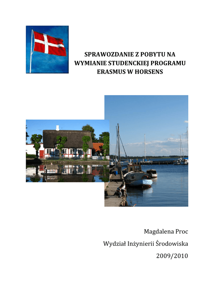 SPRAWOZDANIE Z POBYTU NA WYMIANIE STUDENCKIEJ PROGRAMU ERASMUS W HORSENS Magdalena Proc Wydział Inżynierii Środowiska 2009/2010 HORSENS Wymianę studencką z programu Erasmus odbyłam w Horsens w Danii. Horsens jest małym portowym miasteczkem w Jutlandii, nad fiordem Forderschifffart. Okolica jest malownicza, duzo zieleni szczegolnie wiosną, piekne krajobrazy, architekrura to przede wszystkim małe domki z czerwonej cegły stanowiące jedną spojną całość. W centrum miasteczka jest deptak z mnóstwem sklepikow, kamieniczek, kilka pubów i klubów. Świetne mniejsce do jazdy na rowerze i uprawiania joggingu. CENY Dania jak wszystkie skandynawskie państewka jest krajem drogim, począwszy od ceny akademika gdzie wynajęcie pokoju (ze zniżka prawie 50% przeznaczoną dla studentów z Polski) kosztuje około 900 zl. Artukuły spożywcze i transport rowinież są dużo droższe niż w Polsce. Najlepiej kupować produkty w promocyjnych cenach np. w Lidlu który jest chyba najtańszym sklepem. Co do transportu wiekszosc studentów porusza sie na rowerach co jest tu bardzo popularne. Dobrym pomysłem jest tez przwiezienie samochodu co daje duża wygodę i można tanio zwiedzić cała Danię gdyż odległosci nie sa duże. Można tez kupić wild card co daje 50% zniżke na bilety kolejowe w dni robocze i 20% w weeekndy. ZAKWATEROWANIE Pokoje można zarezerwować na specjalnej stornie internetowej . Do wyboru sa akademiki Kamtjatka (w centrum miasta) i Campus Village (przy uczelni) i mieszkania prywatne. Ja mieszkałam w Kamtjatce i osobiście muszę bardzo polecić to miejsce. Może standard jest troszke niższy niż w Campus Village , dalej od uczelni (około 2,5 km)i gorszy internet ale jest bliżej do centrum, klubów, wieszych supermarketów i życie studenckie jest zdecydowanie ciekawsze. Pokoje wyposażone są w łóżko, nową pościel, biurko, lampkę do pracy, szafę i fotel. Kuchnie są również bardzo dobrze wyposażone: kuchenka, garnki, toster, mikrofalówka, sztućce, szklanki, talerze. Wiekszość akademików jest nowa i w bardzo dobrym stanie technicznym. Na terenie akademików są też pralnie ale niestety płatne 10 DKK. Dobrze jest tez zamieszkać z obcokrajowcem co daje możliwość podszkolenia języka. UCZELNIA Uczelnia jest świetnie wyposażona. Można tu korzystac z bezprzewodowego, szybkeigo internetu. Do każdej sali jak i uczelni dostęp jest za pomocą kart magnetycznych i hasła dostępu które posiada każdy student wiec można na niej spędzać 24h na dobę. Budynek podzielony jest na sektory, więc bardzo łatwo wszystko znaleźć. Szkoła oferuje stołowke, workshop, bibliotekę, plotery, kserokopiarki, komputery (jednak najlepiej zabrać swój komputer, co dużo ułatwia). Bardzo rozpowszechniona jest tutaj wymiana emailowa. Nauczyciele wysyłają maile np. gdy zajęcia są odwołane a w sieci szkolnej umieszczają wszelkie informacje dydaktyczne, co bardzo ułatwia naukę. Jest również wiele miejsc do pracy w grupach. Nauczyciele sa bardzo mili, poświęcają wiele czasu na konsultacje i z chęcią pomagają w razie problemow. Szkoła organizuje też wycieczki i imprezy. Należy tu wspomnieć o International day (impreza gdzie studenci przygotowują stanowiska promujace ich kraj, ubieraja narowode stroje, przygotowuja narodowe potrawy i alkohole) jak i o semester party (impreza przebierana organizowana raz w semestrze). Atmosfera na uczelni jest bardzo miła i z chęcią spedza się na niej czas. ŻYCIE STUDENCKIE Jak wiadomo od zawsze nie samą nauką student żyje. Zazwyczaj od czwartku zaczyna się weekendowe szaleństwo. Imprezy organizowane są często przez studentów w akademikach i każdy jest na nich mile widziany. Jeżeli ktoś preferuje zabawę w klubie jest ich kilka w Horsens ale ceny są wysokie. Ja osobiście polecam First Mansion gdzie jeszcze rok temu przed 24 darmowy wstęp. Przy uczelni jest tzw. school bar gdzie często organizowane są studenckie imprezy w stylu muzyka na żywo itp. Ceny są przystępne wiec można tam spotkać wielu studentów w czwartkowe, piątkowe i sobotnie wieczory. Wszyscy są zazwyczaj bardzo otwarci na nowe znajomości więc nie ma problemu z nawiązywaniem przyjaźni. PODRÓŻE Wymiana studencka jest tez możliwością podróżowania. Zwiedzić można Danię (ciekawsze miejsca to Skagen, Legoland, Kopenhaga, Arhus, wyspa Samso ) ale również kraje europejskie gdyż ceny biletów lotniczych nie są tu wysokie. Bardzo popularne wśród studentów jest organizowanie tego typu wycieczek. PODSUMOWANIE Moim zdaniem Horsens jest świetnym miejscem do odbycia wymiany studenckiej i nie zamieniłabym go na żadne inne. Spędziłam tam najlepszy rok mojego życia a wspomnienia są bezcenne. Wymiana studencka daje wiele możliwości jak podszkolenie języka, nawiązanie nowych, międzynarodowych znajomości, poznanie kultury, zwyczajów i systemu edukacji innego kraju wiec mówi to samo za siebie.