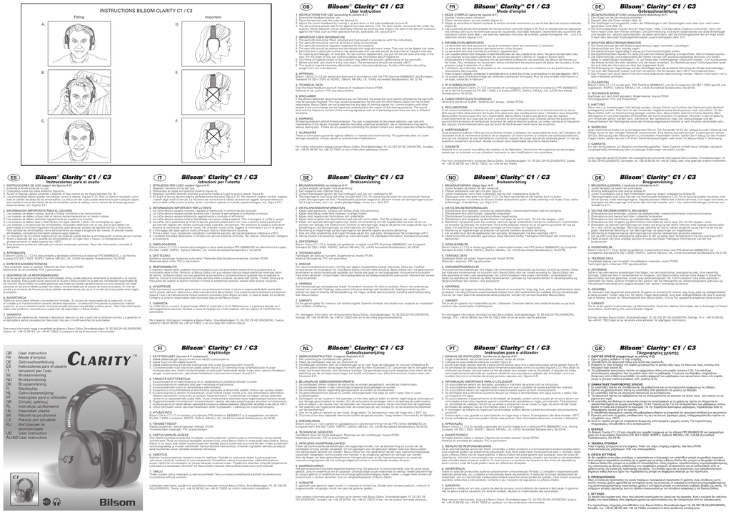 GB INSTRUCTIONS BILSOM CLARITY C1 / C3 Fitting Important A. D. 1. 1. 2. 3. 4. Bilsom ® Clarity™ C1 / C3 User instruction INSTRUCTIONS FOR USE (according to picture A-F) Extend the headband before use. Place the earcups over the outer ear (picture A). Adjust the crown headband by moving it up and down in the side headbands (picture B). The ear cushions should seal firmly against the head (picture C-D). For best results, remove all hair under the cushion. Noise reduction will be adverserly effected by anything that impairs the seal of the earmuff cushions against the head, such as thick spectacle frames, balaclavas, etc. (picture E-F). 2. 1. 2. 3. 4. 5. IMPORTANT USER INFORMATION The earmuffs should be fitted, adjusted and maintained in accordance with the instructions. The earmuffs should be worn at all times in noisy surroundings. The earmuffs should be regularly inspected for serviceability. The earmuffs should be cleaned and disinfected with soap and warm water. They may not be dipped into water. Earmuffs and in particular cushions may deteriorate with use and should be examined at frequent intervals for cracking and leakage, for example. For ear cushion replacement, just pull off the old ones and snap in the new. For the order of new ear cushions please see information about hygiene kit. 6. The fitting of hygiene covers to the cushions may affect the acoustic performance of the ear-muffs. 7. Before and after use, store in a dry, cool place. The temperature should not exceed +55°C. 8. This product may be adversely affected by certain chemical substances. Further information should be sought from the manufacturer. B. E. 3. APPROVAL Bilsom Clarity C1/ C3 are tested and approved in accordance with the PPE directive 89/686/EEC and European Standard EN 352-1:2002 at INSPEC, Salford, M6 6AJ, UK, (UKAS Accredited Testlaboratory, No. 0316). 4. TECHNICAL DATA Over-the-head headband earmuff. Material of headband: Acetal (POM) Material of ear cushion: PVC and polyurethane 5. DISCLAIMER If the above-mentioned recommendations are not followed, the protection and function afforded by the earmuffs may be severely impaired. This may cause consequences for the user for which Bacou-Dalloz can not be held responsible. Bacou-Dalloz can not guarantee that any type of warning signals incl. communication with other people in the surroundings can be heard and understood by the wearer of this hearing protector. The sound level and the frequency content of the warning signals as well as of the background noise can vary in different situations. C. 6. WARNING All hearing protection affords limited protection. The user is responsible for the proper selection, use, care and maintenance of this device. Improper selection (including under/over protection), use or maintenance may lead to serious hearing loss. If there are any questions concerning this product contact your safety supervisor or Bacou-Dalloz. F. 7. GUARANTEE There is a one years guarantee against defects in material and workmanship. The guarantee does not cover damage caused by misuse, abuse or unauthorised modifications. For further information please contact Bacou-Dalloz, Strandbadsvägen 15, SE-252 29 HELSINGBORG, Sweden, tel. +46 42 88100, fax +46 42 73822 or any of the other addresses shown. FR 1. 1. 2. 3. Bilsom ® Clarity™ C1 / C3 Mode d’emploi MODE D’EMPLOI (selon les figures A-F) Ajustez l’arceau avant utilisation. Placez les écouteurs sur vos oreilles (figure A). Réglez le serre-tête en faisant coulisser la section centrale vers le haut ou vers le bas dans les sections latérales (figure B). 4. Les coussinets doivent être pressés fermement contre votre tête (figure C-D). Pour un résultat optimal, repoussez vos cheveux afin qu’ils ne soient pas sous les coussinets. Tout objet réduisant l’étanchéité des coussinets des écouteurs contre votre tête – par exemple épaisses montures de lunettes, passe-montagnes, etc. - nuit à la réduction sonore (figures E-F). 1. 1. 2. 3. 2. 1. 2. 3. 4. 5. 2. 1. 2. 3. 4. 5. INFORMATION IMPORTANTE Le serre-tête doit être positionné, ajusté et entretenu selon les instructions d’utilisation. Le serre-tête doit être porté en permanence en milieu bruyant. Le serre-tête doit être contrôlé et entretenu régulièrement. Les coquilles doivent être nettoyées et désinfectées avec de l’eau chaude et du savon. Ne pas le tremper dans l’eau. Les coquilles et plus particulièrement les coussinets peuvent s’abîmer à l’usage et doivent donc êtreinspectés à intervalles réguliers afin de permettre la détection, par exemple, de débuts de fissures ou de fuites. Pour remplacer les coussinets, retirez simplement les anciens avant de placer les nouveaux d’une pression jusqu’à obtention d’un déclic. 6. L’utilisation de collerettes de propreté sur les coussinets peut avoir une incidence sur les performances acoustiques des coquilles. 7. Avant et après l’utilisation, entreposez le serre-tête dans un endroit sec et frais. La température ne doit pas dépasser +55oC. 8. Ce produit peut être endommagé par certaines substances chimiques. Pour de plus amples informations à ce sujet, contactez le fabricant. 3. N° D’HOMOLOGATION Les serre-tête Bilsom Clarity C1 / C3 sont testés et homologués conformément à la directive PPE 89/686/EEC et de la Norme Européenne EN 352-1:2002 a le bureau INSPEC, Salford, M6 6AJ, UK, (UKAS Accredited Testlaboratory, No 0316). 4. CARACTÉRISTIQUES TECHNIQUES Serre-tête (porté sur la tête) . Matériau de l’arceau : Acétal (POM) 5. RÉCLAMATIONS Si les recommandations ci-dessus ne sont pas respectées, l’effet protecteur et le fonctionnement du serretête peuvent être sérieusement diminués. Ceci peut avoir des conséquences pour l’utilisateur pour lesquelles Bacou-Dalloz ne pourra pas être tenu responsable. Bacou-Dalloz ne peut pas garantir que des signaux d’avertissement de tout type que ce soit, y compris la communic
