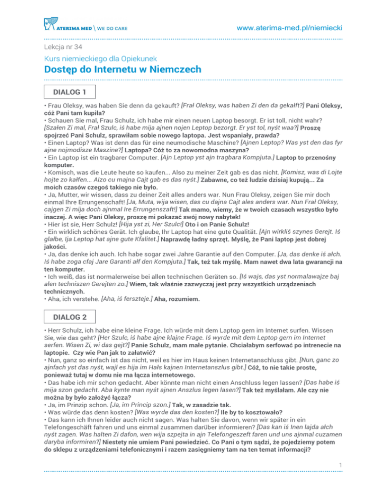 www.aterima-med.pl/niemiecki Lekcja nr 34 Kurs niemieckiego dla Opiekunek Dostęp do Internetu w Niemczech DIALOG 1 • Frau Oleksy, was haben Sie denn da gekauft? [Frał Oleksy, was haben Zi den da gekałft?] Pani Oleksy, cóż Pani tam kupiła? • Schauen Sie mal, Frau Schulz, ich habe mir einen neuen Laptop besorgt. Er ist toll, nicht wahr? [Szałen Zi mal, Frał Szulc, iś habe mija ajnen nojen Leptop bezorgt. Er yst tol, nyśt waa?] Proszę spojrzeć Pani Schulz, sprawiłam sobie nowego laptopa. Jest wspaniały, prawda? • Einen Laptop? Was ist denn das für eine neumodische Maschine? [Ajnen Leptop? Was yst den das fyr ajne nojmodisze Maszine?] Laptopa? Cóż to za nowomodna maszyna? • Ein Laptop ist ein tragbarer Computer. [Ajn Leptop yst ajn tragbara Kompjuta.] Laptop to przenośny komputer. • Komisch, was die Leute heute so kaufen... Also zu meiner Zeit gab es das nicht. [Komisz, was di Lojte hojte zo kałfen... Alzo cu majna Cajt gab es das nyśt.] Zabawne, co też ludzie dzisiaj kupują... Za moich czasów czegoś takiego nie było. • Ja, Mutter, wir wissen, dass zu deiner Zeit alles anders war. Nun Frau Oleksy, zeigen Sie mir doch einmal Ihre Errungenschaft! [Ja, Muta, wija wisen, das cu dajna Cajt ales anders war. Nun Frał Oleksy, cajgen Zi mija doch ajnmal Ire Errungenszaft!] Tak mamo, wiemy, że w twoich czasach wszystko było inaczej. A więc Pani Oleksy, proszę mi pokazać swój nowy nabytek! • Hier ist sie, Herr Schulz! [Hija yst zi, Her Szulc!] Oto i on Panie Schulz! • Ein wirklich schönes Gerät. Ich glaube, Ihr Laptop hat eine gute Qualität. [Ajn wirkliś szynes Gerejt. Iś glałbe, Ija Leptop hat ajne gute Kfalitet.] Naprawdę ładny sprzęt. Myślę, że Pani laptop jest dobrej jakości. • Ja, das denke ich auch. Ich habe sogar zwei Jahre Garantie auf den Computer. [Ja, das denke iś ałch. Iś habe zoga cfaj Jare Garanti ałf den Kompjuta.] Tak, też tak myślę. Mam nawet dwa lata gwarancji na ten komputer. • Ich weiß, das ist normalerweise bei allen technischen Geräten so. [Iś wajs, das yst normalawajze baj alen techniszen Gerejten zo.] Wiem, tak właśnie zazwyczaj jest przy wszystkich urządzeniach technicznych. • Aha, ich verstehe. [Aha, iś ferszteje.] Aha, rozumiem. DIALOG 2 • Herr Schulz, ich habe eine kleine Frage. Ich würde mit dem Laptop gern im Internet surfen. Wissen Sie, wie das geht? [Her Szulc, iś habe ajne klajne Frage. Iś wyrde mit dem Leptop gern im Internet serfen. Wisen Zi, wi das gejt?] Panie Schulz, mam małe pytanie. Chciałabym serfować po intrenecie na laptopie. Czy wie Pan jak to załatwić? • Nun, ganz so einfach ist das nicht, weil es hier im Haus keinen Internetanschluss gibt. [Nun, ganc zo ajnfach yst das nyśt, wajl es hija im Hałs kajnen Internetanszlus gibt.] Cóż, to nie takie proste, ponieważ tutaj w domu nie ma łącza internetowego. • Das habe ich mir schon gedacht. Aber könnte man nicht einen Anschluss legen lassen? [Das habe iś mija szon gedacht. Aba kynte man nyśt ajnen Anszlus legen lasen?] Tak też myślałam. Ale czy nie można by było założyć łącza? • Ja, im Prinzip schon. [Ja, im Princip szon.] Tak, w zasadzie tak. • Was würde das denn kosten? [Was wyrde das den kosten?] Ile by to kosztowało? • Das kann ich Ihnen leider auch nicht sagen. Was halten Sie davon, wenn wir später in ein Telefongeschäft fahren und uns einmal zusammen darüber informieren? [Das kan iś Inen lajda ałch nyśt zagen. Was halten Zi dafon, wen wija szpejta in ajn Telefongeszeft faren und uns ajnmal cuzamen daryba informiren?] Niestety nie umiem Pani powiedzieć. Co Pani o tym sądzi, że pojedziemy potem do sklepu z urządzeniami telefonicznymi i razem zasięgniemy tam na ten temat informacji? 1 www.aterima-med.pl/niemiecki • Das ist ein toller Vorschlag. [Das yst ajn tola Forszlag.] To świetna propozycja. DIALOG 3 • Guten Tag, mein Name ist Johann Ilek. Wie kann ich Ihnen behilflich sein? [Guten Tag, majn Name yst Johan Ilek. Wi kan iś Inen behilfliś zajn?] Dzień dobry, nazywam się Johann Ilek. Jak mogę Państwu pomóc? • Guten Tag, ich hätte gern eine Internet-Verbindung für zu Hause. [Guten Tag, iś hete gern ajne Internet-Ferbindung fyr cu Hałze.] Dzień dobry, chciałabym zapytać o łącze internetowe do domu. • Möchten Sie einen Vertrag mit uns abschließen? Wir haben momentan eine sehr interessante RabattAktion und bieten Ihnen einen DSL-Anschluss für 22,99 Euro im Monat an. [Myśten Zi ajnen Fertrag mit uns abszlisen? Wija haben momentan ajne zea interesante Rabat-Akcjon und biten Inen ajnen DeEsElAnszlus fyr cfajundcfancyś Ojro und nojnundnojncyś Cent im Monat an.] Chciałaby Pani podpisać z nami umowę? Mamy obecnie bardzo interesującą akcję promocyjną i proponujemy Pani internet z telefonem za 22,99 Euro miesięcznie. • Das ist aber günstig. [Das yst aba gynstiś] To jest korzystne. • Genau. Und außerdem gibt es eine Telefonflatrate inklusive. [Genał. Und ałsadem gibt es ajne Telefonfletrejt inkluziw.] Dokładnie. A oprócz tego jest w tym abonament telefoniczny. • Nicht schlecht. Gilt diese Flatrate auch für Telefonate ins europäische Ausland? [Nyśt szleśt. Gilt dize Fletrejt ałch fyr Telefonate ins ojropeisze Ałsland?] Nieźle. Czy ten abonament obowiązuje również na telefony za granicę w Europie? • Ja, natürlich. [Ja, natyrliś.] Tak, naturalnie. • Wie sieht es denn mit der Vertragslaufzeit aus? [Wi zit es den mit der Fertragslałfcajt ałs?] Jak wygląda kwestia czasu trwania umowy? • Der Vertrag läuft mindestens über 24 Monate. [Der Fertrag lojft mindestens yba fijaundcfancyś Monate.] Umowa trwa co najmniej 24 miesiące. • So lange? Ich kann doch sicherlich schon früher kündigen, oder? [Zo lange? Iś kan doch zisierliś szon fryja kyndigen, oda?] Tak długo? Na pewno mogę przecież wcześniej wypowiedzieć umowę, prawda? • Das geht leider nicht. Doch wenn Sie nach zwei Jahren nicht wollen, dass sich Ihr Vertrag 