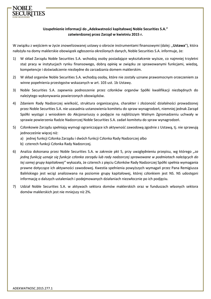 Uzupełnienie informacji do „Adekwatności kapitałowej Noble Securities S.A.” zatwierdzonej przez Zarząd w kwietniu 2015 r. W związku z wejściem w życie znowelizowanej ustawy o obrocie instrumentami finansowymi (dalej: „Ustawa”), która nałożyła na domy maklerskie obowiązek ogłoszenia określonych danych, Noble Securities S.A. informuje, że: 1) W skład Zarządu Noble Securities S.A. wchodzą osoby posiadające wykształcenie wyższe, co najmniej trzyletni staż pracy w instytucjach rynku finansowego, dobrą opinię w związku ze sprawowanymi funkcjami, wiedzę, kompetencje i doświadczenie niezbędne do zarzadzania domem maklerskim. 2) W skład organów Noble Securities S.A. wchodzą osoby, które nie zostały uznane prawomocnym orzeczeniem za winne popełnienia przestępstw wskazanych w art. 103 ust. 1b Ustawy. 3) Noble Securities S.A. zapewnia podnoszenie przez członków organów Spółki kwalifikacji niezbędnych do należytego wykonywania powierzonych obowiązków. 4) Zdaniem Rady Nadzorczej wielkość, struktura organizacyjna, charakter i złożoność działalności prowadzonej przez Noble Securities S.A. nie uzasadnia ustanowienia komitetu do spraw wynagrodzeń, niemniej jednak Zarząd Spółki wystąpi z wnioskiem do Akcjonariuszy o podjęcie na najbliższym Walnym Zgromadzeniu uchwały w sprawie powierzenia Radzie Nadzorczej Noble Securities S.A. zadań komitetu do spraw wynagrodzeń. 5) Członkowie Zarządu spełniają wymogi ograniczające ich aktywność zawodową zgodnie z Ustawą, tj. nie sprawują jednocześnie więcej niż: a) jednej funkcji Członka Zarządu i dwóch funkcji Członka Rady Nadzorczej albo b) czterech funkcji Członka Rady Nadzorczej. 6) Analiza dokonana przez Noble Securities S.A. w zakresie pkt 5, przy uwzględnieniu przepisu, wg którego „za jedną funkcję uznaje się funkcje członka zarządu lub rady nadzorczej sprawowane w podmiotach należących do tej samej grupy kapitałowej” wykazała, że czterech z pięciu Członków Rady Nadzorczej Spółki spełnia wymagania prawne dotyczące ich aktywności zawodowej. Kwestia spełnienia powyższych wymagań przez Pana Remigiusza Balińskiego jest wciąż analizowana na poziomie grupy kapitałowej, której członkiem jest NS. NS udostępni informację o dalszych ustaleniach i podejmowanych działaniach niezwłocznie po ich podjęciu. 7) Udział Noble Securities S.A. w aktywach sektora domów maklerskich oraz w funduszach własnych sektora domów maklerskich jest nie mniejszy niż 2%. ADEKWATNOSC.2015.277.1