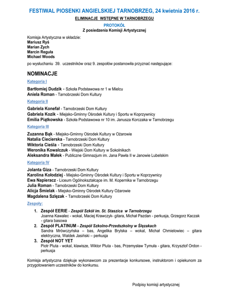 FESTIWAL PIOSENKI ANGIELSKIEJ TARNOBRZEG, 24 kwietnia 2016 r. ELIMINACJE WSTĘPNE W TARNOBRZEGU PROTOKÓŁ Z posiedzenia Komisji Artystycznej Komisja Artystyczna w składzie: Mariusz Ryś Marian Zych Marcin Reguła Michael Woods po wysłuchaniu 39. uczestników oraz 9. zespołów postanowiła przyznać następujące: NOMINACJE Kategoria I Bartłomiej Dudzik - Szkoła Podstawowa nr 1 w Mielcu Aniela Roman - Tarnobrzeski Dom Kultury Kategoria II Gabriela Konefał - Tarnobrzeski Dom Kultury Gabriela Kozik - Miejsko-Gminny Ośrodek Kultury i Sportu w Koprzywnicy Emilia Piątkowska - Szkoła Podstawowa nr 10 im. Janusza Korczaka w Tarnobrzegu Kategoria III Zuzanna Bąk - Miejsko-Gminny Ośrodek Kultury w Ożarowie Natalia Ciecierska - Tarnobrzeski Dom Kultury Wiktoria Cieśla - Tarnobrzeski Dom Kultury Weronika Kowalczuk - Wiejski Dom Kultury w Sokolnikach Aleksandra Małek - Publiczne Gimnazjum im. Jana Pawła II w Janowie Lubelskim Kategoria IV Jolanta Giza - Tarnobrzeski Dom Kultury Karolina Kołodziej - Miejsko-Gminny Ośrodek Kultury i Sportu w Koprzywnicy Ewa Napieracz - Liceum Ogólnokształcące im. M. Kopernika w Tarnobrzegu Julia Roman - Tarnobrzeski Dom Kultury Alicja Śmielak - Miejsko-Gminny Ośrodek Kultury Ożarowie Magdalena Szlęzak - Tarnobrzeski Dom Kultury Zespoły: 1. Zespół EERIE - Zespół Szkół im. St. Staszica w Tarnobrzegu Joanna Kawalec - wokal, Maciej Krawczyk- gitara, Michał Pazdan - perkusja, Grzegorz Kaczak - gitara basowa 2. Zespół PLATINUM - Zespół Szkolno-Przedszkolny w Ślęzakach Sandra Mrówczyńska – bas, Angelika Brylska – wokal, Michał Chmielowiec – gitara elektryczna, Waldek Jasiński – perkusja 3. Zespół NOT YET Piotr Pluta - wokal, klawisze, Wiktor Pluta - bas, Przemysław Tymuła - gitara, Krzysztof Ordon perkusja Komisja artystyczna dziękuje wykonawcom za prezentacje konkursowe, instruktorom i opiekunom za przygotowaniem uczestników do konkursu. Podpisy komisji artystycznej
