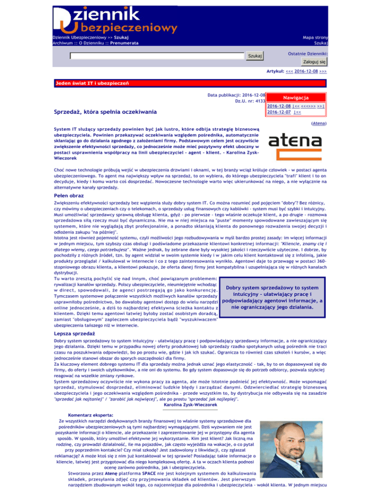 Dziennik Ubezpieczeniowy >> Szukaj Archiwum :: O Dzienniku :: Prenumerata Mapa strony Szukaj Szukaj Ostatnie Dzienniki: Zaloguj się Artykuł: <<< 2016‐12‐08 >>> Jeden świat IT i ubezpieczeń Data publikacji: 2016‐12‐08 Dz.U. nr: 4133 Sprzedaż, która spełnia oczekiwania Nawigacja 2016‐12‐08 |<< <<<>>> >>| 2016‐12‐07 |<< (Atena) System IT służący sprzedaży powinien być jak lustro, które odbija strategię biznesową ubezpieczyciela. Powinien przekazywać oczekiwania względem pośrednika, automatycznie skłaniając go do działania zgodnego z założeniami firmy. Podstawowym celem jest oczywiście zwiększenie efektywności sprzedaży, co jednocześnie może mieć pozytywny efekt uboczny w postaci usprawnienia współpracy na linii ubezpieczyciel ‐ agent ‐ klient. ‐ Karolina Zysk‐ Wieczorek Choć nowe technologie próbują wejść w ubezpieczenia drzwiami i oknami, w tej branży wciąż króluje człowiek ‐ w postaci agenta ubezpieczeniowego. To agent ma największy wpływ na sprzedaż, to on wybiera, do którego ubezpieczyciela "trafi" klient i to on decyduje, kiedy i komu warto coś dosprzedać. Nowoczesne technologie warto więc ukierunkować na niego, a nie wyłącznie na alternatywne kanały sprzedaży. Pełen obraz Zwiększeniu efektywności sprzedaży bez wątpienia służy dobry system IT. Co można rozumieć pod pojęciem "dobry"? Bez różnicy, czy mówimy o ubezpieczeniach czy o telekomach, o sprzedaży usług finansowych czy kablówki ‐ system musi być szybki i intuicyjny. Musi umożliwiać sprzedawcy sprawną obsługę klienta, gdyż ‐ po pierwsze ‐ tego właśnie oczekuje klient, a po drugie ‐ rozmowa sprzedażowa siłą rzeczy musi być dynamiczna. Nie ma w niej miejsca na "puste" momenty spowodowane zawieszającym się systemem, które nie wyglądają zbyt profesjonalnie, a ponadto skłaniają klienta do ponownego rozważenia swojej decyzji i odłożenia zakupu "na później". Istotna jest również pojemność systemu, czyli możliwości jego rozbudowywania w myśl bardzo prostej zasady: im więcej informacji w jednym miejscu, tym szybszy czas obsługi i podświadome przekazanie klientowi konkretnej informacji: "Kliencie, znamy cię i dlatego wiemy, czego potrzebujesz" . Ważne jednak, by zebrane dane były wysokiej jakości i rzeczywiście użyteczne. I dobrze, by pochodziły z różnych źródeł, tzn. by agent widział w swoim systemie kiedy i w jakim celu klient kontaktował się z infolinią, jakie produkty przeglądał / kalkulował w internecie i co z tego zainteresowania wynikło. Agentowi daje to przewagę w postaci 360‐ stopniowego obrazu klienta, a klientowi pokazuje, że oferta danej firmy jest kompatybilna i uzupełniająca się w różnych kanałach dystrybucji. Tu warto zresztą pochylić się nad innym, choć powiązanym problemem: rywalizacji kanałów sprzedaży. Polscy ubezpieczyciele, nieumiejętnie wchodząc Dobry system sprzedażowy to system w direct, spowodowali, że agenci postrzegają go jako konkurencję. intuicyjny ‐ ułatwiający pracę i Tymczasem systemowe połączenie wszystkich możliwych kanałów sprzedaży usprawniłoby pośrednictwo, bo dawałoby agentowi dostęp do wielu narzędzi podpowiadający agentowi informacje, a nie ograniczający jego działania. online jednocześnie, a dziś to najbardziej efektywna ścieżka kontaktu z klientem. Dzięki temu agentowi łatwiej byłoby zostać osobistym doradcą, zamiast "obsługowym" zapleczem ubezpieczyciela bądź "wyszukiwaczem" ubezpieczenia tańszego niż w internecie. Lepsza sprzedaż Dobry system sprzedażowy to system intuicyjny ‐ ułatwiający pracę i podpowiadający sprzedawcy informacje, a nie ograniczający jego działania. Dzięki temu w przypadku nowej oferty produktowej lub sprzedaży rzadko spotykanych usług pośrednik nie traci czasu na poszukiwania odpowiedzi, bo po prostu wie, gdzie i jak ich szukać. Ogranicza to również czas szkoleń i kursów, a więc jednocześnie stanowi obszar do sporych oszczędności dla firmy. Za kluczowy element dobrego systemu IT dla sprzedaży można jednak uznać jego elastyczność ‐ tak, by to on dopasowywał się do firmy, do oferty i swoich użytkowników, a nie oni do systemu. Bo gdy system dopasowuje się do potrzeb odbiorcy, pozwala szybciej reagować na wszelkie zmiany rynkowe. System sprzedażowy oczywiście nie wykona pracy za agenta, ale może istotnie podnieść jej efektywność. Może wspomagać sprzedaż, stymulować dosprzedaż, eliminować ludzkie błędy i zarządzać danymi. Odzwierciedlać strategię biznesową ubezpieczyciela i jego oczekiwania względem pośrednika ‐ przede wszystkim to, by dystrybucja nie odbywała się na zasadzie "sprzedać jak najtaniej" / "zarobić jak najwięcej", ale po prostu "sprzedać jak najlepiej". Karolina Zysk‐Wieczorek Komentarz eksperta: Ze wszystkich narzędzi dedykowanych branży finansowej to właśnie systemy sprzedażowe dla pośredników ubezpieczeniowych są tymi najbardziej wymagającymi. Dziś wyzwaniem nie jest pozyskanie informacji o kliencie, ale przekazanie i zaprezentowanie jej w przystępny dla agenta sposób. W sposób, który umożliwi efektywne jej wykorzystanie. Kim jest klient? Jak liczną ma rodzinę, czy prowadzi działalność, ile ma pojazdów, jak często wyjeżdża na wakacje, o co pytał przy poprzednim kontakcie? Czy miał szkodę? Jest zadowolony z likwidacji, czy zgłaszał reklamację? A może ktoś się z nim już kontaktował w tej sprawie? Posiadając takie informacje o kliencie, łatwiej jest przygotować dla niego kompleksową ofertę. A ta w oczach klienta podnosi ocenę zarówno pośrednika, jak i ubezpieczyciela. Stworzona przez Atenę platforma SPACE nie jest kolejnym systemem do kalkulowania składek, przesyłania zdjęć czy przyjmowania składek od klientów. Jest pierwszym narzędziem zbudowanym wokół tego, co najcenniejsze dla pośrednika i ubezpieczyciela ‐ wokół klienta. W jednym