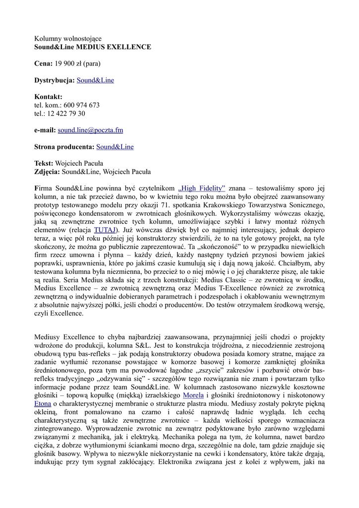 Kolumny wolnostojące Sound&Line MEDIUS EXELLENCE Cena: 19 900 zł (para) Dystrybucja: Sound&Line Kontakt: tel. kom.: 600 974 673 tel.: 12 422 79 30 e-mail: [email protected] Strona producenta: Sound&Line Tekst: Wojciech Pacuła Zdjęcia: Sound&Line, Wojciech Pacuła Firma Sound&Line powinna być czytelnikom „High Fidelity” znana – testowaliśmy sporo jej kolumn, a nie tak przecież dawno, bo w kwietniu tego roku można było obejrzeć zaawansowany prototyp testowanego modelu przy okazji 71. spotkania Krakowskiego Towarzystwa Sonicznego, poświęconego kondensatorom w zwrotnicach głośnikowych. Wykorzystaliśmy wówczas okazję, jaką są zewnętrzne zwrotnice tych kolumn, umożliwiające szybki i łatwy montaż różnych elementów (relacja TUTAJ). Już wówczas dźwięk był co najmniej interesujący, jednak dopiero teraz, a więc pół roku później jej konstruktorzy stwierdzili, że to na tyle gotowy projekt, na tyle skończony, że można go publicznie zaprezentować. Ta „skończoność” to w przypadku niewielkich firm rzecz umowna i płynna – każdy dzień, każdy następny tydzień przynosi bowiem jakieś poprawki, usprawnienia, które po jakimś czasie kumulują się i dają nową jakość. Chciałbym, aby testowana kolumna była niezmienna, bo przecież to o niej mówię i o jej charakterze piszę, ale takie są realia. Seria Medius składa się z trzech konstrukcji: Medius Classic – ze zwrotnicą w środku, Medius Excellence – ze zwrotnicą zewnętrzną oraz Medius T-Excellence również ze zwrotnicą zewnętrzną o indywidualnie dobieranych parametrach i podzespołach i okablowaniu wewnętrznym z absolutnie najwyższej półki, jeśli chodzi o producentów. Do testów otrzymałem środkową wersję, czyli Excellence. Mediusy Excellence to chyba najbardziej zaawansowana, przynajmniej jeśli chodzi o projekty wdrożone do produkcji, kolumna S&L. Jest to konstrukcja trójdrożna, z niecodziennie zestrojoną obudową typu bas-refleks – jak podają konstruktorzy obudowa posiada komory stratne, mające za zadanie wytłumić rezonanse powstające w komorze basowej i komorze zamkniętej głośnika średniotonowego, poza tym ma powodować łagodne „zszycie” zakresów i pozbawić otwór basrefleks tradycyjnego „odzywania się” - szczegółów tego rozwiązania nie znam i powtarzam tylko informacje podane przez team Sound&Line. W kolumnach zastosowano niezwykle kosztowne głośniki – topową kopułkę (miękką) izraelskiego Morela i głośniki średniotonowy i niskotonowy Etona o charakterystycznej membranie o strukturze plastra miodu. Mediusy zostały pokryte piękną okleiną, front pomalowano na czarno i całość naprawdę ładnie wygląda. Ich cechą charakterystyczną są także zewnętrzne zwrotnice – każda wielkości sporego wzmacniacza zintegrowanego. Wyprowadzenie zwrotnic na zewnątrz podyktowane było zarówno względami związanymi z mechaniką, jak i elektryką. Mechanika polega na tym, że kolumna, nawet bardzo ciężka, z dobrze wytłumionymi ściankami mocno drga, szczególnie na dole, tam gdzie znajduje się głośnik basowy. Wpływa to niezwykle niekorzystanie na cewki i kondensatory, które także drgają, indukując przy tym sygnał zakłócający. Elektronika związana jest z kolei z wpływem, jaki na podzespoły w zwrotnicy mają potężne magnesy głośników niskotonowych oraz średniotonowych. Toż to przecież stały bias, stałe zakłócenie wprowadzane do sygnału podstawowego. Jak mówi Marcin Michalczyk, jeden z konstruktorów S&L, do tego wszystkiego dodać trzeba „ogromny wpływ na siebie i na pozostałe podzespoły umieszczenie cewek w „ciasnocie” komory głośnika – zbyt bliskie i niewłaściwe położenie wpływa znacząco na zmianę indukcyjności cewek a co za tym idzie na nieplanowana i trudną do wyliczenia zmianę parametrów elektrycznych zwrotnicy.” Rzecz jest od dawna znana, jednak jest niezwykle trudna do opanowania od strony marketingowej i sprzedażowej – trzeba bowiem sprzedać cztery paczki, nie dwie. Trzeba też zwrotnice połączyć z kolumnami godziwymi kablami, a to też znacząco wpływa na cenę końcową. Stąd niemal wszystkie kolumny w sprzedaży mają zwrotnice montowane wewnątrz obudowy. Nie wszystkie na szczęście, a do najbardziej znanych wyjątków należą cudowne monitory Wilson Audio Duette testowane TUTAJ oraz kolumny brytyjskiej firmy Living Voice. Co sensowniejsze firmy starają się zwrotnice odpowiednio ekranować, umieścić z daleka od głośników, tłumić rezonanse, zalewając je w specjalnych materiałach (patrz – Sonus Faber) itp., jednak to tylko półśrodki, które nie są w stanie zastąpić odseparowania kolumny i zwrotnicy. Te ostatnie są w Mediusach umieszczone w bardzo dużych skrzyniach z płyty MDF, oklejonej naturalnym, pięknym fornirem, widocznym też na kolumnach. Tak, to zdecydowanie ciekawe kolumny. Do tej pory testowaliśmy: • • • • Kolumny podstawkowe S&L Enigma Mini Kolumny podłogowe S&L Centurion Kolumny podłogowe S&L Pretorian Duo Kolumny podłogowe S&L Guardian ODSŁUCH Płyty użyte do odsłuchu: • • • • • • • • • • HiQualityCD. Jazz Selection, EMI Music Japan, TOCJ-90010, HQCD + CD; opis TUTAJ. Art Blakey Quartet, A Jazz Massage, Impulse!/Universal Music Japan, UCCI-9043, CD. Basia, It’s That Girl Again, Koch Records/WHD Entertainment, Inc., IECP-10168, HQ CD. Ella Fitzgerald, Clap Hands, Here Comes Charlie!, Verve/PolyGram Records/Victor Entertainment, VICJ 011-4052, XRCD24. Frank Sinatra&Count Basie, It Might As Well Be Swing, Reprise/Universal Music Japan/Sinatra Society of Japan, UICY-94601, SHM-CD. Laurie Anderson, Homeland, Nonesuch, 524055-2, CD+DVD. Madita, Too, Couch Records, CR 20472, CD. Nine Horses, Snow Borne Sorrow, WHD Entertainment, IECP-10002, CD. Pery Como, Como Sings, RCA/BMG Japan, BVCJ-37258, K2 CD. Savage, Tonight, Extravaganza Publishing Srl/Klub80, CD001, 25th Anniversary Limited Ed