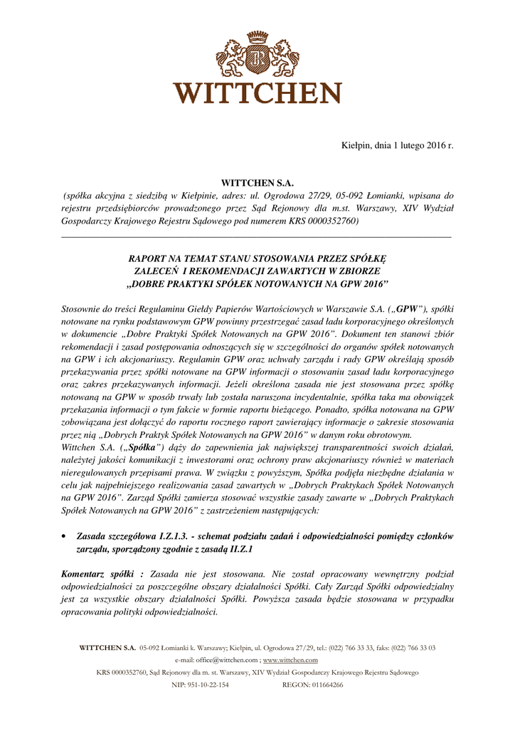 Kiełpin, dnia 1 lutego 2016 r. WITTCHEN S.A. (spółka akcyjna z siedzibą w Kiełpinie, adres: ul. Ogrodowa 27/29, 05-092 Łomianki, wpisana do rejestru przedsiębiorców prowadzonego przez Sąd Rejonowy dla m.st. Warszawy, XIV Wydział Gospodarczy Krajowego Rejestru Sądowego pod numerem KRS 0000352760) __________________________________________________________________________________ RAPORT NA TEMAT STANU STOSOWANIA PRZEZ SPÓŁKĘ ZALECEŃ I REKOMENDACJI ZAWARTYCH W ZBIORZE „DOBRE PRAKTYKI SPÓŁEK NOTOWANYCH NA GPW 2016” Stosownie do treści Regulaminu Giełdy Papierów Wartościowych w Warszawie S.A. („GPW”), spółki notowane na rynku podstawowym GPW powinny przestrzegać zasad ładu korporacyjnego określonych w dokumencie „Dobre Praktyki Spółek Notowanych na GPW 2016”. Dokument ten stanowi zbiór rekomendacji i zasad postępowania odnoszących się w szczególności do organów spółek notowanych na GPW i ich akcjonariuszy. Regulamin GPW oraz uchwały zarządu i rady GPW określają sposób przekazywania przez spółki notowane na GPW informacji o stosowaniu zasad ładu korporacyjnego oraz zakres przekazywanych informacji. Jeżeli określona zasada nie jest stosowana przez spółkę notowaną na GPW w sposób trwały lub została naruszona incydentalnie, spółka taka ma obowiązek przekazania informacji o tym fakcie w formie raportu bieżącego. Ponadto, spółka notowana na GPW zobowiązana jest dołączyć do raportu rocznego raport zawierający informacje o zakresie stosowania przez nią „Dobrych Praktyk Spółek Notowanych na GPW 2016” w danym roku obrotowym. Wittchen S.A. („Spółka”) dąży do zapewnienia jak największej transparentności swoich działań, należytej jakości komunikacji z inwestorami oraz ochrony praw akcjonariuszy również w materiach nieregulowanych przepisami prawa. W związku z powyższym, Spółka podjęła niezbędne działania w celu jak najpełniejszego realizowania zasad zawartych w „Dobrych Praktykach Spółek Notowanych na GPW 2016”. Zarząd Spółki zamierza stosować wszystkie zasady zawarte w „Dobrych Praktykach Spółek Notowanych na GPW 2016” z zastrzeżeniem następujących: • Zasada szczegółowa I.Z.1.3. - schemat podziału zadań i odpowiedzialności pomiędzy członków zarządu, sporządzony zgodnie z zasadą II.Z.1 Komentarz spółki : Zasada nie jest stosowana. Nie został opracowany wewnętrzny podział odpowiedzialności za poszczególne obszary działalności Spółki. Cały Zarząd Spółki odpowiedzialny jest za wszystkie obszary działalności Spółki. Powyższa zasada będzie stosowana w przypadku opracowania polityki odpowiedzialności. WITTCHEN S.A. 05-092 Łomianki k. Warszawy; Kiełpin, ul. Ogrodowa 27/29, tel.: (022) 766 33 33, faks: (022) 766 33 03 e-mail: [email protected] ; www.wittchen.com KRS 0000352760, Sąd Rejonowy dla m. st. Warszawy, XIV Wydział Gospodarczy Krajowego Rejestru Sądowego NIP: 951-10-22-154 REGON: 011664266 • Zasada szczegółowa I.Z.1.11. - informację o treści obowiązującej w spółce reguły dotyczącej zmieniania podmiotu uprawnionego do badania sprawozdań finansowych, bądź też o braku takiej reguły Komentarz Spółki: Zasada nie jest stosowana. Spółka nie publikuje na stronie internetowej informacji w powyższym zakresie. Wybór podmiotów uprawnionych do badania finansowego każdorazowo zależy od suwerennych decyzji organów Spółki. • Zasada szczegółowa I.Z.1.15. - informację zawierającą opis stosowanej przez spółkę polityki różnorodności w odniesieniu do władz spółki oraz jej kluczowych menedżerów; opis powinien uwzględniać takie elementy polityki różnorodności, jak płeć, kierunek wykształcenia, wiek, doświadczenie zawodowe, a także wskazywać cele stosowanej polityki różnorodności i sposób jej realizacji w danym okresie sprawozdawczym; jeżeli spółka nie opracowała i nie realizuje polityki różnorodności, zamieszcza na swojej stronie internetowej wyjaśnienie takiej decyzji Komentarz Spółki: Zasada nie jest stosowana. Spółka nie posiada opracowanej polityki różnorodności. Spółka zatrudnia osoby posiadające odpowiednie kwalifikacje oraz doświadczenie zawodowe nie różnicując wieku lub płci. Wybór kadr zależy w zupełności od osiągnięć, skuteczności oraz profesjonalizmu poszczególnych kandydatów. • Zasada szczegółowa I.Z.1.16. - informację na temat planowanej transmisji obrad walnego zgromadzenia - nie później niż w terminie 7 dni przed datą walnego zgromadzenia Komentarz spółki : Zasada nie jest stosowana. Brak zastosowania się Spółki do powyższej zasady motywowany jest wysokim kosztem zapewnienia odpowiedniego sprzętu i możliwości technicznych, pozwalających na realizowanie wynikających z niej obowiązków, niewspółmierne do ewentualnych korzyści płynących dla akcjonariuszy. Mając na względzie powyższe w najbliższym czasie zapis przebiegu obrad walnego zgromadzenia w formie audio lub wideo nie będzie zamieszczony na internetowej stronie korporacyjnej Spółki. Spółka przestrzega obowiązującego w tym zakresie Statutu, przepisów prawa oraz prowadzi stosowną politykę informacyjną. • Zasada szczegółowa I.Z.1.19. - pytania akcjonariuszy skierowane do zarządu w trybie art. 428 § 1 lub § 6 Kodeksu spółek handlowych, wraz z odpowiedziami zarządu na zadane pytania, bądź też szczegółowe wskazanie przyczyn nieudzielenia odpowiedzi, zgodnie z zasadą IV.Z.13 Komentarz Spółki: Zasada nie jest stosowana. Spółka przestrzega powyższą zasadę w zakresie przewidzianym właściwymi ustawami tj. Kodeksem spółek handlowych oraz Rozporządzeniem Ministra Finansów z dnia 19.02.2009 r. w sprawie informacji bieżących i okresowych przekazywanych przez emitentów papierów wartościowych oraz warunków uznawania za równoważne informacji wymaganych przepisami prawa państwa niebędącego państwem członkowskim. Spółka nie prowadzi WITTC