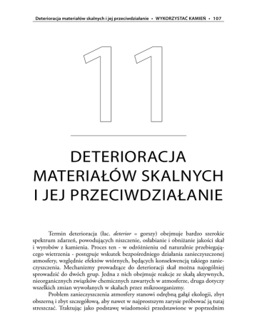 Deterioracja materiałów skalnych i jej przeciwdziałanie • WYKORZYSTAĆ KAMIEŃ • 107 DETERIORACJA MATERIAŁÓW SKALNYCH I JEJ PRZECIWDZIAŁANIE Termin deterioracja (łac. deterior = gorszy) obejmuje bardzo szerokie spektrum zdarzeń, powodujących niszczenie, osłabianie i obniżanie jakości skał i wyrobów z kamienia. Proces ten - w odróżnieniu od naturalnie przebiegającego wietrzenia - postępuje wskutek bezpośredniego działania zanieczyszczonej atmosfery, względnie efektów wtórnych, będących konsekwencją takiego zanieczyszczenia. Mechanizmy prowadzące do deterioracji skał można najogólniej sprowadzić do dwóch grup. Jedna z nich obejmuje reakcje ze skałą aktywnych, nieorganicznych związków chemicznych zawartych w atmosferze, druga dotyczy wszelkich zmian wywołanych w skałach przez mikroorganizmy. Problem zanieczyszczenia atmosfery stanowi odrębną gałąź ekologii, zbyt obszerną i zbyt szczegółową, aby nawet w najprostszym zarysie próbować ją tutaj streszczać. Traktując jako podstawę wiadomości przedstawione w poprzednim 108 • WYKORZYSTAĆ KAMIEŃ • Deterioracja materiałów skalnych i jej przeciwdziałanie rozdziale, teraz można tylko ograniczyć się do zwrócenia uwagi na efekty oddziaływania atmosfery na materiał skalny, z podkreśleniem niebagatelnej roli omówionych już wcześniej kwaśnych deszczy. Zawarte w powietrzu agresywne pyły i gazy powodują znaczne zniszczenia w zabytkach i współczesnych budowlach wykonanych z kamienia, zwłaszcza w słabo przewietrzanej, ciasnej zabudowie miejskiej. Szczególnie niebezpieczne pod tym względem są dwutlenek siarki (SO2) i tlenki azotu (NOx), które w połączeniu z parą wodną przechodzą w bardzo agresywne kwasy. W reakcji z niektórymi minerałami skał porowatych, kwasy te powodują krystalizację wielu soli, zmieniających w znacznej mierze skład chemiczny, parametry techniczne i wygląd zewnętrzny. W przypadku niektórych soli ważną rolę odgrywa ich siła krystalizacji, działająca mechanicznie na skały, czyli podobnie jak woda w procesie zamarzania (por. rozdział o wietrzeniu). Należy zatem pamiętać, że powierzchnie porowate i spękane skał są znacznie bardziej podatne na destrukcję niż powierzchnie gładkie. Objawy oddziaływania zanieczyszczonej atmosfery na skały i wyroby ze skał są bardzo zróżnicowane i szczegółowe ich omówienie nie mieści się w ramach tego opracowania. W odniesieniu do najczęściej spotykanych i używanych do wyrobów skał, najogólniej można jedynie przyjąć, że w przypadku czarnych odmian wapieni są to najczęściej odbarwienia, a przy odmianach wielobarwnych - zmiana kontrastu. We wszystkich skałach zawierających węglan wapnia obserwuje się dość powszechną krystalizacją wykwitów gipsowych. Proces ten wpływa nie tylko na wygląd zewnętrzny, ale też na zmianę struktury wewnętrznej skały, ponieważ dochodzi wówczas do rozpuszczenia i wypłukiwania węglan wapnia (CaCO3) oraz zastąpienia go nierozpuszczalnym gipsem (CaSO4 x 2H2O). Fot. 11.1 Wpływ kwaśnych deszczy na elewację z trawertynu. Deterioracja materiałów skalnych i jej przeciwdziałanie • WYKORZYSTAĆ KAMIEŃ • 109 Fot. 11.1 przedstawia wpływ kwaśnych deszczy na elewacje z trawertynu. Białe ślady tworzą się w miejscach gdzie duża ilość wody, znacznie większa niż na reszcie fasady, ma kontakt z zabrudzonym kamieniem. Ma to miejsce przy parapetach (woda z okien spływa bokami parapetów) i na całym poziomym pasie nad dolnym gzymsem (woda odbija się od obróbki blacharskiej). Z jednej strony kwaśny deszcz powoduje rozpuszczenie zanieczyszczeń pyłowych a z drugiej strony zachodzi tu, opisany wyżej, mechanizm chemiczny, czyli reakcja wymiany w związkach wapiennych anionu węglanowego na siarczanowy. Wyraźnie widać jasne nacieki zalepiające wszelkie pory, szczelinki i tworzące naskorupienia. Piaskowce o spoiwie węglanowym ulegają dezintegracji i eksfoliacji, natomiast pozbawione takiego spoiwa, pokrywają się czarną, szarą lub brunatną patyną. Fot. 11.2 Porównanie piaskowców pokrytych patyną i ulegających eksfoliacji, z tymi samymi ale po oczyszczeniu i renowacji. Efekty oddziaływania zanieczyszczonej atmosfery widoczne są też w obszarach pozamiejskich. Tam powierzchnia wapieni również wyraźnie zmienia kolor, a piaskowce ulegają stopniowemu rozpadowi. Istotną różnicę stanowi jednak mniejszy udział gipsu w warstwach przypowierzchniowych, a w wykwitach gipsowych mniejsza zawartość czarnego pigmentu pyłowego, a więcej barwników organicznych. Prędkość, z jaką skały ulegają rozkładowi na skutek deterioracji, jest najprawdopodobniej większa niż w przypadku wietrzenia. Dokładna ocena tego 110 • WYKORZYSTAĆ KAMIEŃ • Deterioracja materiałów skalnych i jej przeciwdziałanie parametru jest jednak bardzo trudna, zważywszy, że stopień zanieczyszczenia atmosfery jest różny w rozmaitych miejscach i z upływem czasu ulega zmianom. Poza tym, mówiąc o wietrzeniu musimy uwzględnić fakt, że zachodzi ono w konkretnej atmosferze, która do pewnego stopnia bywa zanieczyszczona. Tak więc efekty deterioracji wzmagają poniekąd efekty wietrzenia i w ten sposób oba procesy wzajemnie się nakładają. Mechaniczne niszczenie skał, wywołane wzrostem korzeni roślin, jest ogólnie znane i dobrze zrozumiałe (por. rozdział o wietrzeniu). Efekty działania mechanicznego i metabolicznego mikroorganizmów są tymczasem znacznie gorzej zbadane. Materiał skalny ulega jednak niszczeniu także za sprawą bakterii, grzybów, glonów i porostów, czyli procesowi biodeterioracji (gr. bíos = życie + łac. deterior = gorszy). Problemem wydaje się tylko, czy wzrost mikroorganizmów na skałach to przyczyna, czy też skutek powierzchniowego zniszczenia podłoża. Porosty bardzo często pokrywają materiał skalny, a intensywne skutki ich oddziaływania widać zwykle na utworach węglanowych. Jednym z pr