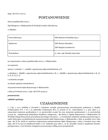Sygn. akt II Ca 702/14 POSTANOWIENIE Dnia 9 października 2014 r. Sąd Okręgowy w Białymstoku II Wydział Cywilny Odwoławczy w składzie: Przewodniczący: SSO Barbara Puchalska (spr.) Sędziowie: SSO Bożena Sztomber SSO Bogdan Łaszkiewicz Protokolant: st. sekr. sąd. Monika Gąsowska po rozpoznaniu w dniu 9 października 2014 r. w Białymstoku na rozprawie sprawy z wniosku (...) spółki z ograniczoną odpowiedzialnością w B. z udziałem (...)Spółki z ograniczoną odpowiedzialnością w B., (...)Spółki z ograniczoną odpowiedzialnością w B., K. S., Ś. D. S.i Ł. S. o uchylenie zarządu na skutek apelacji wnioskodawcy od postanowienia Sądu Rejonowego w Białymstoku z dnia 30 kwietnia 2014 r. sygn. akt II Ns 5125/13 postanawia: oddalić apelację. UZASADNIENIE (...) Sp. z o.o.z siedzibą w B.wniósł o uchylenie zarządu przymusowego nieruchomości położonej w obrębie ewidencyjnym S.P.. ( nr (...)), jednostka ewidencyjna B.((...)), powiat m. B., województwo (...), przy ulicy (...), oznaczonej numerem geodezyjnym (...)o powierzchni 0,0497 ha oraz numerem geodezyjnym (...)o powierzchni 0,0231 ha , zabudowanej budynkiem handlowo usługowym , dla której w Sądzie Rejonowym w Białymstoku IX Wydziale Ksiąg Wieczystych prowadzona jest księga wieczysta (...), ewentualnie uchylenie zarządu przymusowego w części dotyczącej wyodrębnionych postanowieniem Sądu Rejonowego w Białymstoku z dnia 31 grudnia 2012 roku sygn. akt II Ns 2678/10 częściowo zmienionym postanowieniem Sądu Okręgowego z dnia 5 września 2013 roku sygn. akt II Ca 257/13 odrębnych lokali w ww. budynku przy ulicy (...)w B.; ponadto wnosił o zasądzenie kosztów postępowania, w tym kosztów zastępstwa procesowego według norm przepisanych. W uzasadnieniu wniosku wskazał, iż w związku z uprawomocnieniem się postanowienia Sądu Rejonowego w Białymstoku z dnia 31 grudnia 2012 roku w sprawie o sygn. akt II Ns 2678/10 ustanawiającego odrębną własność lokali w budynku przy ulicy (...) w B., wystąpiły przesłanki wynikające z art. 614 kpc uzasadniające uchylenie zarządu dla przedmiotowej nieruchomości (k.2-2v). Uczestnik postępowania (...)Spółka z ograniczoną odpowiedzialnością w B.poparł wniosek o uchylenie zarządu przymusowego (k.45). Uczestnicy postępowania K. S.i Ś. D. S.wnieśli o oddalenie wniosku w całości – wskazali, iż ich zdaniem nie wystąpiły przesłanki wynikające z art. 614 kpc, ponieważ wnioskodawca narusza art. 144 kc poprzez dokonywanie przeróbek instalacji centralnego ogrzewania oraz odłączania ciepła (k.34-34v). Uczestnicy postępowania (...) Spółka z ograniczona odpowiedzialnością w B.i Ł. S.nie zajęli stanowiska w sprawie. Postanowieniem z dnia 30 kwietnia 2014 r. Sąd Rejonowy w Białymstoku oddalił wniosek i stwierdził , iż zainteresowani we własnym zakresie ponoszą koszty postępowania związane ze swym udziałem w sprawie . Sąd I instancji wskazał ,że nieruchomość położona w obrębie ewidencyjnym S.P.. ( nr (...)), jednostka ewidencyjna B.( (...)), powiat m. B., województwo (...), przy ulicy (...), oznaczona numerem geodezyjnym (...)o powierzchni 0,0497 ha oraz numerem geodezyjnym (...)o powierzchni 0,0231 ha, zabudowana budynkiem handlowo usługowym, dla której w Sądzie Rejonowym w Białymstoku IX Wydziale Ksiąg Wieczystych prowadzona jest księga wieczysta (...), stanowi współwłasność: (...)" Spółki z ograniczoną odpowiedzialnością w B.z udziałem w 21/30 częściach, (...) Spółki z ograniczoną odpowiedzialnością w B.z udziałem 6/30 części, K. S.z udziałem w 1/80 części, Ł. S.z udziałem w 3/80 części, K. S.i Ś. S.( wspólność ustawowa małżeńska ) z udziałem w 3/60 części. Mocą postanowienia Sądu Rejonowego w Białymstoku z dnia 29 lipca 2008 roku w sprawie o sygn. akt II Ns 2995/07 wyznaczono na zarządcę ww. nieruchomości (...)” Spółkę z ograniczoną odpowiedzialnością w B., ul. (...)w B.(k.358-359 akt sprawy o sygn. II Ns 2995/07 Sądu Rejonowego w Białymstoku). Postanowieniem z dnia 13 listopada 2008 roku w sprawie o sygn. akt II Ca 667/08, Sąd Okręgowy w Białymstoku oddalił apelację uczestnika postępowania (...) Spółki z ograniczoną odpowiedzialnością w B. od postanowienia Sądu Rejonowego w Białymstoku z dnia 29 lipca 2008 roku w sprawie o sygn. akt II Ns 2995/07 (k.408 akt sprawy o sygn. II Ns 2995/07 Sądu Rejonowego w Białymstoku). Sąd Rejonowy wskazał też ,że na mocy postanowienia Sądu Rejonowego w Białymstoku z dnia 31 grudnia 2012 roku w sprawie o sygn. akt II Ns 2678/10, zmienionego postanowieniem Sądu Okręgowego w Białymstoku z dnia 5 września 2013 roku sygn. akt II Ca 257/13, dokonano zniesienia współwłasności przedmiotowej nieruchomości w ten sposób, że w budynku handlowo – usługowym ustanowiono odrębną własność lokali - zgodnie z opinią sporządzoną przez biegłego sądowego W. J.znajdującą się na k 225, 227 – 229 akt oraz opinią biegłego sądowego J. J.k. 561 akt i przyznano na rzecz wnioskodawcy (...) Spółki z ograniczoną odpowiedzialnościąw B.własność: lokalu nr (...)znajdującego się w piwnicy budynku składającego się z pomieszczeń oznaczonych numerami (...)o łącznej powierzchni 158,11m2 wraz z udziałem w 15811/85080 częściach we współwłasności części wspólnych budynku i urządzeń nie służących do wyłącznego korzystania poszczególnych właścicieli lokali oraz we współwłasności nieruchomości oznaczonej numerem geodezyjnym (...), lokalu numer (...)znajdującego się na parterze budynku składającego się z pomieszczeń oznaczonych numerami (...)o łącznej powierzchni 82,46 m2, wraz z udziałem w 8246/85080 częściach we współwłasności części wspólnych budynku i urządzeń nie służących do wyłącznego korzystania poszczególnych właścicieli lokali oraz we współwłasności nieruchomości oznaczonej numerem geodezyjnym (...), lokal nr (...)znajdującego się n