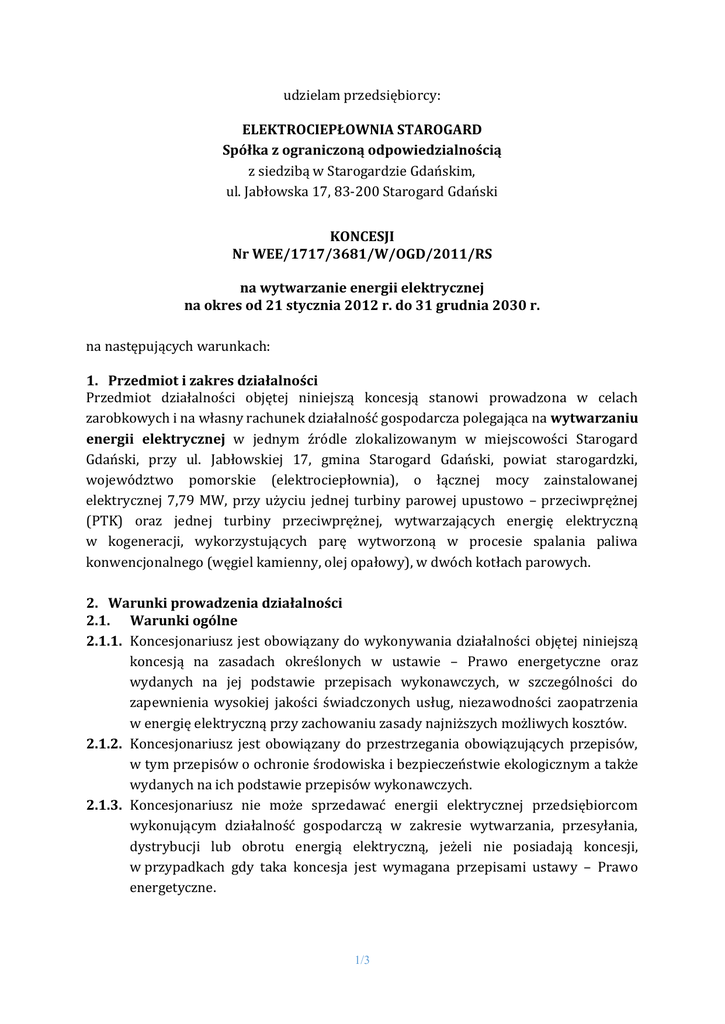 udzielam przedsiębiorcy: ELEKTROCIEPŁOWNIA STAROGARD Spółka z ograniczoną odpowiedzialnością z siedzibą w Starogardzie Gdańskim, ul. Jabłowska 17, 83-200 Starogard Gdański KONCESJI Nr WEE/1717/3681/W/OGD/2011/RS na wytwarzanie energii elektrycznej na okres od 21 stycznia 2012 r. do 31 grudnia 2030 r. na następujących warunkach: 1. Przedmiot i zakres działalności Przedmiot działalności objętej niniejszą koncesją stanowi prowadzona w celach zarobkowych i na własny rachunek działalność gospodarcza polegająca na wytwarzaniu energii elektrycznej w jednym źródle zlokalizowanym w miejscowości Starogard Gdański, przy ul. Jabłowskiej 17, gmina Starogard Gdański, powiat starogardzki, województwo pomorskie (elektrociepłownia), o łącznej mocy zainstalowanej elektrycznej 7,79 MW, przy użyciu jednej turbiny parowej upustowo – przeciwprężnej (PTK) oraz jednej turbiny przeciwprężnej, wytwarzających energię elektryczną w kogeneracji, wykorzystujących parę wytworzoną w procesie spalania paliwa konwencjonalnego (węgiel kamienny, olej opałowy), w dwóch kotłach parowych. 2. Warunki prowadzenia działalności 2.1. Warunki ogólne 2.1.1. Koncesjonariusz jest obowiązany do wykonywania działalności objętej niniejszą koncesją na zasadach określonych w ustawie – Prawo energetyczne oraz wydanych na jej podstawie przepisach wykonawczych, w szczególności do zapewnienia wysokiej jakości świadczonych usług, niezawodności zaopatrzenia w energię elektryczną przy zachowaniu zasady najniższych możliwych kosztów. 2.1.2. Koncesjonariusz jest obowiązany do przestrzegania obowiązujących przepisów, w tym przepisów o ochronie środowiska i bezpieczeństwie ekologicznym a także wydanych na ich podstawie przepisów wykonawczych. 2.1.3. Koncesjonariusz nie może sprzedawać energii elektrycznej przedsiębiorcom wykonującym działalność gospodarczą w zakresie wytwarzania, przesyłania, dystrybucji lub obrotu energią elektryczną, jeżeli nie posiadają koncesji, w przypadkach gdy taka koncesja jest wymagana przepisami ustawy – Prawo energetyczne. 1/3 2.1.4. Koncesjonariusz jest obowiązany do wykonywania działalności w sposób nie powodujący zagrożenia dla życia lub zdrowia ludzkiego oraz nie narażający na powstanie szkód materialnych. 2.1.1. Koncesjonariusz nie będzie subsydiować działalności nie objętej niniejszą koncesją z przychodu osiąganego z działalności objętej tą koncesją. 2.2. Szczególne warunki wykonywania działalności objętej koncesją ze względu na właściwą obsługę odbiorców 2.2.1. Koncesjonariusz jest obowiązany do spełnienia technicznych warunków wytwarzania energii elektrycznej określonych w odrębnych przepisach, w szczególności do utrzymywania obiektów, instalacji i urządzeń w należytym stanie technicznym, umożliwiającym wytwarzanie energii elektrycznej w sposób ciągły i niezawodny, przy zachowaniu obowiązujących przepisów określających wymogi techniczne, jakościowe i ochrony środowiska, z uwzględnieniem uzasadnionego poziomu kosztów. 2.2.2. Koncesjonariusz jest obowiązany do zapewnienia, aby czynności w zakresie samodzielnej eksploatacji instalacji i urządzeń wykonywały wyłącznie osoby legitymujące się posiadaniem wymaganych w tym zakresie kwalifikacji. 2.2.3. Koncesjonariusz jest obowiązany do utrzymywania lub zagwarantowania możliwości pozyskania środków finansowych lub majątku pozwalającego na zaspokojenie roszczeń osób trzecich mogących powstać wskutek niewłaściwego wykonywania działalności objętej koncesją, w tym szkód w środowisku. 2.3. Warunki zaprzestania działalności po wygaśnięciu koncesji lub jej cofnięciu 2.3.1. Koncesjonariusz nie później niż na 18 miesięcy przed upływem ważności koncesji i zaprzestaniem działalności spowoduje opracowanie na własny koszt i przedstawi Prezesowi URE analizy: 1) techniczną, 2) finansową (wraz z opinią i raportem biegłego rewidenta z przeprowadzonego badania sprawozdania finansowego Koncesjonariusza za ostatni rok działalności - jeśli obowiązek badania tego sprawozdania wynika z przepisów ustawy z dnia 29 września 1994 r. o rachunkowości - Dz. U. z 2002 r. Nr 76, poz. 694 z późn. zm.), 3) wpływu na środowisko, w zakresie wykonywanej działalności koncesjonowanej, które określą w szczególności stan wywiązania się Koncesjonariusza ze zobowiązań względem osób trzecich na dzień przewidywanego zakończenia tej działalności. 2.3.2. Koncesjonariusz jest obowiązany do realizacji wniosków i zaleceń wynikających z powyższych analiz, w najkrótszym możliwym terminie. 2.3.3. Koncesjonariusz jest obowiązany po zaprzestaniu działalności koncesjonowanej do likwidacji skutków swojej działalności, w szczególności w zakresie rekultywacji gruntów, przywrócenia rzeźby terenu do właściwego stanu, utylizacji odpadów niebezpiecznych. 2/3 2.3.4. Koncesjonariusz, w terminie 18 miesięcy przed planowaną datą zaprzestania działalności koncesjonowanej, opracuje i przedstawi Prezesowi URE plan działań, o których mowa w punkcie 2.3.3., z podaniem źródeł ich finansowania. W przypadku wystąpienia istotnych zmian warunków, na podstawie których powyższy plan został sporządzony, Koncesjonariusz jest obowiązany do jego niezwłocznej aktualizacji. 2.4. Sprawozdawczość i udzielanie informacji 2.4.1. Koncesjonariusz jest obowiązany zawiadomić Prezesa URE o zmianach dotyczących wykonywanej działalności objętej niniejszą koncesją (w tym w szczególności firmy, siedziby, numeru w ewidencji działalności gospodarczej, numeru identyfikacji podatkowej, rozszerzenia bądź ograniczenia tej działalności) nie później niż 14 dni od dnia ich powstania. 2.4.2. Koncesjonariusz jest obowiązany do pisemnego poinformowania Prezesa URE o zamiarze zaprzestania działalności koncesjonowanej nie później niż na 18 miesięcy przed przewidywaną datą zaprzestania 