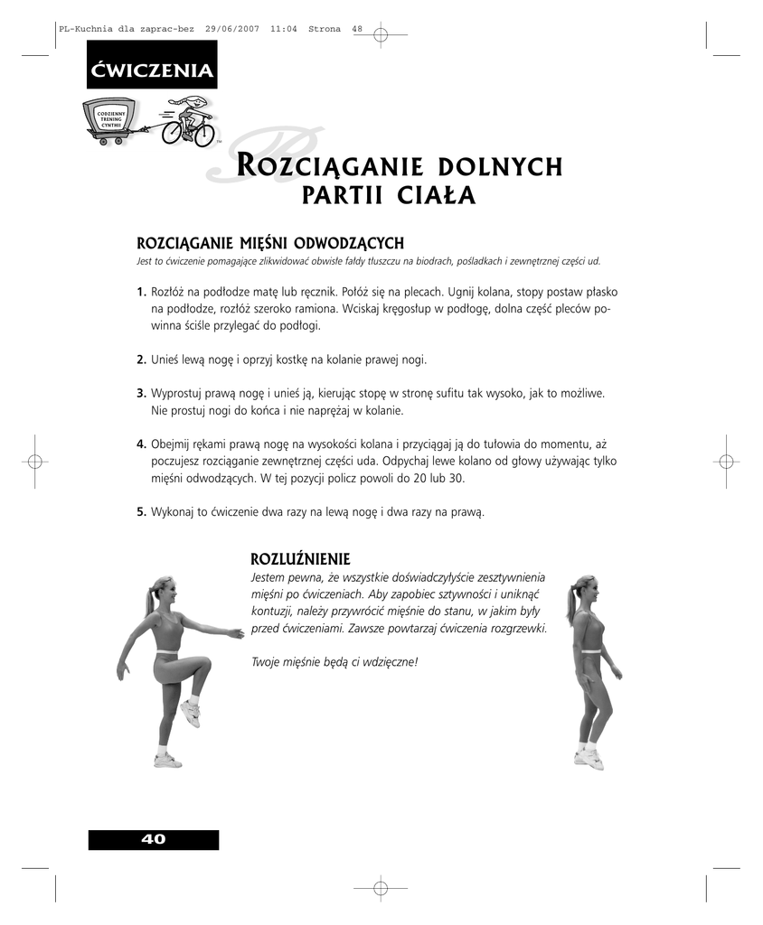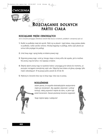 PL-Kuchnia dla zaprac-bez 29/06/2007 11:04 Strona 48 åWICZENIA CODZIENNY TRENING CYNTHII ™ R R OZCIÑGANIE DOLNYCH PARTII CIA¸ A ROZCIÑGANIE MI¢ÂNI ODWODZÑCYCH Jest to çwiczenie pomagajàce zlikwidowaç obwis∏e fa∏dy t∏uszczu na biodrach, poÊladkach i zewn´trznej cz´Êci ud. 1. Roz∏ó˝ na pod∏odze mat´ lub r´cznik. Po∏ó˝ si´ na plecach. Ugnij kolana, stopy postaw p∏asko na pod∏odze, roz∏ó˝ szeroko ramiona. Wciskaj kr´gos∏up w pod∏og´, dolna cz´Êç pleców powinna ÊciÊle przylegaç do pod∏ogi. 2. UnieÊ lewà nog´ i oprzyj kostk´ na kolanie prawej nogi. 3. Wyprostuj prawà nog´ i unieÊ jà, kierujàc stop´ w stron´ sufitu tak wysoko, jak to mo˝liwe. Nie prostuj nogi do koƒca i nie napr´˝aj w kolanie. 4. Obejmij r´kami prawà nog´ na wysokoÊci kolana i przyciàgaj jà do tu∏owia do momentu, a˝ poczujesz rozciàganie zewn´trznej cz´Êci uda. Odpychaj lewe kolano od g∏owy u˝ywajàc tylko mi´Êni odwodzàcych. W tej pozycji policz powoli do 20 lub 30. 5. Wykonaj to çwiczenie dwa razy na lewà nog´ i dwa razy na prawà. ROZLUèNIENIE Jestem pewna, ˝e wszystkie doÊwiadczy∏yÊcie zesztywnienia mi´Êni po çwiczeniach. Aby zapobiec sztywnoÊci i uniknàç kontuzji, nale˝y przywróciç mi´Ênie do stanu, w jakim by∏y przed çwiczeniami. Zawsze powtarzaj çwiczenia rozgrzewki. Twoje mi´Ênie b´dà ci wdzi´czne! 40 PL-Kuchnia dla zaprac-bez 29/06/2007 11:04 Strona 49 1. TYDZIE¡ WTOREK W PLAN ÂNIADANIE GRY Dzieƒ dobry! JeÊli jeszcze nie przygotowa∏aÊ swojego lanczu, zrób to teraz. W lodówce powinny byç jaja ugotowane na twardo (przygotowa∏aÊ je wczoraj wieczorem). Pe∏noziarnisty obwarzanek, serek homogenizowany chudy, d˝em „tylko z owoców”, sok owocowy (do wyboru), mleko LANCZ Nasza „firmowa” kanapka z sa∏atkà jajecznà, zielona papryka i marchewka, owoc (do wyboru) OBIAD Kurczak z kremem musztardowym Dijon, pieczony ziemniak ze Êmietanà i szczypiorkiem, pieczona marchewka, fili˝anka owoców mieszanych Mi∏ego dnia! PRZEKÑSKA ... ciàg dalszy na str. 43 T∏u w szcz gra ma ch Pe∏noziarnisty obwarzanek 152 31,5 5,5 0,6 Serek homogenizowany chudy – 1 ∏y˝eczka do herbaty (15 ml) 11,9 2 0,9 0 D˝em „tylko z owoców” 43 11 0,1 0 Sok owocowy (do wyboru) 80 20 1 0 Mleko 86 11,9 8,3 0,4 Nasza „firmowa” kanapka z sa∏atkà jajecznà Stosowane normy: patrz str. 6 POZYCJE MENU (1 porcja) W´ wo glow dan gra y ma ch Bia w ∏ko gra ma ch Kil ok alo rie WARTOÂå OD˚YWCZA PRODUKTÓW 212 27,4 12,9 6,7 Zielona papryka – 1/4 5 1,2 0,2 0 Marchewka – 1 Êrednia 31 7,3 0,7 0,1 Owoc (do wyboru) 81 21 0,2 0,5 Kurczak z kremem musztardowym Dijon 179 3,3 29,5 4,4 Pieczony ziemniak 76 17,1 2,1 0,1 Âmietana kwaÊna odt∏uszczona ze szczypiorkiem 19 3,1 2,1 0 Marchewka pieczona 62 14,6 1,4 0,2 Fili˝anka owoców mieszanych 91 23,2 1 0 Batony figowe – 2 120 22 2 2 Mleko 86 11,9 8,3 0,4 1335 228,5 76,2 15,4 Ogó∏em na dzieƒ Procentowy udzia∏ energii z t∏uszczu Æ 10 PAMI¢TAJ, jest to minimalne zapotrzebowanie kaloryczne wed∏ug norm podanych przez kanadyjski Przewodnik ˝ywieniowy i amerykaƒskà Piramid´ ˝ywieniowà. Niektórzy ludzie potrzebujà wi´cej kalorii. Batony figowe, mleko Batony figowe: batoniki te, dost´pne w handlu, zawierajà bardzo ma∏o t∏uszczu i sà wspania∏à przekàskà, gdy nagle weêmie ci´ ch´tka na czekoladowe co nieco. Zalecana porcja sk∏ada si´ z 2 batoników. Nie zapomnij, ˝e w lodówce masz pojemnik pe∏en warzyw na przekàsk´ (czyli „po˝ywienie myszy”). 41 PL-Kuchnia dla zaprac-bez 29/06/2007 11:04 Strona 50 1. TYDZIE¡ WTOREK W NASZA „FIRMOWA” KANAPKA Z SA¸ATKÑ JAJECZNÑ Nasza metoda gotowania jaj na twardo zapobiega ciemnieniu ˝ó∏tek: JeÊli musisz przygotowaç wi´cej ni˝ jednà kanapk´ dla ka˝dej osoby, a chcesz byç dobra dla swojego serca, dodaj do sa∏atki 1 bia∏ko jaja na ka˝dà dodatkowà kanapk´. Ka˝de odrzucone ˝ó∏tko to mniej t∏uszczu o 5,6 g i cholesterolu o 272 mg. • • • • • Przek∏uj szpilkà szerszy koniec ka˝dego jaja. W∏ó˝ jaja do garnka z zimnà wodà i zagotuj je – przykryj. ZgaÊ ogieƒ, ale nie zdejmuj garnka z palnika przez 15 minut. Odlej wod´ i ponownie nalej do garnka zimnej wody – rozbij skorupki. Pozostaw jaja w zimnej wodzie do czasu, a˝ ca∏kowicie ostygnà, odlej wod´ – przechowuj jaja w lodówce. 2 jaja, ugotowane na twardo, bez skorupek 2 ∏y˝ki sto∏owe Êmietana odt∏uszczona 2 30 ml 2 ∏y˝ki sto∏owe seler, pokrajany w kostk´ 30 ml 1 ∏y˝ka sto∏owa dymka, posiekana 15 ml szczypta sól szczypta szczypta pieprz czarny szczypta 4 kromki pe∏noziarnistego chleba 4 Podawaj z: 1 papryka zielona Êrednia, pokrajana wzd∏u˝ w paski 2 marchewka, Êrednia, pokrajana wzd∏u˝ w paski /2 1 1. Rozetrzyj jaja w Êredniej wielkoÊci misce. Dodaj wszystkie pozosta∏e sk∏adniki. Dobrze wymieszaj. 2. Po∏ow´ pasty rozsmaruj na kromce pe∏noziarnistego chleba. Po∏ó˝ na wierzchu drugà kromk´. W ten sam sposób przygotuj drugà kanapk´. 3. Podawaj z zielonà paprykà i marchewkà. Przepis na 2 kanapki. 1 porcja = 1 kanapka z po∏ówkà papryki i marchewki. ¸atwo zwi´kszyç liczb´ porcji. 42 /2 2 PL-Kuchnia dla zaprac-bez 29/06/2007 11:04 Strona 51 1. TYDZIE¡ WTOREK W ... ciàg dalszy ze str. 41 PIECZONE ZIEMNIAKI ZE ÂMIETANÑ I SZCZYPIORKIEM JeÊli chcesz zmieniç nieco smak i zwi´kszyç iloÊç witaminy A, zastàp ziemniaki jamem (pochrzyn, ignam) lub s∏odkimi ziemniakami (batatami). 4 ziemniaki, Êrednie, umyte (nak∏uj skórk´, aby nie pop´ka∏a) 1 Êmietana odt∏uszczona 1 Êwie˝y szczypiorek (lub dymka) drobno pokrajany /2 fili˝anki /4 fili˝anki 4 125 ml 50 ml 1. Rozgrzej piekarnik do temperatury 180°C. 2. U∏ó˝ ziemniaki na kratce i piecz przez 60 minut. 3. Podawaj ze Êmietanà i szczypiorkiem. CzeÊç! Znowu si´ widzimy. T´skniliÊmy za tobà. Zacznij gotowanie obiadu od w∏o˝enia ziemniaków i marche