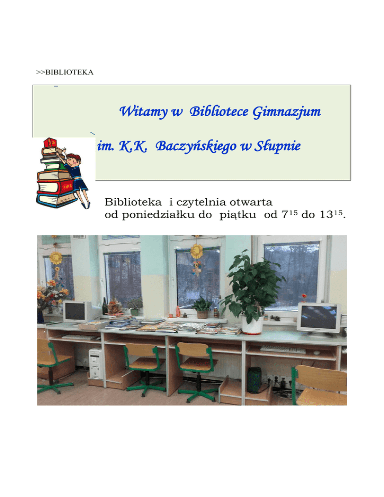 Witamy w Bibliotece Gimnazjum im. K.K. Baczyńskiego w Słupnie