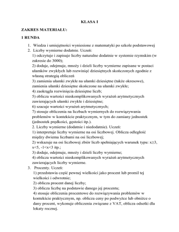 KLASA I ZAKRES MATERIAŁU: 1 RUNDA 1. Wiedza i umiejętności wyniesione z matematyki po szkole podstawowej 2. Liczby wymierne dodatnie. Uczeń: 1) odczytuje i zapisuje liczby naturalne dodatnie w systemie rzymskim (w zakresie do 3000); 2) dodaje, odejmuje, mnoży i dzieli liczby wymierne zapisane w postaci ułamków zwykłych lub rozwinięć dziesiętnych skończonych zgodnie z własną strategią obliczeń 3) zamienia ułamki zwykłe na ułamki dziesiętne (także okresowe), zamienia ułamki dziesiętne skończone na ułamki zwykłe; 4) zaokrągla rozwinięcia dziesiętne liczb; 5) oblicza wartości nieskomplikowanych wyrażeń arytmetycznych zawierających ułamki zwykłe i dziesiętne; 6) szacuje wartości wyrażeń arytmetycznych; 7) stosuje obliczenia na liczbach wymiernych do rozwiązywania problemów w kontekście praktycznym, w tym do zamiany jednostek (jednostek prędkości, gęstości itp.). 2. Liczby wymierne (dodatnie i niedodatnie). Uczeń: 1) interpretuje liczby wymierne na osi liczbowej. Oblicza odległość między dwiema liczbami na osi liczbowej; 2) wskazuje na osi liczbowej zbiór liczb spełniających warunek typu: x≥3, x<5, -1<x<3 itp.; 3) dodaje, odejmuje, mnoży i dzieli liczby wymierne; 4) oblicza wartości nieskomplikowanych wyrażeń arytmetycznych zawierających liczby wymierne. 3. Procenty. Uczeń: 1) przedstawia część pewnej wielkości jako procent lub promil tej wielkości i odwrotnie; 2) oblicza procent danej liczby; 3) oblicza liczbę na podstawie danego jej procentu; 4) stosuje obliczenia procentowe do rozwiązywania problemów w kontekście praktycznym, np. oblicza ceny po podwyżce lub obniżce o dany procent, wykonuje obliczenia związane z VAT, oblicza odsetki dla lokaty rocznej. 2 RUNDA 1. Tematyka Rundy 1 2. Figury płaskie. Uczeń: 1) korzysta ze związków między kątami utworzonymi przez prostą przecinającą dwie proste równoległe; 2) korzysta z własności kątów i przekątnych w prostokątach, równoległobokach, rombach i w trapezach; 3) oblicza pola i obwody trójkątów i czworokątów; 4) zamienia jednostki długości, pola i objętości; 5) oblicza wymiary wielokąta powiększonego lub pomniejszonego w danej skali; 6) rozpoznaje wielokąty przystające; 7) stosuje cechy przystawania trójkątów; 3. Wyrażenia algebraiczne. Uczeń: 1) opisuje za pomocą wyrażeń algebraicznych związki między różnymi wielkościami; 2) oblicza wartości liczbowe wyrażeń algebraicznych; 3) redukuje wyrazy podobne w sumie algebraicznej; 4) dodaje i odejmuje sumy algebraiczne; 5) mnoży jednomiany, mnoży sumę algebraiczną przez jednomian 6) wyłącza wspólny czynnik z wyrazów sumy algebraicznej poza nawias; 3 RUNDA 4. Tematyka rund 1, 2 5. Równania. Uczeń: 1) zapisuje związki między wielkościami za pomocą równania pierwszego stopnia z jedną niewiadomą, 2) sprawdza, czy dana liczba spełnia równanie stopnia pierwszego z jedną niewiadomą; 3) rozwiązuje równania stopnia pierwszego z jedną niewiadomą; 4) za pomocą równań opisuje i rozwiązuje zadania osadzone w kontekście praktycznym. 4 RUNDA 1. Tematyka rund poprzednich 2. Figury płaskie. Uczeń: 1. rozpoznaje pary figur symetrycznych względem prostej i względem punktu. Rysuje pary figur symetrycznych; 2) rozpoznaje figury, które mają oś symetrii, i figury, które mają środek symetrii. Wskazuje oś symetrii i środek symetrii figury; 3) rozpoznaje symetralną odcinka i dwusieczną kąta; 4) konstruuje symetralną odcinka i dwusieczną kąta; 3. Równania i nierówności: 1)zapisuje związki między wielkościami za pomocą równania pierwszego stopnia z jedną niewiadomą, w tym związki między wielkościami wprost proporcjonalnymi i odwrotnie proporcjonalnymi; Literatura: 1. Matematyka 1. Podręcznik dla gimnazjum. Praca zbiorowa pod redakcją M. Dobrowolskiej 2. Matematyka 1. Zbiór zadań M. Braun, J. Lech 3. Zbiory zadań innych wydawnictw do klasy pierwszej gimnazjum 4. Strony internetowe www.interklasa.pl, www.gwo.pl, itp. KLASA II ZAKRES MATERIAŁU: 1 RUNDA 1. Wiedza i umiejętności wyniesione z matematyki po szkole podstawowej oraz materiał klasy 1 gimnazjum 2. Potęgi. Uczeń: 1) oblicza potęgi liczb wymiernych o wykładnikach naturalnych; 2) zapisuje w postaci jednej potęgi: iloczyny i ilorazy potęg o takich samych podstawach, iloczyny i ilorazy potęg o takich samych wykładnikach oraz potęgę potęgi (przy wykładnikach naturalnych); 3) porównuje potęgi o różnych wykładnikach naturalnych i takich samych podstawach oraz porównuje potęgi o takich samych wykładnikach naturalnych i różnych dodatnich podstawach; 4) zamienia potęgi o wykładnikach całkowitych ujemnych na odpowiednie potęgi o wykładnikach naturalnych; 5) zapisuje liczby w notacji wykładniczej, tzn. w postaci a·10k, gdzie 1≤a<10 oraz k jest liczbą całkowitą. 3. Pierwiastki. Uczeń: 1) oblicza wartości pierwiastków drugiego i trzeciego stopnia z liczb, które są odpowiednio kwadratami lub sześcianami liczb wymiernych; 2) wyłącza czynnik przed znak pierwiastka oraz włącza czynnik pod znak pierwiastka; 3) mnoży i dzieli pierwiastki drugiego stopnia; 4) mnoży i dzieli pierwiastki trzeciego stopnia. 4. Figury płaskie. Uczeń: 1) oblicza długość okręgu i łuku okręgu; 2) oblicza pole koła, pierścienia kołowego, wycinka kołowego; 2 RUNDA 1. Wiadomości i umiejętności z rund poprzednich 2. Figury płaskie. Uczeń: 1) stosuje twierdzenie Pitagorasa; 2) konstruuje kąty o miarach 60º, 30º, 45º; 3) rozpoznaje wzajemne położenie prostej i okręgu, rozpoznaje styczną do okręgu; 4) korzysta z faktu, że styczna do okręgu jest prostopadła do promienia poprowadzonego do punktu styczności; 5) rozpoznaje kąty środkowe; 6) konstruuje okrąg opisany na trójkącie oraz okrąg wpisany w trójkąt; 7) rozpoznaje wielokąty foremne i korzysta z ich podstawowych własności. 3. Równania. Uczeń: 1) zapisuje związki między nieznanymi wielkościami za po