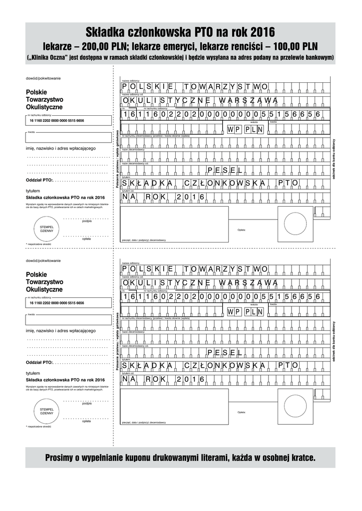 Składka członkowska PTO na rok 2016 lekarze – 200,00 PLN; lekarze emeryci, lekarze renciści – 100,00 PLN („Klinika Oczna” jest dostępna w ramach składki członkowskiej i będzie wysyłana na adres podany na przelewie bankowym) dowód/pokwitowanie nazwa odbiorcy P O L S K I E Polskie Towarzystwo Okulistyczne T O W A R Z Y S T WO nazwa odbiorcy cd. OK U L I S T Y C Z N E l.k. WAR S Z A WA nr rachunku odbiorcy 1 6 1 1 6 0 2 2 0 2 0 0 0 0 0 0 0 0 5 5 1 5 6 6 5 6 16 1160 2202 0000 0000 5515 6656 imię, nazwisko i adres wpłacającego ����������������������������������������������������������������������� ................................... ................................... Oddział PTO:������������������������������������������������ Polecenie przelewu / wpłata gotówkowa kwota waluta tytułem WP PLN nr rachunku zleceniodawcy (przelew) / kwota słownie (wpłata) nazw zleceniodawcy nazw zleceniodawcy cd. P E S E L tytułem SKŁ AD K A tytułem cd. N A Składka członkowska PTO na rok 2016 kwota ROK PTO C Z Ł ON K OW S K A odcinek dla banku odbiorcy nr rachunku odbiorcy 2 0 1 6 Wyrażam zgodę na wprowadzenie danych zawartych na niniejszym blankiecie do bazy danych PTO, przetwarzanie ich w celach marketingowych. ................... podpis STEMPEL DZIENNY Opłata: ................... opłata pieczęć, data i podpis(y) zleceniodawcy * niepotrzebne skreślić dowód/pokwitowanie nazwa odbiorcy P O L S K I E Polskie Towarzystwo Okulistyczne T O W A R Z Y S T WO nazwa odbiorcy cd. OK U L I S T Y C Z N E l.k. WAR S Z A WA nr rachunku odbiorcy 1 6 1 1 6 0 2 2 0 2 0 0 0 0 0 0 0 0 5 5 1 5 6 6 5 6 16 1160 2202 0000 0000 5515 6656 imię, nazwisko i adres wpłacającego ����������������������������������������������������������������������� ................................... ................................... Oddział PTO:������������������������������������������������ tytułem Polecenie przelewu / wpłata gotówkowa kwota waluta WP PLN nr rachunku zleceniodawcy (przelew) / kwota słownie (wpłata) nazw zleceniodawcy nazw zleceniodawcy cd. P E S E L tytułem SKŁ AD K A tytułem cd. Składka członkowska PTO na rok 2016 kwota N A ROK C Z Ł ON K OW S K A PTO 2 0 1 6 Wyrażam zgodę na wprowadzenie danych zawartych na niniejszym blankiecie do bazy danych PTO, przetwarzanie ich w celach marketingowych. ................... podpis STEMPEL DZIENNY Opłata: ................... opłata pieczęć, data i podpis(y) zleceniodawcy * niepotrzebne skreślić Prosimy o wypełnianie kuponu drukowanymi literami, każda w osobnej kratce. odcinek dla banku odbiorcy nr rachunku odbiorcy