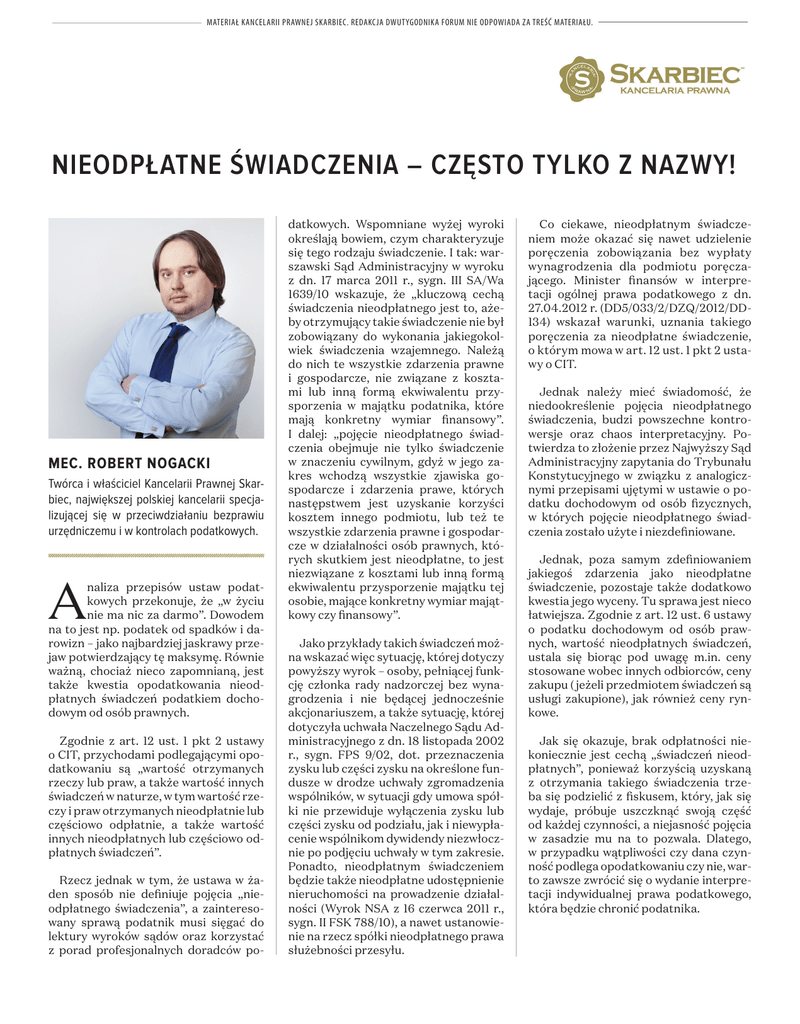 MATERIAŁ KANCELARII PRAWNEJ SKARBIEC. REDAKCJA DWUTYGODNIKA FORUM NIE ODPOWIADA ZA TREŚĆ MATERIAŁU. NIEODPŁATNE ŚWIADCZENIA – CZĘSTO TYLKO Z NAZWY! MEC. ROBERT NOGACKI Twórca i właściciel Kancelarii Prawnej Skarbiec, największej polskiej kancelarii specjalizującej się w przeciwdziałaniu bezprawiu urzędniczemu i w kontrolach podatkowych. A naliza przepisów ustaw podatkowych przekonuje, że „w życiu nie ma nic za darmo”. Dowodem na to jest np. podatek od spadków i darowizn – jako najbardziej jaskrawy przejaw potwierdzający tę maksymę. Równie ważną, chociaż nieco zapomnianą, jest także kwestia opodatkowania nieodpłatnych świadczeń podatkiem dochodowym od osób prawnych. Zgodnie z art. 12 ust. 1 pkt 2 ustawy o CIT, przychodami podlegającymi opodatkowaniu są „wartość otrzymanych rzeczy lub praw, a także wartość innych świadczeń w naturze, w tym wartość rzeczy i praw otrzymanych nieodpłatnie lub częściowo odpłatnie, a także wartość innych nieodpłatnych lub częściowo odpłatnych świadczeń”. Rzecz jednak w tym, że ustawa w żaden sposób nie definiuje pojęcia „nieodpłatnego świadczenia”, a zainteresowany sprawą podatnik musi sięgać do lektury wyroków sądów oraz korzystać z porad profesjonalnych doradców po- datkowych. Wspomniane wyżej wyroki określają bowiem, czym charakteryzuje się tego rodzaju świadczenie. I tak: warszawski Sąd Administracyjny w wyroku z dn. 17 marca 2011 r., sygn. III SA/Wa 1639/10 wskazuje, że „kluczową cechą świadczenia nieodpłatnego jest to, ażeby otrzymujący takie świadczenie nie był zobowiązany do wykonania jakiegokolwiek świadczenia wzajemnego. Należą do nich te wszystkie zdarzenia prawne i gospodarcze, nie związane z kosztami lub inną formą ekwiwalentu przysporzenia w majątku podatnika, które mają konkretny wymiar finansowy”. I dalej: „pojęcie nieodpłatnego świadczenia obejmuje nie tylko świadczenie w znaczeniu cywilnym, gdyż w jego zakres wchodzą wszystkie zjawiska gospodarcze i zdarzenia prawe, których następstwem jest uzyskanie korzyści kosztem innego podmiotu, lub też te wszystkie zdarzenia prawne i gospodarcze w działalności osób prawnych, których skutkiem jest nieodpłatne, to jest niezwiązane z kosztami lub inną formą ekwiwalentu przysporzenie majątku tej osobie, mające konkretny wymiar majątkowy czy finansowy”. Jako przykłady takich świadczeń można wskazać więc sytuację, której dotyczy powyższy wyrok – osoby, pełniącej funkcję członka rady nadzorczej bez wynagrodzenia i nie będącej jednocześnie akcjonariuszem, a także sytuację, której dotyczyła uchwała Naczelnego Sądu Administracyjnego z dn. 18 listopada 2002 r., sygn. FPS 9/02, dot. przeznaczenia zysku lub części zysku na określone fundusze w drodze uchwały zgromadzenia wspólników, w sytuacji gdy umowa spółki nie przewiduje wyłączenia zysku lub części zysku od podziału, jak i niewypłacenie wspólnikom dywidendy niezwłocznie po podjęciu uchwały w tym zakresie. Ponadto, nieodpłatnym świadczeniem będzie także nieodpłatne udostępnienie nieruchomości na prowadzenie działalności (Wyrok NSA z 16 czerwca 2011 r., sygn. II FSK 788/10), a nawet ustanowienie na rzecz spółki nieodpłatnego prawa służebności przesyłu. Co ciekawe, nieodpłatnym świadczeniem może okazać się nawet udzielenie poręczenia zobowiązania bez wypłaty wynagrodzenia dla podmiotu poręczającego. Minister finansów w interpretacji ogólnej prawa podatkowego z dn. 27.04.2012 r. (DD5/033/2/DZQ/2012/DD134) wskazał warunki, uznania takiego poręczenia za nieodpłatne świadczenie, o którym mowa w art. 12 ust. 1 pkt 2 ustawy o CIT. Jednak należy mieć świadomość, że niedookreślenie pojęcia nieodpłatnego świadczenia, budzi powszechne kontrowersje oraz chaos interpretacyjny. Potwierdza to złożenie przez Najwyższy Sąd Administracyjny zapytania do Trybunału Konstytucyjnego w związku z analogicznymi przepisami ujętymi w ustawie o podatku dochodowym od osób fizycznych, w których pojęcie nieodpłatnego świadczenia zostało użyte i niezdefiniowane. Jednak, poza samym zdefiniowaniem jakiegoś zdarzenia jako nieodpłatne świadczenie, pozostaje także dodatkowo kwestia jego wyceny. Tu sprawa jest nieco łatwiejsza. Zgodnie z art. 12 ust. 6 ustawy o podatku dochodowym od osób prawnych, wartość nieodpłatnych świadczeń, ustala się biorąc pod uwagę m.in. ceny stosowane wobec innych odbiorców, ceny zakupu ( jeżeli przedmiotem świadczeń są usługi zakupione), jak również ceny rynkowe. Jak się okazuje, brak odpłatności niekoniecznie jest cechą „świadczeń nieodpłatnych”, ponieważ korzyścią uzyskaną z otrzymania takiego świadczenia trzeba się podzielić z fiskusem, który, jak się wydaje, próbuje uszczknąć swoją część od każdej czynności, a niejasność pojęcia w zasadzie mu na to pozwala. Dlatego, w przypadku wątpliwości czy dana czynność podlega opodatkowaniu czy nie, warto zawsze zwrócić się o wydanie interpretacji indywidualnej prawa podatkowego, która będzie chronić podatnika.