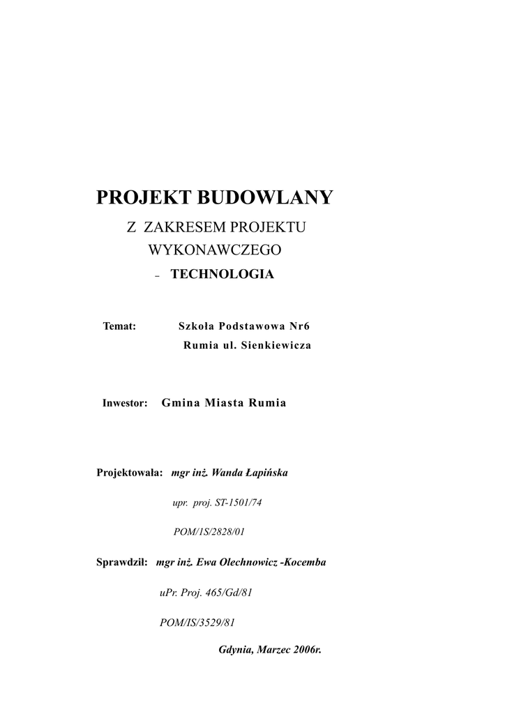 PROJEKT BUDOWLANY Z ZAKRESEM PROJEKTU WYKONAWCZEGO – Temat: TECHNOLOGIA Szkoła Podstawowa Nr6 Rumia ul. Sienkiewicza Inwestor: Gmina Miasta Rumia Projektowała: mgr inż. Wanda Łapińska upr. proj. ST-1501/74 POM/1S/2828/01 Sprawdził: mgr inż. Ewa Olechnowicz -Kocemba uPr. Proj. 465/Gd/81 POM/IS/3529/81 Gdynia, Marzec 2006r. CZĘŚĆ INSTALACYJNA TECHNOLOGIA ZAWARTOŚĆ OPRACOWANIA 1 CZĘŚĆ OPISOWA: OPIS TECHNICZY I BIOS 2 CZĘŚĆ GRAFICZNA RZUT PIWNICY TECHNOLOGIA KUCHNI rys T-1 RZUT PARTERU TECHNOLOGIA KUCHNI rys T-2 Opis techniczny do projektu technologii stołówki w Szkole Podstawowej Rumia 1,0 Podstawa opracowania – umowa zlecenie – projekt architektoniczny – normy 2,0 Zakres opracowania Dokumentacja obejmuje projekt technologii kuchni wraz zapleczem gastronomicznym. 3,0 Dane ogólne 3,1 Stan istniejący W istniejącym budynek szkoły zostaje modernizowana kuchnia wraz z zapleczem gastronomicznym. Istniejąca stołówka zajmuje pomieszczenia na poziomie parteru, i piwnicy. W piwnicy pomieszczenia socjalne i magazyny przygotowalnia brudna, na parterze kuchnia gorąca zmywalnia. Budynek wyposażony we wszystkie instalacje. 3,2 Projektowe rozwiązanie Proponuje sie umieszczenia kuchni gorącej wraz z zaplecze w piwnicy budynku. Na parterze wydawalnia i zmywalnia. Do kuchni przewidziano dwa wejścia: wejście personelu dostawa towaru Dojazd terenem utwardzonym. Kuchnia wydawać będzie posiłki dla 300 uczniów. Przygotowanie posiłków w przygotowalniach w piwnicy, oraz częściowa obróbka termiczna (gotowanie zup, warzyw, makaronów itd.) na parterze wydawalnia, podgrzew potraw. Gotowe potrawy na parter dostarczane windą potrawową. 4,0 Kuchnia 4,1 dostawa towaru Kuchnia zaopatrywana będzie przez dostawców surowców i półproduktów. Dostawa towaru do magazynów: magazyn produktów suchych magazyn zasobów magazyn -chłodnia Warzywa i ziemniaki przechowywane na ruszcie w przygotowalni brudnej. Ziemniaki w workach warzywa w kontenerach. W magazynach składowane są odpowiednio surowce w miarę potrzeb pobierania i uzupełniane. Mięso i produkty „szybkiego psucia” przechowywane w chłodniach. Jajka przechowywane w lodówce w pomieszczeniu obieralni brudnej. 4,2 Przygotowalnie Warzywa dostarczane do przygotowalni brudnej gdzie poddawane będą obróbce wstępnej, a następnie czyste do przygotowalni czystej. Jajka w przygotowalni brudnej naświetlane, po dezynfekcji dostarczane do kuchni do wydzielonej przygotowalni. Przewidziano przygotowalnie- stanowiska mięsa, mączna Czyste warzywa windą na parter gdzie przygotowywane będą kanapki. 4,3 Obróbka termiczna Obróbka termiczna potraw: gotowanie, pieczenie, smażenie odbywać sie będzie w kuchni. Do przygotowania zup, kasz, ziemniaków, przeznaczone kotły warzelne. Gotowanie duszenie potraw mięsnych na trzonach kuchennych, smażenie na patelniach lub płytach do smażenia bezpośredniego. Pieczenie mięsa, drobiu w piekarnikach przy kuchniach. Przygotowywania sosów na trzonach kuchennych. Dla smażenia naleśników specjalna naleśnikarka. 4,4 Wydawanie posiłków Wydawanie posiłków na stanowisku wydawalni - parter. Gotowe potrawy dostarczane windą do wydawalni - nakładane do bemarów elektrycznych w których utrzymywana będzie odpowiednia temperatura. Kociołek z zupą ustawiany na taborecie gazowym dla utrzymania temperatury. 4,5 zmywanie naczyń kuchennych W kuchni wydzielono stanowiska mycia naczyń kuchennych. Mycie naczyń w w basenie suszenie na półce ociekowej. Pojemniki (gary) w których dostarczane są gotowe posiłki z piwnicy na parter myte będą na wydzielonym stanowisku. 4,6 Zmywalnia naczyń stołowych. Naczynia podawane poprzez okienko podawcze jadalni. Zmywalnia naczyń stołowych wyposażona w stół z otworem na odpadki do wstępnego oczyszczania naczyń z resztek pokarmów. Maszyna do mycia naczyń z wyparzaczem i zlewem jednokomorowym wyposażonym w natrysk do spłukiwania naczyń przed włożeniem do maszyny. Zlew w zmywalni wyposażony w młynek koloidalny. Umyte naczynia do kuchni podawane są przez szafę przelotową. 5,0 pomieszczenia socjalnego Zatrudnienie : kucharka 1 pomoc kucharska 1„ w zmywalni 1 „ wydawalnia „ 1 „ Dla pracowników zaprojektowano pomieszczenia zaplecza socjalnego Przyjęto personel kobiecy, Szatnie z łazienką: o powierzchni 10,47 m2 na 4 osoby Do szatni- jadalnia przylegają łazienki. Szatna wyposażony w szafki, zlew oraz dzbanek elektryczny. Szafki na odzież wierzchnią, pracownicy dostają po trzy komplety odzieży roboczej i dodatek na środki pralnicze. Do pracy przynoszą czystą odzież roboczą a brudną po pracy zabierają z sobą. W łazienkach przy natryskach przewidzieć wieszak na odzież, nad umywalkami zamontować lustra, pojemniki na mydło w płynie, wieszaki na ręczniki. Ręczniki jednorazowego użytku w umywalniach. Pomieszczenie porządkowe z basenem umieszczonym na wysokości 0,5m od posadzki. 6,0 WYTYCZNE BUDOWLANO - INSTALACYJNE 6.1Wymagania konstrukcyjne -Konstrukcja ścian i stropów powinna uniemożliwiać kondensowanie się na nich pary. 6,2Wymagania dotyczące wykończenia wnętrz. -Ściany i sufity wszystkich pomieszczeń powinny mieć gładką powierzchnię. -W pomieszczenia kuchni i sanitarne powinny mieć ściany do wysokości 2 m dostosowane do zmywania wodą, nienasiąkliwe i odporne na wilgoć. Pozostałe fragmenty ścian oraz sufitów bielone. -Drzwi powinny być gładkie, odporne na wilgoć i przystosowane do zmywania wodą, obite blacha na wysokość 30 cm od podłogi. - Okna z konstrukcja umożliwiająca wietrzenie. Gładkie szczelne dostosowane do zmywania wodą i umożliwiające założenie ram z siatką chroniącą przed przedostaniem się owadów i gryzoni. -Podłoga w sali konsumpcyjnej powinna być gładka, nieścieralna, nieśliska, wykonana z materiału będącego złym przewodnikiem ciepła i łatwa do utrzymania w czystości. W pomieszczeniu kuchni podłoga powinna być nieścieralna, nie