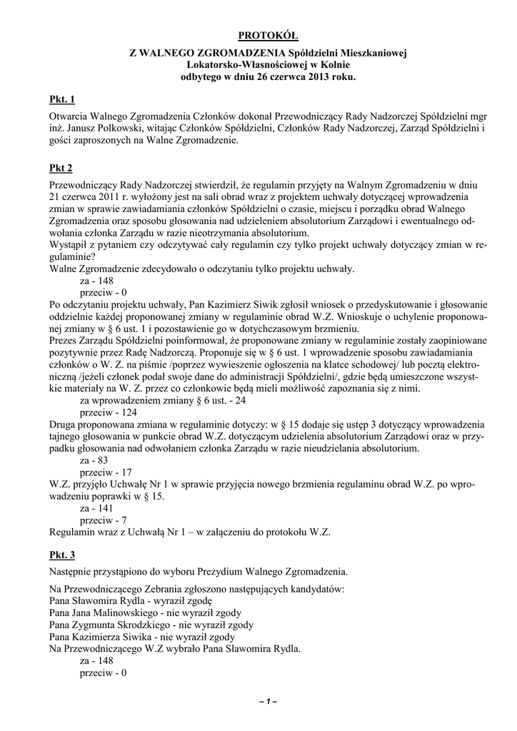 PROTOKÓŁ Z WALNEGO ZGROMADZENIA Spółdzielni Mieszkaniowej Lokatorsko-Własnościowej w Kolnie odbytego w dniu 26 czerwca 2013 roku. Pkt. 1 Otwarcia Walnego Zgromadzenia Członków dokonał Przewodniczący Rady Nadzorczej Spółdzielni mgr inż. Janusz Polkowski, witając Członków Spółdzielni, Członków Rady Nadzorczej, Zarząd Spółdzielni i gości zaproszonych na Walne Zgromadzenie. Pkt 2 Przewodniczący Rady Nadzorczej stwierdził, że regulamin przyjęty na Walnym Zgromadzeniu w dniu 21 czerwca 2011 r. wyłożony jest na sali obrad wraz z projektem uchwały dotyczącej wprowadzenia zmian w sprawie zawiadamiania członków Spółdzielni o czasie, miejscu i porządku obrad Walnego Zgromadzenia oraz sposobu głosowania nad udzieleniem absolutorium Zarządowi i ewentualnego odwołania członka Zarządu w razie nieotrzymania absolutorium. Wystąpił z pytaniem czy odczytywać cały regulamin czy tylko projekt uchwały dotyczący zmian w regulaminie? Walne Zgromadzenie zdecydowało o odczytaniu tylko projektu uchwały. za - 148 przeciw - 0 Po odczytaniu projektu uchwały, Pan Kazimierz Siwik zgłosił wniosek o przedyskutowanie i głosowanie oddzielnie każdej proponowanej zmiany w regulaminie obrad W.Z. Wnioskuje o uchylenie proponowanej zmiany w § 6 ust. 1 i pozostawienie go w dotychczasowym brzmieniu. Prezes Zarządu Spółdzielni poinformował, że proponowane zmiany w regulaminie zostały zaopiniowane pozytywnie przez Radę Nadzorczą. Proponuje się w § 6 ust. 1 wprowadzenie sposobu zawiadamiania członków o W. Z. na piśmie /poprzez wywieszenie ogłoszenia na klatce schodowej/ lub pocztą elektroniczną /jeżeli członek podał swoje dane do administracji Spółdzielni/, gdzie będą umieszczone wszystkie materiały na W. Z. przez co członkowie będą mieli możliwość zapoznania się z nimi. za wprowadzeniem zmiany § 6 ust. - 24 przeciw - 124 Druga proponowana zmiana w regulaminie dotyczy: w § 15 dodaje się ustęp 3 dotyczący wprowadzenia tajnego głosowania w punkcie obrad W.Z. dotyczącym udzielenia absolutorium Zarządowi oraz w przypadku głosowania nad odwołaniem członka Zarządu w razie nieudzielania absolutorium. za - 83 przeciw - 17 W.Z. przyjęło Uchwałę Nr 1 w sprawie przyjęcia nowego brzmienia regulaminu obrad W.Z. po wprowadzeniu poprawki w § 15. za - 141 przeciw - 7 Regulamin wraz z Uchwałą Nr 1 – w załączeniu do protokołu W.Z. Pkt. 3 Następnie przystąpiono do wyboru Prezydium Walnego Zgromadzenia. Na Przewodniczącego Zebrania zgłoszono następujących kandydatów: Pana Sławomira Rydla - wyraził zgodę Pana Jana Malinowskiego - nie wyraził zgody Pana Zygmunta Skrodzkiego - nie wyraził zgody Pana Kazimierza Siwika - nie wyraził zgody Na Przewodniczącego W.Z wybrało Pana Sławomira Rydla. za - 148 przeciw - 0 –1– Na Zastępcę Przewodniczącego W.Z. zaproponowano następujące osoby: Pana Zygmunta Skrodzkiego - wyraził zgodę Pana Stanisława Kruszewskiego - nie wyraził zgody Pana Zdzisława Szymańskiego - nie wyraził zgody Pana Józefa Jasiewicza - wyraził zgodę Na Z-cę Przewodniczącego W.Z. wybrało Pana Zygmunta Skrodzkiego. za - 148 przeciw - 0 Na Sekretarza W.Z. wybrało - Pana Józefa Jasiewicza -wyraził zgodę za - 148 przeciw - 0 W skład Prezydium Walnego Zgromadzenia weszli: 1. Przewodniczący W.Z. - Pan Sławomir Rydel 2. Z-ca Przewodniczącego - Pan Zygmunt Skrodzki 3. Sekretarz W.Z. - Pan Józef Jasiewicz Przewodniczący Walnego Zgromadzenia Pan Sławomir Rydel objął dalsze powadzenie obrad. Pkt 4. Projekt porządku W.Z. przedstawia się następująco: 1. Otwarcie obrad. 2. Podjęcie uchwały w sprawie zmian w regulaminie obrad Walnego Zgromadzenia. 3. Wybór prezydium zebrania, w tym Przewodniczącego i Sekretarza. 4. Przyjęcie porządku obrad. 5. Przyjęcie protokołu z poprzedniego Walnego Zgromadzenia. 6. Wybór komisji: a/ uchwał i wniosków, b/ mandatowo-skrutacyjnej. 7. Sprawozdanie Zarządu: a/ z działalności Zarządu wraz z bilansem za rok 2012, b/ z realizacji programu działania oraz realizacji wniosków i Uchwał Walnego Zgromadzenia za rok 2012, c/ projekt programu działania na rok 2013. 8. Sprawozdanie z działalności Rady Nadzorczej Spółdzielni za 2012 rok. 9. Dyskusja. 10.Podjęcie uchwał w sprawach: a/ przyjęcia sprawozdania Zarządu wraz z bilansem i udzielenia absolutorium, b/ przyjęcia sprawozdania Zarządu z realizacji programu działania za 2012 rok oraz realizacji uchwał i wniosków zgłoszonych na poprzednim Walnym Zgromadzeniu, c/ przyjęcia sprawozdania Rady Nadzorczej z działalności za 2012 rok, d/ przyjęcia programu działania Spółdzielni na 2013 rok, e/ uchwalenia największej sumy zobowiązań jaką Spółdzielnia może zaciągnąć, f/ odwołania od uchwały Rady Nadzorczej w sprawie wykluczenia z członkostwa, g/ zbycia nieruchomości, h/ w sprawie zmian w Statucie Spółdzielni, i/ w sprawie odpłatnego sprzątania klatek schodowych, j/ w sprawie wyboru Delegata na Zjazd Przedstawicieli Spółdzielczego Regionalnego Związku Rewizyjnego w Białymstoku. 11.Wolne wnioski. 12.Przyjęcie protokołu końcowego komisji uchwał i wniosków. 13.Zamknięcie obrad. Pan Stanisław Szymańczyk zgłosił wniosek o wykreślenie z porządku W.Z. punktu 10 lit. h dotyczącego podjęcia uchwały w sprawie zmian w Statucie Spółdzielni. Powinien być czas na dyskusję nad poprawkami do statutu i proponuje za rok wrócić do tematu zmian w statucie. Prezes Zarządu poinformował, że wpłynął do Spółdzielni wniosek w sprawie zmian do porządku obrad W.Z. tj. odwołania dwóch członków Rady Nadzorczej i powołania nowych. Wniosek podpisany został przez 14 osób, z czego 3 osoby nie są członkami Spółdzielni a 3 osoby złożyło oświadczenia o wycofaniu poparcia omawianego wniosku. Wobec powyższego wniosek nie spełniał wymogów formalnoprawnych i Zarząd nie mógł wprowadzić wnioskowanej zmiany do porządku obrad W.Z. Jeżeli chodzi o projekt zmian w statu