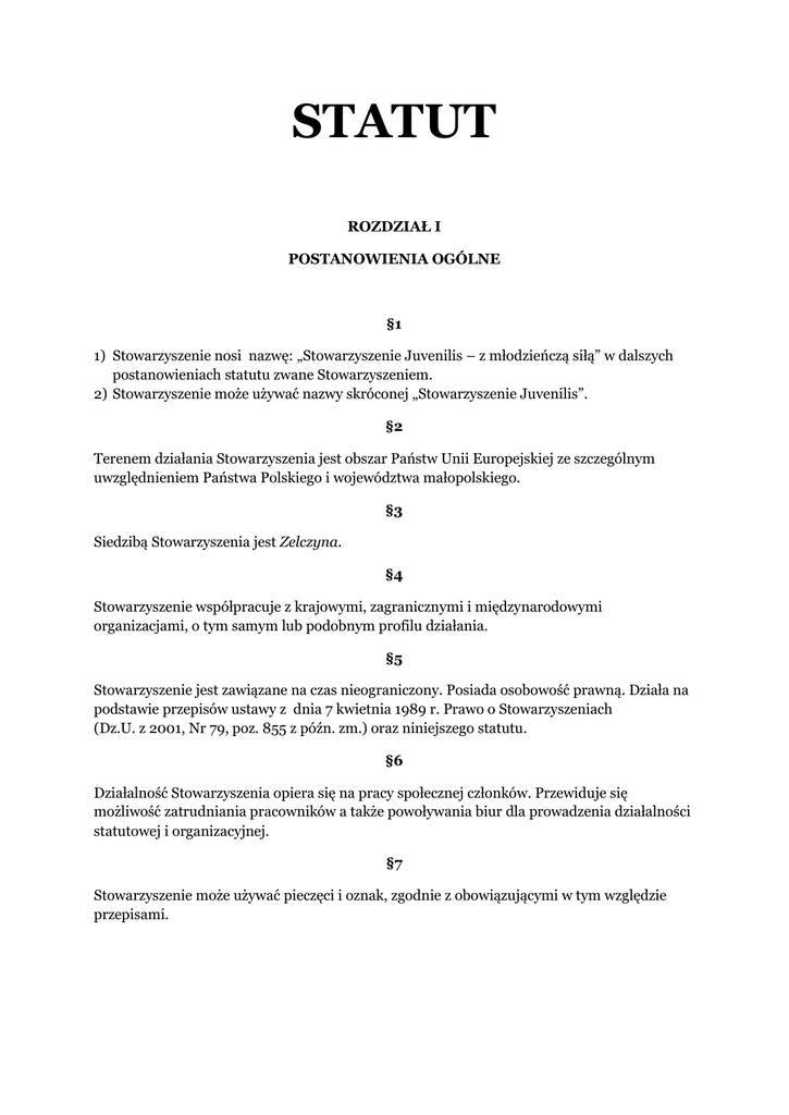 STATUT ROZDZIAŁ I POSTANOWIENIA OGÓLNE §1 1) Stowarzyszenie nosi nazwę: „Stowarzyszenie Juvenilis – z młodzieńczą siłą” w dalszych postanowieniach statutu zwane Stowarzyszeniem. 2) Stowarzyszenie może używać nazwy skróconej „Stowarzyszenie Juvenilis”. §2 Terenem działania Stowarzyszenia jest obszar Państw Unii Europejskiej ze szczególnym uwzględnieniem Państwa Polskiego i województwa małopolskiego. §3 Siedzibą Stowarzyszenia jest Zelczyna. §4 Stowarzyszenie współpracuje z krajowymi, zagranicznymi i międzynarodowymi organizacjami, o tym samym lub podobnym profilu działania. §5 Stowarzyszenie jest zawiązane na czas nieograniczony. Posiada osobowość prawną. Działa na podstawie przepisów ustawy z dnia 7 kwietnia 1989 r. Prawo o Stowarzyszeniach (Dz.U. z 2001, Nr 79, poz. 855 z późn. zm.) oraz niniejszego statutu. §6 Działalność Stowarzyszenia opiera się na pracy społecznej członków. Przewiduje się możliwość zatrudniania pracowników a także powoływania biur dla prowadzenia działalności statutowej i organizacyjnej. §7 Stowarzyszenie może używać pieczęci i oznak, zgodnie z obowiązującymi w tym względzie przepisami. ROZDZIAŁ II CELE I ŚRODKI DZIAŁANIA §8 Celami Stowarzyszenia są: 1) 2) 3) 4) Zaktywizowanie młodzieży. Działalność oświatowa i kulturalna. Propagowanie i organizowanie wymiany międzykulturowej. Działalność na rzecz integracji europejskiej oraz rozwijania kontaktów i współpracy między społeczeństwami. 5) Ochrona i promocja zdrowia. 6) Wspieranie społecznej i zawodowej aktywności obywateli. 7) Promocja i organizowanie wolontariatu. 8) Prowadzenie akcji informacyjnych, uświadamiających społeczeństwu ludzkie problemy i aktywizujących do pomagania potrzebującym. 9) Działalność charytatywna. 10) Działalność wspomagająca rozwój wspólnot i społeczności lokalnej. 11) Działalność na rzecz osób niepełnosprawnych oraz potrzebujących. 12) Upowszechnianie kultury fizycznej i ekologii. 13) Działanie kulturalne, edukacyjne i medialne zwiększające wrażliwość społeczną i promująca sztukę tworzoną przez niezależnych artystów. 14) Promowanie form kreatywnego spędzania czasu wolnego, rozwijanie osobowości i poszerzanie zainteresowań oraz upowszechnianie zdrowego stylu życia. §9 Stowarzyszenie swe cele realizuje poprzez: 1) 2) 3) 4) 5) 6) 7) Fundowanie stypendiów. Wsparcie rzeczowe i/lub materialne osób potrzebujących. Organizowanie konferencji, seminariów, szkoleń i wykładów. Organizowanie imprez kulturalnych. Organizacja wypoczynku dla dzieci i młodzieży. Organizowanie wymian międzynarodowych. Organizowanie wydarzeń kulturalnych takich jak festiwale, koncerty, wystawy, przedstawienia teatralne, warsztaty, sesje, seminaria i inne. 8) Organizowanie spotkań z twórcami, animatorami, krytykami, autorytetami w dziedzinach zbieżnych z celami statutowymi Stowarzyszenia. 9) Prowadzenie warsztatów edukacyjnych dla dzieci, młodzieży i dorosłych. 10) Prowadzenie doradztwa. 11) Uczestnictwo w wydarzeniach, akcjach kulturalnych, społecznych i rekreacyjnych, oraz kampaniach edukacyjnych i społecznych o zasięgu lokalnym, ogólnopolskim, europejskim i światowym, których cele są zbieżne z celami Stowarzyszenia. 12) Wydawanie publikacji słownych, audialnych i audiowizualnych promujących tradycję, kulturę i sztukę oraz artystów a także wszelkie idee zgodne ze statutem Stowarzyszenia. 13) Współpracę ze środkami masowego przekazu. 14) Współpracę z organizacjami oraz z międzynarodowymi sieciami organizacji pozarządowych, które stawiają sobie podobne cele. 15) Pozyskiwanie pomocy na zasadzie wolontariatu i propagowanie szeroko pojętych akcji charytatywnych umożliwiających realizację celów statutowych. 16) Współpracę z instytucjami i organizacjami społecznymi pracującymi na rzecz osób niepełnosprawnych. 17) Działalność na rzecz osób niepełnosprawnych w zakresie: organizacji festiwali, regionalnych imprez kulturalnych, sportowych i rekreacyjnych wspierających ich aktywność w tych dziedzinach. 18) Doradztwo i pomoc organizacyjną oraz szkolenie osób i innych podmiotów zainteresowanych działalnością Stowarzyszenia. 19) Zajmowanie stanowiska w sprawach dotyczących lokalnego życia społecznego. 20) Współpracę i wzajemną pomoc członków Stowarzyszenia. 21) Realizację projektów współfinansowanych z funduszy unijnych. 22) Realizację grantów i projektów współfinansowanych ze środków krajowych. §10 Stowarzyszenie może prowadzić działalność gospodarczą przeznaczoną dla zdobywania funduszy na działalność statutową. ROZDZIAŁ III CZŁONKOWIE – PRAWA I OBOWIĄZKI §11 Członkami Stowarzyszenia mogą być osoby fizyczne i prawne. Osoba prawna może być jedynie członkiem wspierającym Stowarzyszenia. §12 Stowarzyszenie posiada członków: a) zwyczajnych, b) wspierających, c) honorowych. §13 1) Członkiem zwyczajnym Stowarzyszenia może być każda osoba fizyczna, która: a) złoży deklarację członkowską na piśmie, b) przedstawi pozytywną opinię dwóch członków Stowarzyszenia. 2) Przyjęcie nowych członków dokonuje Zarząd uchwałą podjętą nie później niż w ciągu dwóch miesięcy od daty złożenia deklaracji. 3) Członkowie zwyczajni mają prawo: a) Biernego i czynnego uczestnictwa w wyborach do władz Stowarzyszenia, b) Korzystania z dorobku, majątku i wszelkich form działalności Stowarzyszenia, c) Udziału w zebraniach, wykładach i imprezach organizowanych przez Stowarzyszenie, d) Zgłaszania wniosków co do działalności Stowarzyszenia, 4) Członkowie zwyczajni mają obowiązek: a) Brania udziału w działalności Stowarzyszenia i realizacji jego celów, b) Przestrzegania statutu i uchwał władz Stowarzyszenia, c) Regularnego opłacania składek. §14 1) Członkiem wspierającym Stowarzyszenie może zostać osoba fizyczna i prawna deklarująca pomoc finansową, rzeczową lub meryt