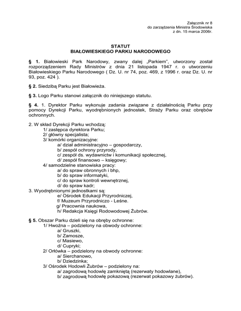 Załącznik nr 8 do zarządzenia Ministra Środowiska z dn. 15 marca 2006r. STATUT BIAŁOWIESKIEGO PARKU NARODOWEGO § 1. Białowieski Park Narodowy, zwany dalej „Parkiem”, utworzony został rozporządzeniem Rady Ministrów z dnia 21 listopada 1947 r. o utworzeniu Białowieskiego Parku Narodowego ( Dz. U. nr 74, poz. 469, z 1996 r. oraz Dz. U. nr 93, poz. 424 ). § 2. Siedzibą Parku jest BiałowieŜa. § 3. Logo Parku stanowi załącznik do niniejszego statutu. § 4. 1. Dyrektor Parku wykonuje zadania związane z działalnością Parku przy pomocy Dyrekcji Parku, wyodrębnionych jednostek, StraŜy Parku oraz obrębów ochronnych. 2. W skład Dyrekcji Parku wchodzą: 1/ zastępca dyrektora Parku; 2/ główny specjalista; 3/ komórki organizacyjne: a/ dział administracyjno – gospodarczy, b/ zespół ochrony przyrody, c/ zespół ds. wydawnictw i komunikacji społecznej, d/ zespół finansowo – księgowy; 4/ samodzielne stanowiska pracy: a/ do spraw obronnych i bhp, b/ do spraw informatyki, c/ do spraw kontroli wewnętrznej, d/ do spraw kadr; 3. Wyodrębnionymi jednostkami są: e/ Ośrodek Edukacji Przyrodniczej, f/ Muzeum Przyrodniczo - Leśne. g/ Pracownia naukowa, h/ Redakcja Księgi Rodowodowej śubrów. § 5. Obszar Parku dzieli się na obręby ochronne: 1/ Hwoźna – podzielony na obwody ochronne: a/ Gruszki, b/ Zamosze, c/ Masiewo, d/ Cupryki; 2/ Orłówka – podzielony na obwody ochronne: a/ Sierchanowo, b/ Dziedzinka; 3/ Ośrodek Hodowli śubrów – podzielony na: a/ zagrodową hodowlę zamkniętą (rezerwaty hodowlane), b/ zagrodową hodowlę pokazową (rezerwat pokazowy Ŝubrów). Załącznik do statutu Białowieskiego Parku Narodowego Logo Białowieskiego Park Naukowego w skali 1:1 UZASADNIENIE Dotychczas obowiązujące zarządzenie Ministra Środowiska nr 24 z dnia 7 stycznia 2005r. w sprawie nadania statutu Białowieskiemu Parkowi Narodowemu, nie uwzględniało elementów związanych z organizacją pracy w Parku, takich jak: siedziba parku, jego logo, podział terytorialny. Ilość zmian wprowadzonych do statutu BPN uzasadniała opracowanie nowego zarządzenia w tej sprawie.