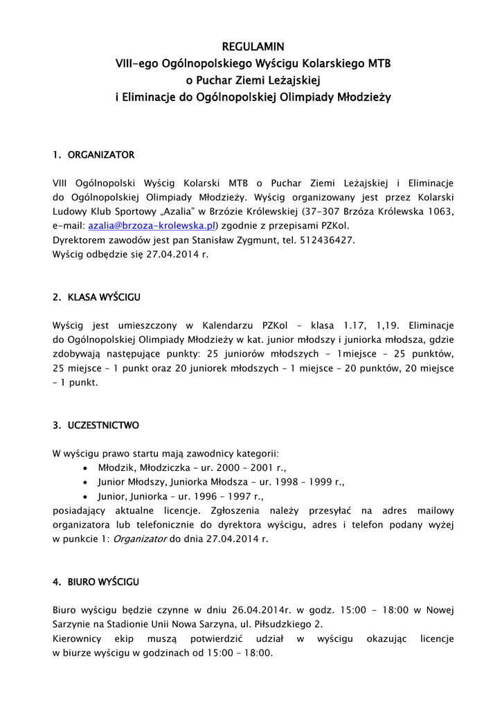 REGULAMIN VIII-ego Ogólnopolskiego Wyścigu Kolarskiego MTB o Puchar Ziemi Leżajskiej i Eliminacje do Ogólnopolskiej Olimpiady Młodzieży 1. ORGANIZATOR VIII Ogólnopolski Wyścig Kolarski MTB o Puchar Ziemi Leżajskiej i Eliminacje do Ogólnopolskiej Olimpiady Młodzieży. Wyścig organizowany jest przez Kolarski Ludowy Klub Sportowy „Azalia” w Brzózie Królewskiej (37-307 Brzóza Królewska 1063, e-mail: [email protected]) zgodnie z przepisami PZKol. Dyrektorem zawodów jest pan Stanisław Zygmunt, tel. 512436427. Wyścig odbędzie się 27.04.2014 r. 2. KLASA WYŚCIGU Wyścig jest umieszczony w Kalendarzu PZKol – klasa 1.17, 1,19. Eliminacje do Ogólnopolskiej Olimpiady Młodzieży w kat. junior młodszy i juniorka młodsza, gdzie zdobywają następujące punkty: 25 juniorów młodszych - 1miejsce – 25 punktów, 25 miejsce – 1 punkt oraz 20 juniorek młodszych – 1 miejsce – 20 punktów, 20 miejsce – 1 punkt. 3. UCZESTNICTWO W wyścigu prawo startu mają zawodnicy kategorii: Młodzik, Młodziczka – ur. 2000 – 2001 r., Junior Młodszy, Juniorka Młodsza - ur. 1998 – 1999 r., Junior, Juniorka – ur. 1996 – 1997 r., posiadający aktualne licencje. Zgłoszenia należy przesyłać na adres mailowy organizatora lub telefonicznie do dyrektora wyścigu, adres i telefon podany wyżej w punkcie 1: Organizator do dnia 27.04.2014 r. 4. BIURO WYŚCIGU Biuro wyścigu będzie czynne w dniu 26.04.2014r. w godz. 15:00 - 18:00 w Nowej Sarzynie na Stadionie Unii Nowa Sarzyna, ul. Piłsudzkiego 2. Kierownicy ekip muszą potwierdzić udział w biurze wyścigu w godzinach od 15:00 – 18:00. w wyścigu okazując licencje 5. TRENING Oficjalny trening dozwolony jest wyłącznie po kontroli licencji, zakończeniu wszystkich formalności rejestracyjnych i wydaniu numerów startowych. Podczas treningu zawodnik musi mieć tabliczkę z numerem na rowerze. Trening oficjalny odbędzie się w dniach: sesja treningowa dzień przed zawodami w dniu 26.04.2014r. w godz. 16:00 – 18:00 sesja treningowa w dniu zawodów w godz. 8:00 – 9:30. Podczas trwania wyścigu trenowanie jest zabronione. 6. KLASYFIKACJA I BONYFIKATY Klasyfikacja będzie prowadzona zgodnie z przepisami sportowymi PZKol – Klasyfikacja indywidualna. 7. NAGRODY Trzech pierwszych zawodników i trzy pierwsze zawodniczki we wszystkich kategoriach wyścigu otrzymują punkty. Sześcioro pierwszych zawodników i zawodniczek w kat. junior otrzyma nagrody pieniężne: I m – 250 zł, II m – 200 zł, III m – 150 zł, II m – 100 zł, V m – 80 zł, VI m – 70 zł Dziesięcioro pierwszych zawodników i zawodniczek w kat. junior młodszy otrzyma nagrody rzeczowe na kwotę 2 000zł. Ośmioro pierwszych zawodników i zawodniczek w kat. młodzik otrzyma nagrody rzeczowe na kwotę 1 200 zł. Łączna wartość nagród i pucharów to 6 500 zł. 8. POMOC TECZNICZNA Pomoc techniczna dozwolona jest zgodnie z przepisami PZKoL. 9. CEREMONIA DEKORACJI Ceremonia dekoracji odbędzie się po zakończeniu zawodów o godz. 14.30. Zgodnie z art. 1.2.112 przepisów sportowych do dekoracji mają obowiązek zgłaszać się następujący zawodnicy. - sześć pierwszych zawodniczek i zawodników z kategorii junior i juniorka. - dziesięć pierwszych zawodniczek i zawodników z kategorii juniorka młodsza i junior młodszy - osiem pierwszych zawodniczek i zawodników z kategorii młodziczka i młodzik. Zawodnicy mają obowiązek zgłosić się do dekoracji w strojach wyścigowych. 10. KARY W zakresie kar obowiązują przepisy sportowe PZKol. 11. PROGRAM MINUTOWY 26.04.2014r. godz. 15.00-18.00 przyjmowanie zgłoszeń zawodników (stadion Uni Nowa Sarzyna) . 27.04.2014r. godz. 8.30-11.30 przyjmowanie zgłoszeń zawodników Tarnogóra (Las Kopecki) przy trasie wyścigu w namiocie sędziowskim. - 09.30 odprawa kierowników ekip - 10.00 start kategorii młodzik - 1 runda rozjazdowa + 3 okrążenia trasy wyścigu - 10.02 start kategorii młodziczka - 1 runda rozjazdowa + 2 okrążenia trasy wyścigu - 11.00 start kategorii juniorka młodsza - 1 runda rozjazdowa + 3 okrążenia trasy wyścigu - 11.45 start kategorii junior młodszy - 1 runda rozjazdowa + 5 okrążenia trasy wyścigu - 12.30 start szkol podstawowych - 13.00 start kategorii junior - 1 runda rozjazdowa + 7 okrążeń trasy wyścigu - 13.02 start kategorii juniorka - 1 runda rozjazdowa + 5 okrążeń trasy wyścigu Ilość okrążeń dobrana jest do czasu jazdy poszczególnych kategorii wiekowych. Dekoracja i wypłacenie nagród odbędzie się przy biurze zawodów w miejscu wyścigu, t.j. Tarnogóra (Las Kopecki). W czasie zawodów trenować i odbywać rozgrzewkę będzie można wyłącznie poza trasą wyścigu, na przylegających leśnych ścieżkach lub na parkingu wyznaczonym przez organizatora. Mycie rowerów na parkingu dla samochodów wyznaczonym przesz organizatora. 12. TRASA Długość jednego pełnego okrążenia wynosi 3 200 m. Długość rundy rozjazdowej wynosi 1 000 m. Trasa w terenie leśnym bez karkołomnych zjazdów – w miarę bezpieczna. W załączeniu graficzny plan trasy wyścigu. 13. ZASADY FINANSOWANIA Koszt organizacji wyścigu w tym nagród ponosi organizator a koszty uczestnictwa delegujące kluby. Opłata startowa zgodnie z przepisami PZKol, pobierana będzie przed zgłoszeniem zawodników w biurze zawodów. 14. SKŁAD KOMISJI SEDZIOWSKIEJ Sędzia główny i komisarze delegowani przez PZKoL – Pan Dawid Sobura, Komisarz II Pani Agata Gibek, Komisarz III Pan Grzegorz Szumny. Pozostali sędziowie wyznaczeni będą przez LZKol. w Lublinie. 15. WYKAZ SZPITALI W POBLIŻU TRASY Szpital Powiatowy ZOZ w Leżajsku, ul. Leśna 12, tel. 17 240 49 00 16. POSTANOWIENIA KOŃCOWE We w wszystkich sprawach porozumieniu z komunikaty nie objętych organizatorem umieszczone zostaną regulaminem wyścigu. na tablicy Wszystkie obok decyduje sędzia dodatkowe biura główny informacje zawodów, – zawodnicy i opiekunowie mają obowiązek się z nimi zapoznać. Za ewentualne wypadki zais