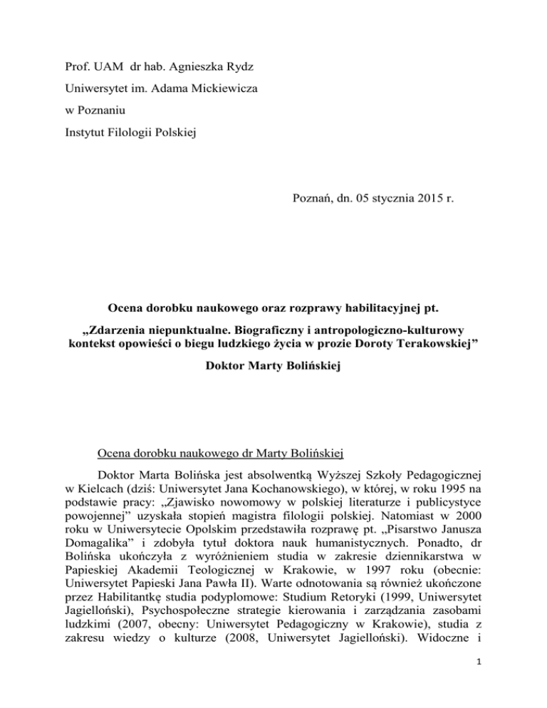 Prof. UAM dr hab. Agnieszka Rydz Uniwersytet im. Adama Mickiewicza w Poznaniu Instytut Filologii Polskiej Poznań, dn. 05 stycznia 2015 r. Ocena dorobku naukowego oraz rozprawy habilitacyjnej pt. „Zdarzenia niepunktualne. Biograficzny i antropologiczno-kulturowy kontekst opowieści o biegu ludzkiego życia w prozie Doroty Terakowskiej” Doktor Marty Bolińskiej Ocena dorobku naukowego dr Marty Bolińskiej Doktor Marta Bolińska jest absolwentką Wyższej Szkoły Pedagogicznej w Kielcach (dziś: Uniwersytet Jana Kochanowskiego), w której, w roku 1995 na podstawie pracy: „Zjawisko nowomowy w polskiej literaturze i publicystyce powojennej” uzyskała stopień magistra filologii polskiej. Natomiast w 2000 roku w Uniwersytecie Opolskim przedstawiła rozprawę pt. „Pisarstwo Janusza Domagalika” i zdobyła tytuł doktora nauk humanistycznych. Ponadto, dr Bolińska ukończyła z wyróżnieniem studia w zakresie dziennikarstwa w Papieskiej Akademii Teologicznej w Krakowie, w 1997 roku (obecnie: Uniwersytet Papieski Jana Pawła II). Warte odnotowania są również ukończone przez Habilitantkę studia podyplomowe: Studium Retoryki (1999, Uniwersytet Jagielloński), Psychospołeczne strategie kierowania i zarządzania zasobami ludzkimi (2007, obecny: Uniwersytet Pedagogiczny w Krakowie), studia z zakresu wiedzy o kulturze (2008, Uniwersytet Jagielloński). Widoczne i 1 konsekwentnie prowadzone dążenie do podnoszenia kwalifikacji zawodowych pokazuje dr Martę Bolińską jako osobę ambitną, ale również nie mniej pracowitą i zaangażowaną we wszystkie przedsięwzięcia, jakich się podejmowała. Także przebieg pracy zawodowej Habilitantki stanowi potwierdzenie powyższej konstatacji. W macierzystej uczelni dr Bolińska pracuje od ukończenia studiów. Wpierw była zatrudniona w Zakładzie Romantyzmu i Literatury Współczesnej, a obecnie na stanowisku adiunkta w Zakładzie Literatury do 1918 roku i Teorii Literatury. Ponadto, od 2011 roku pełni funkcję dyrektora ds. dydaktycznych w Instytucie Filologii Polskiej Uniwersytetu Jana Kochanowskiego w Kielcach. Nieomal równolegle do pracy na polonistyce przebiega zatrudnienie dr Bolińskiej najpierw w Papieskiej Akademii Teologicznej w Krakowie (od 1998 roku), a po zmianie w Uniwersytecie Papieskim Jana Pawła II, w Instytucie Dziennikarstwa i Komunikacji Społecznej. Podlegający ocenie dorobek naukowy dr Marty Bolińskiej stanowią trzy samodzielnie napisane monografie oraz dwa podręczniki akademickie. Pierwsza autorska monografia: „Zdarzenia niepunktualne. Biograficzny i antropologiczno-kulturowy kontekst opowieści o biegu ludzkiego życia w prozie Doroty Terakowskiej” (Wydawnictwo Uniwersytetu Jana Kochanowskiego, Kielce 2013, 382 s.) i druga: „Kobiet trzy portrety. Pisarki z regionu świętokrzyskiego. Zofia Bukowiecka, Agnieszka Barłogowa, Halina Snopkiewicz”, Kraków 2009, 169 s.) oraz trzecia: „Przez Świat Młodych do literatury. O prozie Janusza Domagalika” (Wydawnictwo Akademii Świętokrzyskiej, Wydawnictwo Akademii Świętokrzyskiej, Kielce 2004, s. 238), na co warto zwrócić uwagę, poświęcone zostały pięciorgu różnym pisarzom. Habilitantka napisała też dwa podręczniki akademickie dla studentów dziennikarstwa: „Na papierze i w eterze” (Kraków 2006, 176 s.) oraz „Komunikacja czytelnicza dorośli-dzieci. Uwarunkowania i efekty lektury” (Kraków 2010, 151 s.). Ponadto, jest również autorką innych publikacji, z których 27 zostało zamieszczonych w recenzowanych książkach zbiorowych, 17 w krajowych czasopismach recenzowanych, a pozostałe 26 w pismach o profilu dydaktyczno-popularyzatorskim. Napisała także 2 przedmowy oraz 2 hasła słownikowe oraz współredagowała książkę: „Pokolenie 1920. Szkice do portretu zbiorowego” (Kielce 2012, 173 s.). Osiągnięcia dydaktyczne dr Bolińskiej obejmują uczestnictwo w kilku różnorodnych projektach badawczych o charakterze edukacyjnym (w tym również międzynarodowych), adresowanych głównie do dzieci i do młodzieży szkolnej, ale także do seniorów. Najważniejsze z nich to: program Leonardo da Vinci (2007-2008), projekt TIPS-STENOTOR (2012-2014), Świętokrzyski System Wspierania Talentów – Fascynujący Świat Nauki (2014). 2 Warto też odnotować, że Habilitantka pełniła opiekę promotorską nad 13 pracami magisterskimi (IFP UJK w Kielcach) oraz nad 13 pracami licencjackimi (IDiKS UPJPII w Krakowie). Zwraca też uwagę aktywność konferencyjna Habilitantki. Uczestniczyła ona z referatami w 30 konferencjach o zasięgu ogólnopolskim oraz, co warte podkreślenia również w konferencjach międzynarodowych. Ponadto, część jej wystąpień ma charakter interdyscyplinarny. Sama też współorganizowała jedną z konferencji. Dorobek naukowy dr Marty Bolińskiej stanowi przykład całości myślowej budowanej stopniowo i powiększanej o nowe pola badawcze wraz z przyrostem stanu badań w naukach filologicznych oraz społecznych, ale przede wszystkim z poszerzającą się samoświadomością Autorki jako literaturoznawczyni, nauczycielki akademickiej i „last, not least” – humanistki. Prace naukowe Habilitantki skupione zostały, jak sama podała: „na trzech zasadniczych obszarach: literaturze współczesnej, koncepcjach dziecka i dzieciństwa, wiedzy o mediach i kulturze” („Autoreferat”, s. 4). Nie podważając w niczym niniejszej autocharakterystyki zauważam jednak, że centralne miejsce w badaniach dr Bolińskiej zajmuje dziecko i jego świat, którego deskrypcji (na przykładach zaczerpniętych z pisarstwa Doroty Terakowskiej i Janusza Domagalika) poświęciła ona dwie z trzech monografii. Pierwsza, pod względem chronologicznym, jest książka pt. „Przez Świat Młodych do literatury. O prozie Janusza Domagalika”, recenzowana przez prof. dr hab. Anielę Pryszczewską-Kozołub i doc. dr hab. Bogusława Żurakowskiego, będąca poprawioną wersją rozprawy doktorskiej, której promotorem był prof. Jan