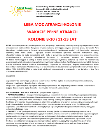 Biuro Podróży KAROL TRAVEL Karol Krystjańczuk Łęczna 21-010, ul. Stefanii Pawlak 8 Tel./fax +48 81 752 08 07 e-mail: [email protected] www.karoltravel.pl ŁEBA MOC ATRAKCJI-KOLONIE WAKACJE PEŁNE ATRAKCJI KOLONIE 8-10 i 11-13 LAT ŁEBA Położona pośrodku polskiego wybrzeża jest jedną z najbardziej urokliwych i najchętniej odwiedzanych miejscowości nadmorskich. Turystów i wczasowiczów przyciągają czyste, szerokie plaże, Słowiński Park Narodowy z największymi w Europie ruchomymi wydmami, “wielką górą piachu” czyli Górą Łącką i pustynną scenerią oraz pełne uroku i tętniące życiem miasteczko rybackie. Ponadto mikroklimat Łeby, charakteryzujący się dużą zawartością soli i jodu w powietrzu, nasłonecznieniem oraz dynamiką zmian atmosferycznych, wykazuje właściwości lecznicze i korzystnie wpływa na samopoczucie. W Łebie, konkurującej z Ustką o miano stolicy polskiego wybrzeża, odbywa się latem na nadmorskiej promenadzie wiele otwartych imprez kulturalnych i rozrywkowych (np. Rajd Antycznych Automobili, Konkurs Rzeźby w Piasku, Puchar Polski w Windsurfingu, "Pływanie na bele czym", Regaty Balonowe) oraz wiele koncertów i konkursów. Warto dodać, że w ostatnich latach zbudowano największy obecnie w Polsce, 20 ha ŁEBA PARK DINOZAURÓW z naturalnej wielkości eksponatami, a nieopodal – w Sarbsku – Sea Park z oceanarium i kinem 5D. PROGRAM Zapraszamy do aktywnego spędzania czasu! Czekać na Was będzie mnóstwo atrakcji i niespodzianek, ciekawa rywalizacja i duuużo dobrej zabawy. Większość zajęć odbywać się będzie na świeżym powietrzu, we wspaniałej scenerii morza, jeziora i lasu. Zajęcia dostosowane będą do wieku i możliwości fizycznych uczestników. PROGRAM KOLONII "MOC ATRAKCJI" (przykładowe zajęcia): • POWER PARK ŁEBA – niezapomniana przygoda, a zarazem doskonała forma aktywnego spędzania czasu na przeszkodach parku linowego. Na początku pokonacie trasę szkoleniową – z systemem asekuracji (tuż nad ziemią), a następnie nieco trudniejszą trasę zieloną. Mierząc się z przeszkodami, na całej trasie będziecie przypięci do liny asekuracyjnej. Wszystkie urządzenia oraz sprzęt asekuracyjny używany w Power Park Łeba posiadają wszelkie atesty i certyfikaty bezpieczeństwa wymagane przez Polski Związek Alpinizmu. Dodatkowo Power Park Łeba legitymuje się Certyfikatem Bezpieczny Park Linowy, który jest odnawiany każdego roku. • GOKARTY – ABC jazdy gokartowej (szkolenie, trening, jazda) – profesjonalnie przygotowany tor z profilowanymi zakrętami i zabezpieczającymi bandami, wyposażony jest w system świateł sygnalizacyjnych. Jazda po nim przypomina rywalizację formuł wyścigowych. Gokarty posiadają regulowane fotele, co pozwala na korzystanie z nich zarówno przez dzieci jak i dorosłych. Zajęcia dzielą się na dwie części. Podczas części teoretycznej zapoznacie się z budową gokartów, specyfiką toru, techniką jazdy oraz zasadami bezpieczeństwa. Część praktyczna to trening i zabawa w formie wyścigu. Zapewniamy: kombinezony, certyfikowane kaski, kołnierze asekuracyjne. Biuro Podróży KAROL TRAVEL Karol Krystjańczuk Łęczna 21-010, ul. Stefanii Pawlak 8 Tel./fax +48 81 752 08 07 e-mail: [email protected] www.karoltravel.pl • QUADY – umożliwiają bezpieczne poruszanie się w każdym, nawet trudnym terenie. Poznacie ich niezwykłe możliwości, będą podstawy prowadzenia czterokołowca, zasady bezpiecznej jazdy, pasjonująca jazda po specjalnym terenie (dostosowane do wieku i wzrostu dzieci). • WSPINACZKA – dwustronna, pochyła ścianka wspinaczkowa posiada z każdej strony dwie drogi wspinaczkowe, o zróżnicowanym stopniu trudności. Dla każdego, przy odrobinie wysiłku i precyzji, szczyt będzie osiągalny! • REJS STATKIEM – niesamowity rejs po morzu statkiem z licznymi atrakcjami. Wypłyniemy z portu w Łebie i dotrzemy do latarni morskiej lub w okolice wydm ruchomych. • DINO PARK ŁEBA – to nowootwarty, jeden z największych Parków Dinozaurów w kraju! Będziecie mogli oglądać fascynujące olbrzymy z bliska! Piękne położenie wśród lasów, stawów, trzęsawisk i naturalnej przyrody sprzyja dobrej zabawie i regeneracji sił. Spacerując ścieżkami, mostami i kładkami zobaczycie ok. 100 gadów, a wśród nich dwa kolosy: Seismosaurusa mającego 45 m długości i jedynego w Polsce Brachiosaurusa, wysokiego na 13 m! Fani motoryzacji poznają przodka samochodów – napędzane pedałami pojazdy Flinstone'ów. Na specjalnej trasie będą mogli zmierzyć się z czasem. Choć całość jest tylko wierną kopią tamtych czasów, pobyt w Parku dostarczy nam niezapomnianych emocji! • ŁEBA PARK – to place zabaw dla dzieci utrzymane w charakterze ery dinozaurów. Najmłodsi archeolodzy, metodą odkrywkową, odnajdą szkielety dinozaurów. Miłośnicy przepraw i wspinaczek chętnie będą zdobywać linaria i mini ścianki. Drugi plac zabaw to jeden wielki tor przeszkód, wymagający od najmłodszych największej sprawności (wspinaczki, ruchome pomosty, przeprawy po palach i wiele innych). • MINI ZOO – dzieci mogą poznać i własnoręcznie karmić kozy, owce, daniele, jelenie i wiele innych zwierząt. Są tu także kucyki! Warto z bliska zobaczyć sympatycznych mieszkańców ZOO i poznać ich zwyczaje. • WYCIECZKA DO SŁOWIŃSKIEGO PARKU NARODOWEGO – czekać na Was będzie przejazd kolejką bajkową, rejs statkiem po Jez. Łebsko, a także wędrówka po ruchomych wydmach, gdzie poczujecie się jak na prawdziwej pustyni. • PIESZE WĘDRÓWKI – odkrywanie nieznanych zakątków miasta, spacer do portu rybackiego, wzdłuż wybrzeża na zachód słońca. PONADTO: • PLAŻOWANIE I KĄPIELE w morzu pod opieką ratownika. • Wodne ABC – bezpieczeństwo w wodzie, gry i konkursy. • GRY PLAŻOWE (wyścig rzędów, dwa ognie, piłka plażowa), zamki z piasku. • Gry i zabawy sportowo-integracyjne, rozgrywki międzykolonijne: olimpiada n