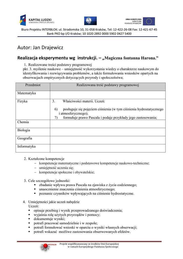 Biuro Projektu INTERBLOK: ul. Stradomska 10, 31-058 Kraków, Tel: 12-422-26-08 Fax: 12-421-67-45 Bank PKO bp I/O Kraków; 10 1020 2892 0000 5902 0427 5400 Autor: Jan Drajewicz Realizacja eksperymentu wg instrukcji. – „Magiczna fontanna Harona.” 1. Realizowane treści podstawy programowej pkt. 3. myślenie naukowe – umiejętność wykorzystania wiedzy o charakterze naukowym do identyfikowania i rozwiązywania problemów, a także formułowania wniosków opartych na obserwacjach empirycznych dotyczących przyrody i społeczeństwa; Realizowana treść podstawy programowej Przedmiot Matematyka Fizyka 3. Właściwości materii. Uczeń: posługuje się pojęciem ciśnienia (w tym ciśnienia hydrostatycznego i atmosferycznego); 7) formułuje prawo Pascala i podaje przykłady jego zastosowania; 6) Chemia Biologia Geografia Informatyka 2. Kształcone kompetencje kompetencje matematyczne i podstawowe kompetencje naukowo-techniczne; umiejętność uczenia się; kompetencje społeczne i obywatelskie; 3. Cele szczegółowe jednostki: zbadanie wpływu prawa Pascala na zjawiska z życia codziennego; unaocznienie znaczenia ciśnienia atmosferycznego; poznanie czynników wpływających na ciśnienie hydrostatyczne. 4. Umiejętności jakie uczeń nabędzie Uczeń: opisuje przebieg i wynik przeprowadzanego doświadczenia; wyjaśnia rolę użytych przyrządów i pomocy; dokumentuje wyniki; potrafi pracować samodzielnie i w zespole; potrafi formułować wnioski w oparciu o wyniki własnych obserwacji; potrafi wskazać możliwe zastosowania obserwowanych efektów. Projekt współfinansowany ze środków Unii Europejskiej w ramach Europejskiego Funduszu Społecznego Biuro Projektu INTERBLOK: ul. Stradomska 10, 31-058 Kraków, Tel: 12-422-26-08 Fax: 12-421-67-45 Bank PKO bp I/O Kraków; 10 1020 2892 0000 5902 0427 5400 5. Wykaz pomocy dydaktycznych (dla zespołu 2 - 3 uczniów) Lp Pomoc dydaktyczna do przeprowadzenia eksperymentu 1 Pusta butelka plastikowa 2 l typu PET 2 Zakrętki do butelek 3 Wąż elastyczny ф ≈ 4 mm 4 Woda 5 Statyw z uchwytem na butelkę Ilość sztuk 3 3 szt. 2 – 3 mb. 3l 1 szt. Inne materiały przygotowane przez nauczyciela 1 Ostry nóż 2 Wiertarka i wiertło ф ≈ 4 mm 1 szt. Po 1 szt. 6. Proponowany przebieg zajęć z rozliczeniem czasowym Uwagi do realizacji dla nauczyciela (rysunki, L.p. Opis kolejnych działań schematy, fotografie, linki do WWW itp.) Czas trwania w minutach 1 W każdej zakrętce wiercimy 2 otwory o średnicy odpowiadającej zewnętrznej średnicy węża elastycznego (ok. 4 mm) 5 min. 2 Od jednej butelki odcinamy nożem górną część (ok. ¼ wysokości butelki) 3 min. 3 Wsuwamy elastyczne rurki plastikowe w otwory w zakrętkach butelek. 2 min. 4 Do butelki środkowej wlewamy wodę do ¾ objętości butelki. Rys. 1 i 2 Projekt współfinansowany ze środków Unii Europejskiej w ramach Europejskiego Funduszu Społecznego 1 min. Biuro Projektu INTERBLOK: ul. Stradomska 10, 31-058 Kraków, Tel: 12-422-26-08 Fax: 12-421-67-45 Bank PKO bp I/O Kraków; 10 1020 2892 0000 5902 0427 5400 5 Montujemy zestaw jak na rys. 1 i 2 7 min. 6 Wlewamy wodę do naczynia górnego 2 min. 7 Powtarzamy doświadczenie dla różnych wysokości h1 i h2 10 min 8 Wyjaśnienie teoretyczne Δp = 15 min. Całkowity czas trwania jednostki 45 min. h1 h1 h2 h2 Rys. 1 Rys. 2 Fontanna działa, jeśli w naczyniu środkowym jest dostatecznie dużo wody, a sprężone powietrze z naczynia dolnego zapewnia dostatecznie wysokie ciśnienie. Powietrze w zbiornikach dolnym i środkowym jest sprężone przez wodę7.przepływającą otwartego Obudowa dozlekcji (innezbiornika wersje) górnego do zbiornika dolnego. Czas demonstracji zależy przede wszystkim od objętości naczyń zamkniętych B i C oraz średnicy wylotu wodotrysku. Projekt współfinansowany ze środków Unii Europejskiej w ramach Europejskiego Funduszu Społecznego Biuro Projektu INTERBLOK: ul. Stradomska 10, 31-058 Kraków, Tel: 12-422-26-08 Fax: 12-421-67-45 Bank PKO bp I/O Kraków; 10 1020 2892 0000 5902 0427 5400 Współczesna wersja fontanny Herona, którą tu widzisz, składa się z dwóch plastikowych butelek (w jednej z nich jest woda) połączonych specjalnym łącznikiem. Gdy odwrócisz butelki, tak by pełna była na górze, woda pod wpływem siły ciężkości zacznie wypływad z niej przez dolną rurkę i sprężad powietrze w dolnej butelce. Z czasem w górnej butelce wytworzy się podciśnienie, więc powietrze z dolnej butelki będzie lam zasysane przez dolną rurkę. A skąd się bierze fontanna? W obydwu rurkach w pobliżu kooca, który mocujemy w łączniku, znajduje się po kilka dziurek. Gdy odwracamy butelki, woda zaczyna wpływad przez te dziurki do górnej rurki i jest wypychana przez powietrze z wystarczającą siłą, by u góry w butelce utworzyła się fontanna. Fontanna tryska za każdym razem, gdy odwrócimy butelki. http://oldwww.fuw.edu.pl/festiwal/asymon/zabawki/sala2.html Rys. 3 http://www.physd.amu.edu.pl/~ gpawlo/pliki/fontanna.jpg Projekt współfinansowany ze środków Unii Europejskiej w ramach Europejskiego Funduszu Społecznego Biuro Projektu INTERBLOK: ul. Stradomska 10, 31-058 Kraków, Tel: 12-422-26-08 Fax: 12-421-67-45 Bank PKO bp I/O Kraków; 10 1020 2892 0000 5902 0427 5400 8. Karta pracy ucznia l. p. Cena Czas Łącznie osobogo Liczba wykonania osobogod dziny koszt osób (min) zin pracy pracy (zł) zadanie 1 W każdej zakrętce wiercimy 2 otwory o średnicy odpowiadającej zewnętrznej średnicy węża elastycznego (ok. 4 mm) 2 Od jednej butelki odcinamy nożem górną część (ok. ¼ wysokości butelki) 3 Wsuwamy elastyczne rurki plastikowe w otwory w zakrętkach butelek. 4 Do butelki środkowej wlewamy wodę do ¾ objętości butelki. 5 Montujemy zestaw jak na rys. 1 i 2 6 Wlewamy wodę do naczynia górnego 7 Powtarzamy doświadczenie dla różnych wysokości h1 i h2 8 Wyjaśnienie teoretyczne 10 min. 2 1/3 15 5 zł 20 min. 2 2/3 15 10 zł 15 min. Suma: 9. Oszacowanie kosztów prac