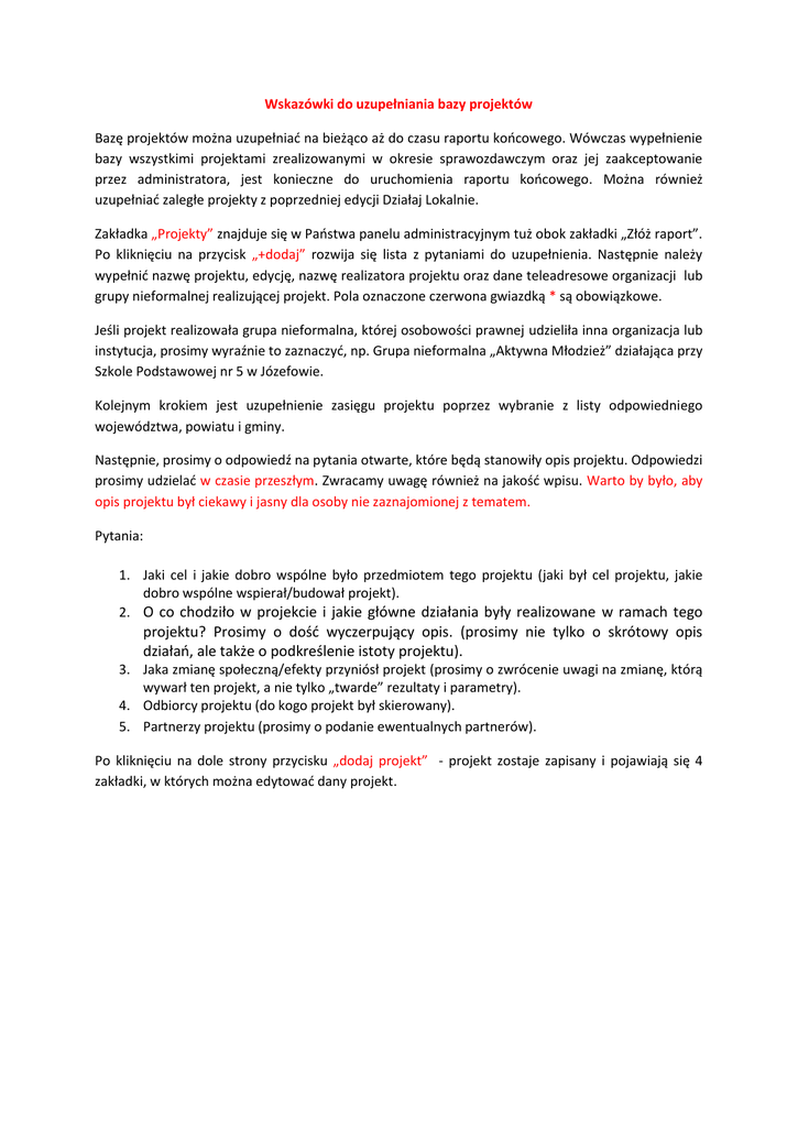 Wskazówki do uzupełniania bazy projektów Bazę projektów można uzupełniad na bieżąco aż do czasu raportu koocowego. Wówczas wypełnienie bazy wszystkimi projektami zrealizowanymi w okresie sprawozdawczym oraz jej zaakceptowanie przez administratora, jest konieczne do uruchomienia raportu koocowego. Można również uzupełniad zaległe projekty z poprzedniej edycji Działaj Lokalnie. Zakładka „Projekty” znajduje się w Paostwa panelu administracyjnym tuż obok zakładki „Złóż raport”. Po kliknięciu na przycisk „+dodaj” rozwija się lista z pytaniami do uzupełnienia. Następnie należy wypełnid nazwę projektu, edycję, nazwę realizatora projektu oraz dane teleadresowe organizacji lub grupy nieformalnej realizującej projekt. Pola oznaczone czerwona gwiazdką * są obowiązkowe. Jeśli projekt realizowała grupa nieformalna, której osobowości prawnej udzieliła inna organizacja lub instytucja, prosimy wyraźnie to zaznaczyd, np. Grupa nieformalna „Aktywna Młodzież” działająca przy Szkole Podstawowej nr 5 w Józefowie. Kolejnym krokiem jest uzupełnienie zasięgu projektu poprzez wybranie z listy odpowiedniego województwa, powiatu i gminy. Następnie, prosimy o odpowiedź na pytania otwarte, które będą stanowiły opis projektu. Odpowiedzi prosimy udzielad w czasie przeszłym. Zwracamy uwagę również na jakośd wpisu. Warto by było, aby opis projektu był ciekawy i jasny dla osoby nie zaznajomionej z tematem. Pytania: 1. Jaki cel i jakie dobro wspólne było przedmiotem tego projektu (jaki był cel projektu, jakie dobro wspólne wspierał/budował projekt). 2. O co chodziło w projekcie i jakie główne działania były realizowane w ramach tego projektu? Prosimy o dośd wyczerpujący opis. (prosimy nie tylko o skrótowy opis działao, ale także o podkreślenie istoty projektu). 3. Jaka zmianę społeczną/efekty przyniósł projekt (prosimy o zwrócenie uwagi na zmianę, którą wywarł ten projekt, a nie tylko „twarde” rezultaty i parametry). 4. Odbiorcy projektu (do kogo projekt był skierowany). 5. Partnerzy projektu (prosimy o podanie ewentualnych partnerów). Po kliknięciu na dole strony przycisku „dodaj projekt” - projekt zostaje zapisany i pojawiają się 4 zakładki, w których można edytowad dany projekt. Aby uatrakcyjnid projekt i go wypromowad, zachęcamy do załączania materiałów z projektu w pozostałych 3 zakładkach widocznych obok „Opisu” projektu: Zdjęcia, Filmy i Dokumenty, które będą widoczne w bazie projektów. W razie kłopotów, prosimy o kontakt: Aneta Kapel e-mail: [email protected] skype: aneta.kapel.filantropia Tel.: 22 622 01 22 w. 15.