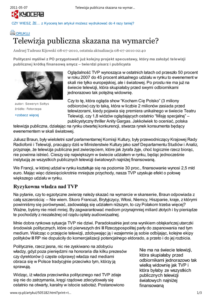 2011-05-07 Telewizja publiczna skazana na wymar… CZY WIESZ, ŻEJ z Kyocerą ten artykuł możesz wydrukować do 4 razy taniej? DRUKUJ Telewizja publiczna skazana na wymarcie? Andrzej Tadeusz Kijowski 08-07-2010, ostatnia aktualizacja 08-07-2010 02:40 Polityczni myśliwi z PO przygotowali już kolejny projekt specustawy, który ma założyć telewizji publicznej krótką finansową smycz – twierdzi pisarz i publicysta Oglądalność TVP wynosząca w ostatnich latach od przeszło 50 procent w roku 2007 do 45 procent aktualnego udziału w rynku to ewenement w skali nie tylko europejskiej, ale i światowej. Po prostu nie ma już na świecie telewizji, która skupiałaby przed swymi odbiornikami jednorazowo tak potężną widownię. Czy to tę, która ogląda show “Kocham Cię Polsko” (3 miliony odbiorców) czy to taką, która w liczbie 2 milionów zasiada przed źródło: Fotorzepa telewizorami, kiedy pojawia się premiera unikalnego w świecie Teatru +zobacz więcej Telewizji, czy 1,8 widzów oglądających ostatnio “Misję specjalną” – publicystyczny thriller Anity Gargas. Jakkolwiek to oceniać, polska telewizja publiczna, działając na rynku otwartej konkurencji, stwarza rynek konsumenta będący ewenementem w skali światowej. autor: Seweryn Sołtys Juliusz Braun, były wieloletni szef parlamentarnej Komisji Kultury, były przewodniczący Krajowej Rady Radiofonii i Telewizji, pracujący dziś w Ministerstwie Kultury jako szef Departamentu Studiów i Analiz, przyznaje, że telewizja publiczna jest zwierzęciem, które jak żyrafa żyje, choć logicznie rzecz biorąc, nie powinna istnieć. Cieszy się największym w świecie udziałem w rynku, będąc jednocześnie instytucją ze wszystkich publicznych telewizji światowych najniżej finansowaną. We Francji, w której udział w rynku kształtuje się na poziomie 30 proc., finansowanie wynosi 2,5 mld euro. Mając więc dziesięciokrotnie mniejsze przychody, nasza TVP uzyskuje efekt o połowę większego udziału w rynku. Ryzykowna władza nad TVP Na pytanie, czy to egzotyczne zwierzę należy skazać na wymarcie w skansenie, Braun odpowiada z całą szczerością: – Nie wiem. Skoro Francuzi, Brytyjczycy, Włosi, Niemcy, Hiszpanie, kraje, z którymi powinniśmy się porównywać, zadowalają się udziałem niższym, to czy Polakom trzeba więcej? Ważne, byśmy nie mieli mniej. By zagwarantować mediom przynajmniej miliard złotych i by pieniądze te pochodziły z niezależnej od rządu opłaty audiowizualnej. Mnie dobra rynkowa sytuacja TVP nie dziwi. Paradoksalnie jest ona wynikiem obłąkańczej utarczki środowisk politycznych, które od pierwszych dni III Rzeczypospolitej parły do zapanowania nad tym medium. Walcząc o przejęcie telewizji, zdobywając ją i wzajemnie ją sobie odbijając, kolejne ekipy polityków III RP nie dopuściły do komercjalizacji potencjalnego eldorado, a przeto i do jej rozbicia. Politycznie, rzecz jasna, nic nie zyskiwano na zdobyciu władzy, gdyż poza pieniędzmi na honoraria dla kilku prezesów czy dyrektorów (i częste odprawy) władza nad mediami obraca się w Polsce tradycyjnie przeciwko tym, którzy ją sprawują. Widząc, iż władza przeciwnika politycznego nad TVP zdaje się nie do zatrzymania, kręgi rządowe zdecydowały się ostatnio na otwarty, karalny w istocie sabotaż. Postanowiono www.rp.pl/artykul/505182.html?print=t… Nie ma na świecie telewizji, która skupiałaby przed odbiornikami jednorazowo tak wielką widownię jak TVP i która byłaby ze wszystkich publicznych telewizji światowych najniżej finansowaną 1/3 2011-05-07 Telewizja publiczna skazana na wymar… zniszczyć to, czego odzyskać nie sposób. Wezwano do niepłacenia abonamentu. Powołując Narodowy Instytut Audiowizualny, otwiera się spór o własność przebogatych archiwów TVP SA, które sprawiają, że z samej emisji materiałów archiwalnych TVP może dziś budować interesujący program będący znakomitą kontrpropozycją na rynku zalanym trzeciorzędną szmirą. Na politycznej smyczy Wydawało się, że tym przepychankom położy kres uzgadniana zarówno ze śp. prezydentem Lechem Kaczyńskim, jak i premierem Donaldem Tuskiem inicjatywa obywatelska koordynowana przez Agnieszkę Holland i Jacka Żakowskiego. Niestety, polityczni myśliwi z PO przygotowali już kolejny projekt specustawy, który ma założyć telewizji krótką finansową smycz, między mrzonki wsadzając rojenia intelektualistów o niezależnym funduszu zarządzanym przez ekspertów dobieranych, jak marzył francuski filozof Etienne Souriau, spośród desygnowanych przedstawicieli ciał społecznych w drodze losowania. Ci ostatni zresztą nie zadbali o to, by projekt formalnie został przedstawiony Sejmowi. Niby wystarczyłoby po temu 15 posłów, jednak “piwnice sejmowe zawalone są takimi projektami” – twierdzi Jacek Żakowski, nie o to więc chodzi, by zawalać jeszcze i schody, lecz, by mieć pewność, iż zostanie projektowi nadany stosowny tryb. Zanosi się jednak na to, że wszystko odbędzie się w trybie polowania z nagonką. Polska to piękny kraj do polowań. Czystością mazurskich wód i podlaskich puszcz zachwycają się cudzoziemcy. A przecież był taki czas pod koniec XVIII wieku, gdy ożywczy wiatr dla Europy wiał z ulic zagrożonej przez Moskwę Warszawy. W Polsce powstawała pierwsza europejska konstytucja, zaś sarmaci walczyli z cudzoziemskimi fircykami. Czy Polska ma Europie do pokazania jedynie dzikie krajobrazy? Czy fakt, że udało się obronić wraz z jej archiwami niezależną telewizyjną instytucję narodową, ma napawać nas wstydem, że ociągamy się w pochodzie globalistów? A może przeciwnie? Powinniśmy się szczycić tym, że polski odbiorca kultury masowej, głosując pilotem, nobilituje nasz krajowy rynek medialny, wciąż wskazując misyjną TVP jako najlepszą, najchętniej oglądaną telewizję w świecie! Autor jest pisarzem, menedżerem kultury i publicystą telewizyjnym z