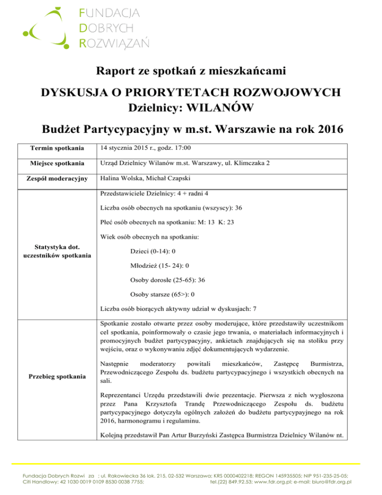Raport ze spotkań z mieszkańcami DYSKUSJA O PRIORYTETACH ROZWOJOWYCH Dzielnicy: WILANÓW Budżet Partycypacyjny w m.st. Warszawie na rok 2016 Termin spotkania 14 stycznia 2015 r., godz. 17:00 Miejsce spotkania Urząd Dzielnicy Wilanów m.st. Warszawy, ul. Klimczaka 2 Zespół moderacyjny Halina Wolska, Michał Czapski Przedstawiciele Dzielnicy: 4 + radni 4 Liczba osób obecnych na spotkaniu (wszyscy): 36 Płeć osób obecnych na spotkaniu: M: 13 K: 23 Wiek osób obecnych na spotkaniu: Statystyka dot. uczestników spotkania Dzieci (0-14): 0 Młodzież (15- 24): 0 Osoby dorosłe (25-65): 36 Osoby starsze (65>): 0 Liczba osób biorących aktywny udział w dyskusjach: 7 Spotkanie zostało otwarte przez osoby moderujące, które przedstawiły uczestnikom cel spotkania, poinformowały o czasie jego trwania, o materiałach informacyjnych i promocyjnych budżet partycypacyjny, ankietach znajdujących się na stoliku przy wejściu, oraz o wykonywaniu zdjęć dokumentujących wydarzenie. Przebieg spotkania Następnie moderatorzy powitali mieszkańców, Zastępcę Burmistrza, Przewodniczącego Zespołu ds. budżetu partycypacyjnego i wszystkich obecnych na sali. Reprezentanci Urzędu przedstawili dwie prezentacje. Pierwsza z nich wygłoszona przez Pana Krzysztofa Trandę Przewodniczącego Zespołu ds. budżetu partycypacyjnego dotyczyła ogólnych założeń do budżetu partycypayjnego na rok 2016, harmonogramu i regulaminu. Kolejną przedstawił Pan Artur Burzyński Zastępca Burmistrza Dzielnicy Wilanów nt. Fundacja Dobrych Rozwi za ; ul. Rakowiecka 36 lok. 215, 02-532 Warszawa; KRS 0000402218; REGON 145935505; NIP 951-235-25-05; Citi Handlowy: 42 1030 0019 0109 8530 0038 7755; tel.(22) 849.92.53; www.fdr.org.pl; e-mail: [email protected] budżetu Dzielnicy – struktury dochodów i wydatków. Po wyżej wymienionych prezentacjach moderatorzy wraz z uczestnikami spotkania ustalili zasady zabierania głosu i przystąpiono do moderowanej dyskusji. Uczestnicy zgłaszali wnioski do Zarządu, zadawali pytania, wygłaszali komentarze, spierali się. Na pytania odpowiadali Pan Artur Burzyński Zastępca Burmistrza oraz Pan Krzysztof Tranda Przewodniczący Zespołu ds. budżetu partycypacyjnego, Naczelnik Wydziału Architektury i Budownictwa. Po dyskusji osoby moderujące zaprosiły uczestników do wypełnienia ankiet oceniających spotkanie. Na zakończenie moderatorzy podsumowali spotkanie, podziękowali za udział w nim mieszkańców, Zarządu Dzielnicy Wilanów, radnych i urzędników oraz zachęcili do zgłaszania projektów do budżetu partycypacyjnego na rok 2016. W trakcie moderowanej dyskusji uczestnicy spotkania poruszyli następujące zagadnienia: 1. Wniosek o usytuowanie przed Ratuszem przystanku autobusowego na żądanie 2. Dlaczego podjęto inną decyzję o limicie górnym kosztu projektu niż rekomendował Zespół ds. budżetu partycypacyjnego? Najważniejsze potrzeby komunikowane przez mieszkańców, w tym tematy poruszane podczas spotkań oraz sugestie mieszkańców, co do sposobu przeprowadzania budżetu partycypacyjnego w m.st. Warszawie na rok 2016; (spisane z flipchartu) 3. Osiedle Arbuzowa jest pomijane w budżecie inwestycyjnym Dzielnicy 4. Dzielnica powinna zostać podzielona na obszary – Wilanów nie jest całością 5. Propozycja podzielenia Wilanowa na obszary jest szkodliwa społecznie, powinniśmy patrzeć na budżet partycypacyjny jak na coś co nas łączy a nie dzieli 6. Budżet partycypacyjny to sztuka poszukiwania kompromisów 7. Podstawowy mieszkańców cel budżetu partycypacyjnego to uaktywnienie 8. Czy projekty, które nie weszły do budżetu partycypacyjnego mają szanse zostać zrealizowane w budżecie inwestycyjnym? 9. Poza formułą budżetu partycypacyjnego dla organizacji pozarządowych są budżety dotacyjne, konkursy, porozumienia 10. Odczuwalne są różnice w podziale środków na różne obszary Wilanowa. Prośba o potraktowanie mieszkańców z zabudowy jednorodzinnej jako tych, którzy też mają potrzeby – latarni, chodników, ulic. Obawa, iż takie Fundacja Dobrych Rozwi za ; ul. Rakowiecka 36 lok. 215, 02-532 Warszawa; KRS 0000402218; REGON 145935505; NIP 951-235-25-05; Citi Handlowy: 42 1030 0019 0109 8530 0038 7755; tel.(22) 849.92.53; www.fdr.org.pl; e-mail: [email protected] projekty „matematycznie nie przejdą” 11. Jedność Wilanowa nie jest rozbijana przez mieszkańców, różne obszary są różnie traktowane w wyniku działań Zarządu Dzielnicy 12. Ul. Sikorskiego jest zakorkowana i kierowcy szukają innych przejazdów, teraz zamknięta jest ul. Arbuzowa, więc rozjeżdżana jest ul. Zdrowa 13. Projekty składane do budżetu partyypacyjnego pokazują kierunki zapotrzebowań mieszkańców 14. Centrum na Radosnej – mieszkańcy chcieliby wiedzieć co tam dokładnie będzie 15. Postulaty mieszkańców z ul. Zdrowej są przyziemne: chcą wody, kanalizacji, chodnika 16. Czy będą znaki informujące, że realizacja była wykonana w ramach budżetu partycypacyjnego? 17. Park Marysiński został założony w XIX wieku, jest zabytkowy – warto posprzątać i oczyścić dojście do bramy 18. Na jakie obszary można podzielić Wilanów w przyszłości? 19. Wniosek do Zarządu o zwiększenie kwoty przeznaczonej na budżet partycypacyjny, kwoty są zbyt niskie na wydzielanie obszarów Wilanowa 20. Styk Wilanowa i Ursynowa jest zaniedbany 1. usytuowanie przed Ratuszem przystanku autobusowego na żądanie 2. wsparcie inwestycyjne dla osiedla Arbuzowa Priorytety rozwojowe dzielnicy zgłoszone przez mieszkańców 3. organizacja ruchu na ulicach Wilanowa (w szczególności ul. Sikorskiego, ul. Zdrowa) 4. doprowadzenie mediów i infrastruktury do ul. Zdrowej (woda, kanalizacja, chodnik) 5. utrzymanie i zadbanie o Park Marysiński 6. zaniedbany styk Wilanowa i Ursynowa (skarpa) Kwestie techniczne – co się sprawdziło, a co nie, co można było zrobić lepiej? Itp.) Spotkanie odbywało się w sali konferencyjnej nowego budynku Urzędu wyposażone