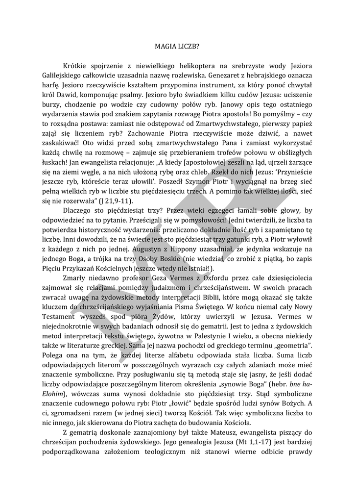 MAGIA LICZB? Krótkie spojrzenie z niewielkiego helikoptera na srebrzyste wody Jeziora Galilejskiego całkowicie uzasadnia nazwę rozlewiska. Genezaret z hebrajskiego oznacza harfę. Jezioro rzeczywiście kształtem przypomina instrument, za który ponoć chwytał król Dawid, komponując psalmy. Jezioro było świadkiem kilku cudów Jezusa: uciszenie burzy, chodzenie po wodzie czy cudowny połów ryb. Janowy opis tego ostatniego wydarzenia stawia pod znakiem zapytania rozwagę Piotra apostoła! Bo pomyślmy – czy to rozsądna postawa: zamiast nie odstępować od Zmartwychwstałego, pierwszy papież zajął się liczeniem ryb? Zachowanie Piotra rzeczywiście może dziwić, a nawet zaskakiwać! Oto widzi przed sobą zmartwychwstałego Pana i zamiast wykorzystać każdą chwilę na rozmowę – zajmuje się przebieraniem trofeów połowu w obślizgłych łuskach! Jan ewangelista relacjonuje: „A kiedy [apostołowie] zeszli na ląd, ujrzeli żarzące się na ziemi węgle, a na nich ułożoną rybę oraz chleb. Rzekł do nich Jezus: ‘Przynieście jeszcze ryb, któreście teraz ułowili’. Poszedł Szymon Piotr i wyciągnął na brzeg sieć pełną wielkich ryb w liczbie stu pięćdziesięciu trzech. A pomimo tak wielkiej ilości, sieć się nie rozerwała” (J 21,9-‐11). Dlaczego sto pięćdziesiąt trzy? Przez wieki egzegeci łamali sobie głowy, by odpowiedzieć na to pytanie. Prześcigali się w pomysłowości! Jedni twierdzili, że liczba ta potwierdza historyczność wydarzenia: przeliczono dokładnie ilość ryb i zapamiętano tę liczbę. Inni dowodzili, że na świecie jest sto pięćdziesiąt trzy gatunki ryb, a Piotr wyłowił z każdego z nich po jednej. Augustyn z Hippony uzasadniał, że jedynka wskazuje na jednego Boga, a trójka na trzy Osoby Boskie (nie wiedział, co zrobić z piątką, bo zapis Pięciu Przykazań Kościelnych jeszcze wtedy nie istniał!). Zmarły niedawno profesor Geza Vermes z Oxfordu przez całe dziesięciolecia zajmował się relacjami pomiędzy judaizmem i chrześcijaństwem. W swoich pracach zwracał uwagę na żydowskie metody interpretacji Biblii, które mogą okazać się także kluczem do chrześcijańskiego wyjaśniania Pisma Świętego. W końcu niemal cały Nowy Testament wyszedł spod pióra Żydów, którzy uwierzyli w Jezusa. Vermes w niejednokrotnie w swych badaniach odnosił się do gematrii. Jest to jedna z żydowskich metod interpretacji tekstu świętego, żywotna w Palestynie I wieku, a obecna niekiedy także w literaturze greckiej. Sama jej nazwa pochodzi od greckiego terminu „geometria”. Polega ona na tym, że każdej literze alfabetu odpowiada stała liczba. Suma liczb odpowiadających literom w poszczególnych wyrazach czy całych zdaniach może mieć znaczenie symboliczne. Przy posługiwaniu się tą metodą staje się jasny, że jeśli dodać liczby odpowiadające poszczególnym literom określenia „synowie Boga” (hebr. bne ha-‐ Elohim), wówczas suma wynosi dokładnie sto pięćdziesiąt trzy. Stąd symboliczne znaczenie cudownego połowu ryb: Piotr „łowić” będzie spośród ludzi synów Bożych. A ci, zgromadzeni razem (w jednej sieci) tworzą Kościół. Tak więc symboliczna liczba to nic innego, jak skierowana do Piotra zachęta do budowania Kościoła. Z gematrią doskonale zaznajomiony był także Mateusz, ewangelista piszący do chrześcijan pochodzenia żydowskiego. Jego genealogia Jezusa (Mt 1,1-‐17) jest bardziej podporządkowana założeniom teologicznym niż stanowi wierne odbicie prawdy historycznej. Były celnik zauważa: „Tak więc w całości od Abrahama do Dawida jest czternaście pokoleń; od Dawida do przesiedlenia babilońskiego czternaście pokoleń; od przesiedlenia babilońskiego do Chrystusa czternaście pokoleń” (Mt 1,17). Trzy czternastopokoleniowe sekcje są odzwierciedleniem trzech nierównych odcinków czasowych: Abrahama od Dawida dzieli około siedemset pięćdziesiąt lat, Dawida od niewoli babilońskiej czterysta lat, natomiast Jezus przyszedł na świat około sześćset lat po zburzeniu Jerozolimy. Mateusz świadomie omija wiele imion sprzed i z okresu monarchii, inne zaś grupuje (np. Jechoniasz i jego bracia). Choć takie pominięcie może wydawać się brakiem dokładności czy wierności wobec stanu faktycznego, jest jednak zupełnie dopuszczalne w starożytnych genealogiach, a nawet we współczesnych genealogiach plemiennych. Jak więc należy interpretować Mateuszowy wzór „trzy razy czternaście”? Niektórzy egzegeci oddając się analizom numerycznym utrzymują, że ponieważ „trzy razy czternaście” to inaczej „sześć razy siedem”, ewangelista zamierzał ukazać, że po sześciu okresach siedmiopokoleniowych Jezus otwiera siódmy, a więc doskonały, okres wypełnienia się królestwa Bożego. Inni swe kalkulacje opierają na dwóch liczbach uważanych przez Żydów za doskonałe: trójka i podwojona siódemka. Jeszcze inni, odwołując się właśnie do gematrii, zauważają, że w dawnej ortografii hebrajskiej imieniu Dawida odpowiadała liczba czternaście, w związku z czym zadaniem ewangelisty byłoby udowodnienie, że Jezus jest potomkiem króla Dawida. Nie wszystkie liczby mają jednak w Ewangeliach wartość gematryczną – przekonuje profesor Mariusz Szram z Katolickiego Uniwersytetu Lubelskiego, autor monografii zatytułowanej „Duchowy sens liczb”. Niektóre odnoszą się do bardziej powszechnej symboliki. Dwunastka przywołuje wśród Izraelitów liczbę pokoleń narodu wybranego, a piątka odsyła do Pięcioksięgu, najważniejszej dla Żydów części Biblii Hebrajskiej. Dlatego w pięć chlebów i dwanaście koszów ułomków w pierwszym rozmnożeniu chleba (Mk 6,32-‐44) oznacza, że Jezus dokonał tego cudu wśród Żydów. Siódemka to cyfra wskazująca na doskonałość i pełnię, czwórka może oznaczać cztery strony świata, a więc całą zamieszkałą ziemię. Stąd drugie rozmnożenie chleba (Mk 8,1-‐ 10) dok