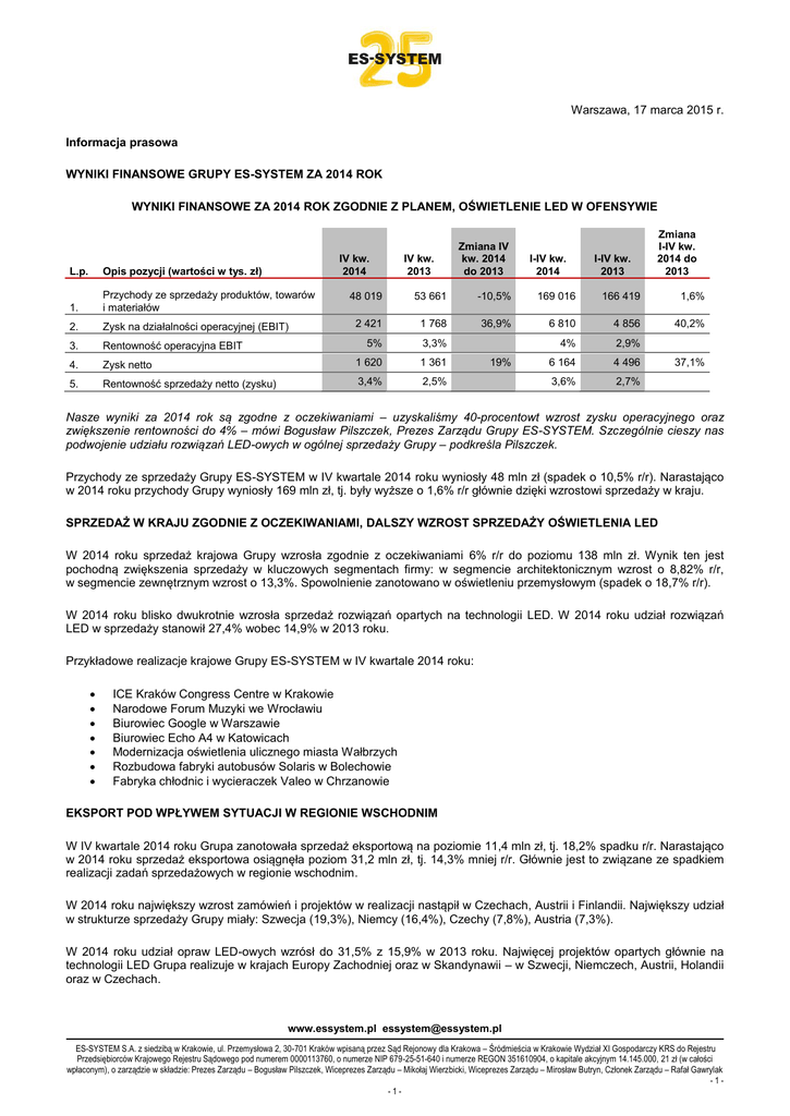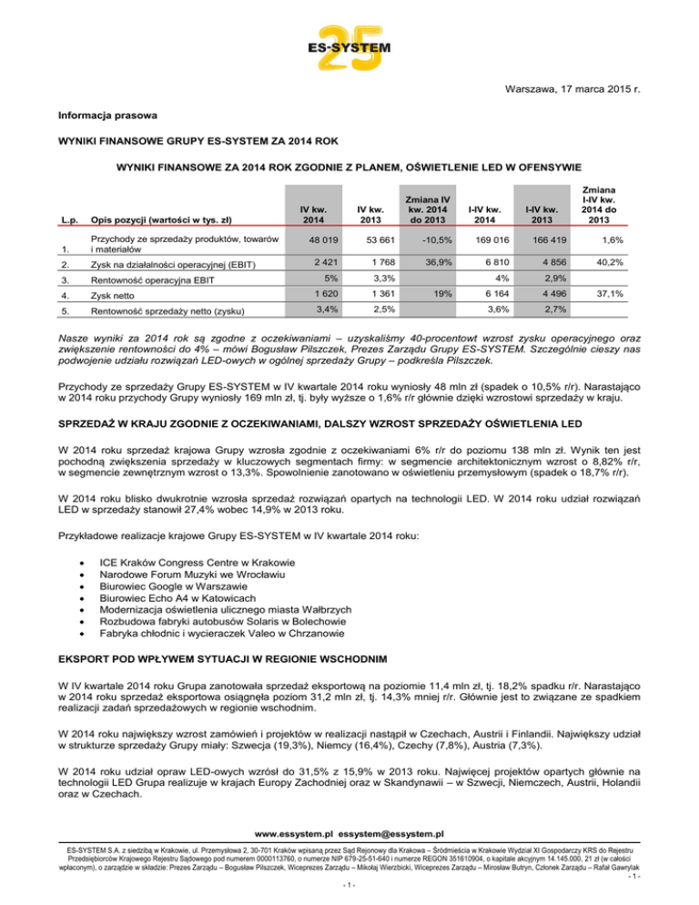 Warszawa, 17 marca 2015 r. Informacja prasowa WYNIKI FINANSOWE GRUPY ES-SYSTEM ZA 2014 ROK WYNIKI FINANSOWE ZA 2014 ROK ZGODNIE Z PLANEM, OŚWIETLENIE LED W OFENSYWIE IV kw. 2014 L.p. Opis pozycji (wartości w tys. zł) 1. Przychody ze sprzedaży produktów, towarów i materiałów 2. Zysk na działalności operacyjnej (EBIT) 3. Rentowność operacyjna EBIT 4. 5. IV kw. 2013 Zmiana IV kw. 2014 do 2013 I-IV kw. 2014 I-IV kw. 2013 Zmiana I-IV kw. 2014 do 2013 48 019 53 661 -10,5% 169 016 166 419 1,6% 2 421 1 768 36,9% 6 810 4 856 40,2% 5% 3,3% 4% 2,9% Zysk netto 1 620 1 361 6 164 4 496 Rentowność sprzedaży netto (zysku) 3,4% 2,5% 3,6% 2,7% 19% 37,1% Nasze wyniki za 2014 rok są zgodne z oczekiwaniami – uzyskaliśmy 40-procentowt wzrost zysku operacyjnego oraz zwiększenie rentowności do 4% – mówi Bogusław Pilszczek, Prezes Zarządu Grupy ES-SYSTEM. Szczególnie cieszy nas podwojenie udziału rozwiązań LED-owych w ogólnej sprzedaży Grupy – podkreśla Pilszczek. Przychody ze sprzedaży Grupy ES-SYSTEM w IV kwartale 2014 roku wyniosły 48 mln zł (spadek o 10,5% r/r). Narastająco w 2014 roku przychody Grupy wyniosły 169 mln zł, tj. były wyższe o 1,6% r/r głównie dzięki wzrostowi sprzedaży w kraju. SPRZEDAŻ W KRAJU ZGODNIE Z OCZEKIWANIAMI, DALSZY WZROST SPRZEDAŻY OŚWIETLENIA LED W 2014 roku sprzedaż krajowa Grupy wzrosła zgodnie z oczekiwaniami 6% r/r do poziomu 138 mln zł. Wynik ten jest pochodną zwiększenia sprzedaży w kluczowych segmentach firmy: w segmencie architektonicznym wzrost o 8,82% r/r, w segmencie zewnętrznym wzrost o 13,3%. Spowolnienie zanotowano w oświetleniu przemysłowym (spadek o 18,7% r/r). W 2014 roku blisko dwukrotnie wzrosła sprzedaż rozwiązań opartych na technologii LED. W 2014 roku udział rozwiązań LED w sprzedaży stanowił 27,4% wobec 14,9% w 2013 roku. Przykładowe realizacje krajowe Grupy ES-SYSTEM w IV kwartale 2014 roku: ICE Kraków Congress Centre w Krakowie Narodowe Forum Muzyki we Wrocławiu Biurowiec Google w Warszawie Biurowiec Echo A4 w Katowicach Modernizacja oświetlenia ulicznego miasta Wałbrzych Rozbudowa fabryki autobusów Solaris w Bolechowie Fabryka chłodnic i wycieraczek Valeo w Chrzanowie EKSPORT POD WPŁYWEM SYTUACJI W REGIONIE WSCHODNIM W IV kwartale 2014 roku Grupa zanotowała sprzedaż eksportową na poziomie 11,4 mln zł, tj. 18,2% spadku r/r. Narastająco w 2014 roku sprzedaż eksportowa osiągnęła poziom 31,2 mln zł, tj. 14,3% mniej r/r. Głównie jest to związane ze spadkiem realizacji zadań sprzedażowych w regionie wschodnim. W 2014 roku największy wzrost zamówień i projektów w realizacji nastąpił w Czechach, Austrii i Finlandii. Największy udział w strukturze sprzedaży Grupy miały: Szwecja (19,3%), Niemcy (16,4%), Czechy (7,8%), Austria (7,3%). W 2014 roku udział opraw LED-owych wzrósł do 31,5% z 15,9% w 2013 roku. Najwięcej projektów opartych głównie na technologii LED Grupa realizuje w krajach Europy Zachodniej oraz w Skandynawii – w Szwecji, Niemczech, Austrii, Holandii oraz w Czechach. www.essystem.pl [email protected] ES-SYSTEM S.A. z siedzibą w Krakowie, ul. Przemysłowa 2, 30-701 Kraków wpisaną przez Sąd Rejonowy dla Krakowa – Śródmieścia w Krakowie Wydział XI Gospodarczy KRS do Rejestru Przedsiębiorców Krajowego Rejestru Sądowego pod numerem 0000113760, o numerze NIP 679-25-51-640 i numerze REGON 351610904, o kapitale akcyjnym 14.145.000, 21 zł (w całości wpłaconym), o zarządzie w składzie: Prezes Zarządu – Bogusław Pilszczek, Wiceprezes Zarządu – Mikołaj Wierzbicki, Wiceprezes Zarządu – Mirosław Butryn, Członek Zarządu – Rafał Gawrylak -1-1- SKOKOWY WZROST ZYSKÓW I RENTOWNOŚCI W 2014 roku zysk operacyjny Grupy wzrósł o 40,2% r/r do poziomu 6,8 mln zł, tj. 4% marży EBIT wobec 2,9% marży w 2013 roku. Koszty operacyjne wzrosły w omawianym okresie o 4,3 mln zł, czyli ok. 8% r/r. Wzrost kosztów operacyjnych to głównie pochodna opłat za usługi obce w spółkach produkcyjnych związane z unowocześnieniem maszyn produkcyjnych, świadczeniami pracowniczymi oraz amortyzacją. PERSPEKTYWY DLA WYNIKÓW FINANSOWYCH ZA 2015 ROK Ożywienie w sektorze budowlanym, napływ środków unijnych oraz niskie stopy procentowy zachęcające do zaciągania kredytów inwestycyjnych będą sprzyjać dalszemu rozwojowi branży oświetleniowej. W 2015 roku Grupa ES-SYSTEM będzie kontynuować dynamiczny rozwój rozwiązań opartych na technologii LED. Tempo wzrostu udziału oświetlenia LED w całkowitym obrocie krajowym i zagranicznym powinno się zwiększyć. Zgodnie z przyjętą strategią Spółka będzie kontynuować oferowanie zaawansowanych technologicznie rozwiązań oświetleniowych wzbogaconych o elementy sterowania oświetleniem zewnętrznym i wewnętrznym. Spółka realizuje strategię sprzedażową, w której istotnym elementem jest pozyskiwanie nowych klientów w segmentach posiadających potencjał do zwiększenia udziału w rynku, tj. sklepach wielkopowierzchniowych, sklepach sieciowych, w przemyśle i służbie zdrowia. Kontynuowana będzie współpraca z sieciami hurtowymi oraz grupami zakupowymi. W eksporcie Spółka pracuje nad dywersyfikacją rynków wschodnich i pozyskiwaniem nowych zleceń w krajach Europy Południowej i Zachodniej. Portfel zleceń ES-SYSTEM zawiera projekty, pozyskane w II półroczu 2014 r. oraz takie, które przeszły na bieżący rok z IV kw. 2014 r. Na bazie koniunktury w branży i bieżącego portfela zleceń Zarząd widzi potencjał poprawy wyników w 2015 r. Dodatkowych informacji udziela: Anna Przyczyna Biuro Zarządu ES-SYSTEM S.A. Tel. +48 (12) 295 80 39 e-mail: [email protected] ES-SYSTEM S.A. to największa polska firma w branży oświetleniowej w segmencie profesjonalnej techniki oświetleniowej dla obiektów budownictwa ogólnego, architektonicznego, mieszkalnego, przemysłowego, specjalistycznego i zewnętrznego. Spółka tworzy wyspecjalizowaną Grupę Kapitałową, z własnymi zakła