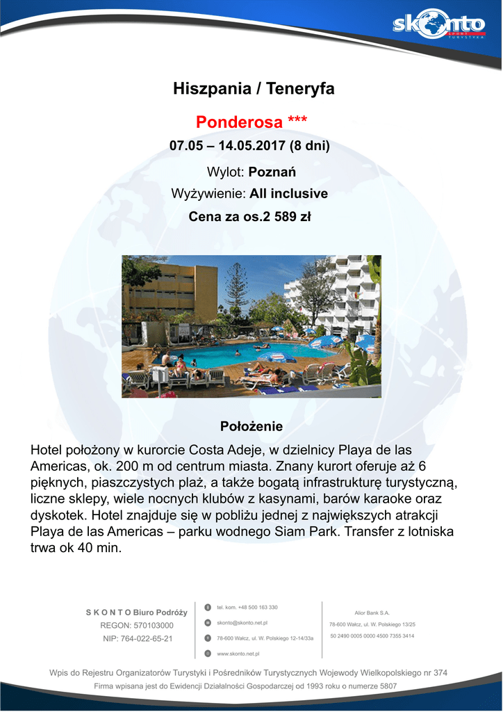 Hiszpania / Teneryfa Ponderosa *** 07.05 – 14.05.2017 (8 dni) Wylot: Poznań Wyżywienie: All inclusive Cena za os.2 589 zł Położenie Hotel położony w kurorcie Costa Adeje, w dzielnicy Playa de las Americas, ok. 200 m od centrum miasta. Znany kurort oferuje aż 6 pięknych, piaszczystych plaż, a także bogatą infrastrukturę turystyczną, liczne sklepy, wiele nocnych klubów z kasynami, barów karaoke oraz dyskotek. Hotel znajduje się w pobliżu jednej z największych atrakcji Playa de las Americas – parku wodnego Siam Park. Transfer z lotniska trwa ok 40 min. Plaża Hotel znajduje się ok 400 m od wulkanicznej plaży (ciemny piasek). Leżaki i parasole na plaży dodatkowo płatne (ok 5 eur/os). Do dyspozycji gości Recepcja 24h, lobby, winda, restauracja, bar, basen, brodzik dla dzieci, taras słoneczny, leżaki i parasole przy basenie bezpłatne. Reczniki plażowe (wymagana kaucja). Pokoje Hotel posiada 145 pokoi rozlokowanych na 12 piętrach. Wygodne studia standardowe przeznaczone maksymalnie dla 2 osób dorosłych i jednego dziecka (ok 38m2) wyposażone są w łazienkę, balkon lub taras z meblami tarasowymi, niewielki aneks kuchenny, lodówkę, TV, telefon. Suszarka do wypożyczenia na recepcji. Nie ma możliwości dostawienia łóżeczka dla dziecka przy 3 osobach w pokoju. Dodatkowo posiadamy też w naszej ofercie przestronne apartamenty (ok 60 m2), złożone z sypialni i pokoju dziennego, przeznaczone dla maksymalnie 4 osób. Wyposażenie jak w studiu. Wyżywienie All Inclusive: śniadania, lunche i obiadokolacje w formie bufetu. Przekąski (kanapki, ciasta) serwowane w barze w godzinach 16:00-18:00. Napoje bezalkoholowe oraz lokalne alkohole w godzinach 10:30 – 22:00 bezpłatnie. Do kolacji obowiązuje strój formalny (panowie proszeni są o noszenie długich spodni). Program sportowy i animacyjny Stół do tenisa stołowego, boisko wielofunkcyjne, niewielki plac zabaw, pokój gier, program sportowy i animacyjny, wieczorami przedstawienia i zabawy. Za dodatkową opłatą: stół do bilardu, rzutki, squash, wynajem rowerów. Internet Internet WiFi w całym hotelu za dodatkową opłatą (ok 5eur/dzień).