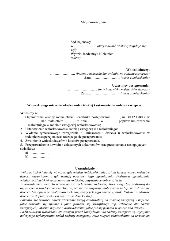 Miejscowość, dnia ………………………………. Sąd Rejonowy w ……………….. (miejscowość, w której znajduje się sąd) Wydział Rodzinny i Nieletnich (adres) Wnioskodawcy: …………………. (imiona i nazwiska kandydatów na rodzinę zastępczą) Zam. …………………… (adres zamieszkania) Uczestnicy postępowania: …………………….. (imię i nazwisko rodzica/-ów dziecka) Zam. ……………………….(adres zamieszkania) Wniosek o ograniczenie władzy rodzicielskiej i ustanowienie rodziny zastępczej Wnosimy o: 1. Ograniczenie władzy rodzicielskiej uczestnika postępowania …….., ur. 30.12.1980 r. w .………. nad małoletnim …….., ur. dnia ………. w ……….., poprzez umieszczenie małoletniego w rodzinie zastępczej wnioskodawców; 2. Ustanowienie wnioskodawców rodziną zastępczą dla małoletniego; 3. Wydanie tymczasowego zarządzenia o umieszczeniu dziecka u wnioskodawców w rodzinie zastępczej na czas toczącego się postępowania; 4. Zwolnienie wnioskodawców z kosztów postępowania. 5. Przeprowadzenie dowodu z załączonych dokumentów oraz przesłuchania następujących świadków: a) …………….. b) …………….. Uzasadnienie Wniosek taki składa się wówczas, gdy władza rodzicielska nie została jeszcze wobec rodziców dziecka ograniczona i gdy istnieją podstawy tego ograniczenia. Podstawą ograniczenia władzy rodzicielskiej są zachowania rodziców, zagrażające dobru dziecka. W uzasadnieniu wniosku trzeba opisać zachowania rodziców, które mogą być podstawą do ograniczenia władzy rodzicielskiej, w jaki sposób zagrażają dobru dziecka (np. pozostawianie dziecka bez opieki w okolicznościach zagrażających jego zdrowiu, brak dbałości o zdrowie dziecka w stopniu, w którym zagraża to dziecku itp.). Ponadto, we wniosku należy uzasadnić swoją kandydaturę na rodzinę zastępczą - napisać, jakie warunki się spełnia i jakie posiada się kwalifikacje (np. szkolenie dla rodzin zastępczych). Można napisać o doświadczeniu, jakie już się posiada w opiece nad dziećmi. Podstawowymi warunkami stawianymi przed kandydatami na rodziny zastępcze są: rękojmia należytego wykonywania zadań rodziny zastępczej, stałe miejsce zamieszkania na terytorium Rzeczypospolitej Polskiej, pełnia praw cywilnych i obywatelskich, aktualnie ani w przeszłości nie można mieć pozbawionej władzy rodzicielskiej, aktualnie ograniczonej lub zawieszonej, wywiązywanie się z obowiązku łożenia na utrzymanie osoby najbliższej lub innej osoby, gdy ciąży na nich taki obowiązek z mocy prawa lub orzeczenia sądu, dobry stan zdrowia (kandydaci nie powinni być chorzy na chorobę uniemożliwiającą właściwą opiekę nad dzieckiem), co zostało stwierdzone zaświadczeniem lekarskim, posiadanie odpowiednich warunków mieszkaniowych oraz stałego źródła utrzymania, uzyskanie pozytywnej opinii ośrodka pomocy społecznej właściwego ze względu na miejsce zamieszkania. Sąd, przy doborze rodziny zastępczej uwzględnia przede wszystkim osoby spokrewnione z dzieckiem, jeżeli dają gwarancję poprawy sytuacji dziecka, kwalifikacje kandydatów, odpowiednią różnicę wieku między kandydatami a dzieckiem, poziom rozwoju i sprawności dziecka, a także zasadę nierozłączania rodzeństwa. Kandydaci na rodzinę zastępczą powinni przejść szkolenie, przy czym szkolenie spokrewnionych rodzin zastępczych prowadzi się według indywidualnego planu szkolenia, w zależności od potrzeb danej rodziny. Podpisy Załączniki: 1. odpis zupełny aktu urodzenia 2. …. 3. odpis wniosku i kserokopie załączników (dla każdego uczestnika) Jako załączniki należy dołączyć zaświadczenie lekarskie, zaświadczenie o ukończeniu kursu, kwalifikację na rodzinę zastępczą, odpis aktu małżeństwa – jeśli rodzinę zastępczą chce ustanowić małżeństwo.