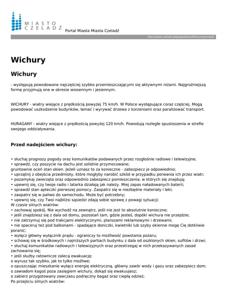 Portal Miasta Miasta Czeladź http://www.czeladz.pl/gospodarka/Wichury/printpdf Wichury Wichury - występują powodowane najczęściej szybko przemieszczającymi się aktywnymi niżami. Najgroźniejszą formę przyjmują one w okresie wiosennym i jesiennym. WICHURY - wiatry wiejące z prędkością powyżej 75 km/h. W Polsce występujące coraz częściej. Mogą powodować uszkodzenie budynków, łamać i wyrywać drzewa z korzeniami oraz paraliżować transport. HURAGANY - wiatry wiejące z prędkością powyżej 120 km/h. Powodują rozległe spustoszenia w strefie swojego oddziaływania. Przed nadejściem wichury: • słuchaj prognozy pogody oraz komunikatów podawanych przez rozgłośnie radiowe i telewizyjne; • sprawdź, czy poszycie na dachu jest solidnie przymocowane; gruntownie oceń stan okien. Jeżeli uznasz to za konieczne - zabezpiecz je odpowiednio; • uprzątnij z obejścia przedmioty, które mogłyby narobić szkód w przypadku porwania ich przez wiatr; • pozamykaj zwierzęta oraz odpowiednio zabezpiecz pomieszczenia, w których się znajdują; • upewnij się, czy twoje radio i latarka działają jak należy. Miej zapas naładowanych baterii; • sprawdź stan apteczki pierwszej pomocy. Zaopatrz się w niezbędne materiały i leki; • zaopatrz się w paliwo do samochodu. Może być potrzebny; • upewnij się, czy Twoi najbliżsi sąsiedzi zdają sobie sprawę z powagi sytuacji; W czasie silnych wiatrów: • zachowaj spokój. Nie wychodź na zewnątrz, jeśli nie jest to absolutnie konieczne; • jeśli znajdziesz się z dala od domu, pozostań tam, gdzie jesteś, dopóki wichura nie przejdzie; • nie zatrzymuj się pod trakcjami elektrycznymi, planszami reklamowymi i drzewami; • nie spaceruj też pod balkonami - spadające doniczki, kwietniki lub szyby okienne mogę Cię dotkliwie poranić; • wyłącz główny wyłącznik prądu - ograniczy to możliwość powstania pożaru; • schowaj się w środkowych i najniższych partiach budynku z dala od oszklonych okien, sufitów i drzwi; • słuchaj komunikatów radiowych i telewizyjnych oraz przestrzegaj w nich przekazywanych zasad zachowania się; • jeśli służby ratownicze zalecą ewakuację: o wyrusz tak szybko, jak to tylko możliwe; o opuszczając mieszkanie wyłącz energię elektryczną, główny zawór wody i gazu oraz zabezpiecz dom; o zawiadom kogoś poza zasięgiem wichury, dokąd się ewakuujesz; o zabierz przygotowany zawczasu podręczny bagaż oraz ciepłą odzież; Po przejściu silnych wiatrów: • zorganizuj pomoc, w tym medyczną, dla poszkodowanych; • uprzątnij zniszczony sprzęt i dokonaj niezbędnych napraw w swoim domu; • nie próbuj usuwać zwalonych drzew, które upadły na linie energetyczne. Nie dotykaj zerwanych przewodów; • jeśli jesteś ubezpieczony wykonaj zdjęcia zniszczeń, zarówno domu, jak i jego wyposażenia; • sprawdź instalację (gazową, elektryczną, wodociągową i ściekową) w zniszczonym domu; • zgłoś się w swoim miejscu pracy - możesz być potrzebny; O wszystkich zdarzeniach, mających istotne znaczenia dla bezpieczeństwa ludzi informuj służby dyżurne: • Straży Pożarnej; • Policji; • Pogotowia energetycznego; • Pogotowia gazowego;