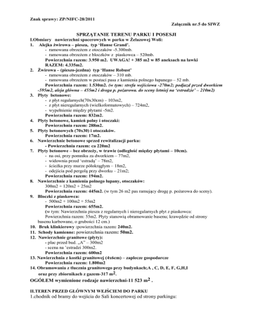 Znak sprawy: ZP/NIFC-28/2011 Załącznik nr.5 do SIWZ SPRZĄTANIE TERENU PARKU I POSESJI I.Obmiary nawierzchni spacerowych w parku w Żelazowej Woli: 1. Alejka żwirowa – piesza, typ ‘Hanse Grand’. - ramowana obrzeżem z otoczaków -5.300mb. - ramowana obrzeżem z bloczków z piaskowca – 520mb. Powierzchnia razem: 3.950 m2. UWAGA! + 385 m2 w 85 aneksach na ławki RAZEM: 4.335m2. 2. Żwirowa – (pieszo-jezdna) typ ‘Hanse Robust’ - ramowana obrzeżem z otoczaków – 310 mb. - ramowana obrzeżem w postaci pasa z kamienia polnego łupanego – 52 mb. Powierzchnia razem: 1.530m2. (w tym: strefa wejściowa -270m2; podjazd przed dworkiem -595m2, aleja główna – 455m2 i droga p. pożarowa. do sceny letniej na ‘estradzie’ – 210m2) 3. Płyty betonowe: - z płyt regularnych(70x30cm) – 103m2, - z płyt nieregularnych (wielkoformatowych) – 724m2, - wypełnienie między płytami -5m2. Powierzchnia razem: 832m2. 4. Płyty betonowe, kamień polny i otoczaki: Powierzchnia razem: 288m2. 5. Płyty betonowych (70x30) i otoczaków. Powierzchnia razem: 17m2. 6. Nawierzchnie betonowe sprzed rewitalizacji parku: - Powierzchnia razem: ca 220m2 7. Płyty betonowe – bez obrzeży, w trawie (odległość między płytami – 10cm). - na osi, przy pomniku za dworkiem – 77m2, - widownia przed ‘estradą’ – 78m2, - ścieżka przy murze półokrągłym – 18m2, - odejścia pod pergolą przy dworku – 21m2; Powierzchnia razem: 194m2. 8. Nawierzchnie z kamienia polnego łupany, otoczaków: 300m2 + 120m2 + 25m2 Powierzchnia razem: 445m2. (w tym 26 m2 pas ramujący drogę p. pożarowa do sceny). 9. Bloczki z piaskowca: - 500m2 + 100m2 + 55m2 Powierzchnia razem: 655m2. (w tym: Nawierzchnia piesza z regularnych i nieregularnych płyt z piaskowca: Powierzchnia razem: 55m2. Płyty stanowią obramowanie basenu; krawędzie od strony basenu karbowane, o grubości 12 cm.) 10. Bruk klinkierowy :powierzchnia razem: 240m2. 11. Schody kamienne: powierzchnia razem: 50m2. 12. Nawierzchnie granitowe (płyty): - plac przed bud. „A” – 300m2 - scena na ’estradzi 300m2. Powierzchnia razem: 600m2 13. Nawierzchnia z kostki granitowej (4x6cm) – zaplecze gospodarcze Powierzchnia razem: 1.800m2 14. Obramowania z tłucznia granitowego przy budynkach;A , C, D, E, F, G,H,I oraz przy zbiornikach z gazem-317 m2. OGÓŁEM wymienione rodzaje nawierzchni-11 523 m2 . II.TEREN PRZED GŁÓWNYM WEJŚCIEM DO PARKU 1.chodnik od bramy do wejścia do Sali koncertowej od strony parkingu: 100mb x 2mb =200m2, 2.plac przed wejściem do parku i do bud „A”: wraz ze skwerem(trawnik) i żywopłotem . ca 20 x 25mb) = ca 500m2 RAZEM powierzchnia-700 m2 . III. TEREN ULICZNY PRZY POSESJI Strona północna : 1300 m2, Strona zachodnia : 650 m2 Razem 1950 m2 TERENY ZIELONE PRZY BUDYNKACH „E’ i ‘F’- Powierzchnia 2 000 m2. BASEN PRZED DWORKIEM. Granit. Powierzchnia 100 m2. Ogółem powierzchnia:4050 m2. IV. ELEMENTY MA.LEJ ARCHITEKTURY 1. Most – nowy – 3 x 26mb = 78m2, drewno, 2. Most - stary – 2.50 x 12mb = 30m2, drewno 3. Altanka – nowa – 7m średnicy (wewnątrz ‘Hanse Grand’). = 38.45m2. 4. Altanka – stara – 10 m średnicy – płyty betonowe = 78.50m2 5. Altanki na kręgu – 2 szt. (7.00 x 3m) = 42 m2 (beton.) 6. Pomost przy moście: (15.80 x 1.50) + (31.80 x 1.47) = 46.75m2 (drewno). 7. Pomost – przepust – (2.20 x 2.00) = 4.40 m2, drewno. RAZEM powierzchnia –318,1 m2 . OGÓŁEM Powierzchnie wymienione w pkt.I do IV=16 591 m2 V. ZAKRES CZYNNOŚCI ZWIĄZANYCH ZE SPRZĄTANIEM PARKU, TERENU ZAPLECZA GOSPODARCZEGO i TERENU NA ZEWNĄTRZ WOKÓŁ OGRODZENIA PARKU W ŻELAZOWEJ WOLI 1. Nawierzchnie: a).Utrzymanie w czystości alejek wraz z aneksami z ławkami, ścieżek, chodników, parkingów i placów w sąsiedztwie obiektów oraz w pomieszczeniach na pojemniki na śmieci . b).Wybieranie śmieci z koszy i transportowanie ich do pojemników na śmieci. c) Czyszczenie ławek. d)W okresie zimy usuwanie śniegu, oblodzeń i błota z chodników, placów i parkingów zlokalizowanych przy budynkach w obiekcie. oraz przed jego wejściem i z ciągów komunikacyjnych przy parku. e) Zabezpieczenie przed oblodzeniem i śliskością pośniegową z powierzchni uczęszczanych przez turystów i użytkowników parku i budynków, używając piasku typu „Hanse Grand lub Hanse Robust” oraz środków chemicznych (posiadających stosowne wymagane prawem atesty) ,po uzgodnieniu z Zarządcą nieruchomości. 2. Tereny zielone : trawniki ,skwery, pas zieleni przy parkanie: usuwanie liści i śmieci 3. Basen przed dworkiem:usuwanie z powierzchni i dna opadłych liści i kwiatostanów, owoców i śmieci, II. Pomniki, mosty i elementy architektury Usuwanie zanieczyszczeń (śmieci, śnieg, błoto, pajęczyny, ptasie odchody, napisy). 1. Zabezpieczenie przed oblodzeniem i śliskością pośniegową nawierzchni mostów. 3. W ramach sprzątania należy również uwzględnić: - ławki stałe - 133 szt., kosze na śmieci - 81 szt. - lampy : słupki - 210 szt., lampy w ziemi do podświetlania drzew - 64 szt. - lampy małej architektury: w ziemi, kierunkowe - 14 szt., wbudowane w pionowe płaszczyzny murków i siedzisk - 17 szt. - głośniki - 116 szt. 4. usuwanie liści i innych zanieczyszczeń z wnętrza studzienek kanalizacyjnych usytuo- wanych w obrębie parku”, UWAGA: średnio w skali roku niezbędne jest stałe zatrudnienie osób w wymiarze przeliczeniowym 240 godz/m-c łącznie, w celu realizacji wymienionego zakresu sprzątania terenu.