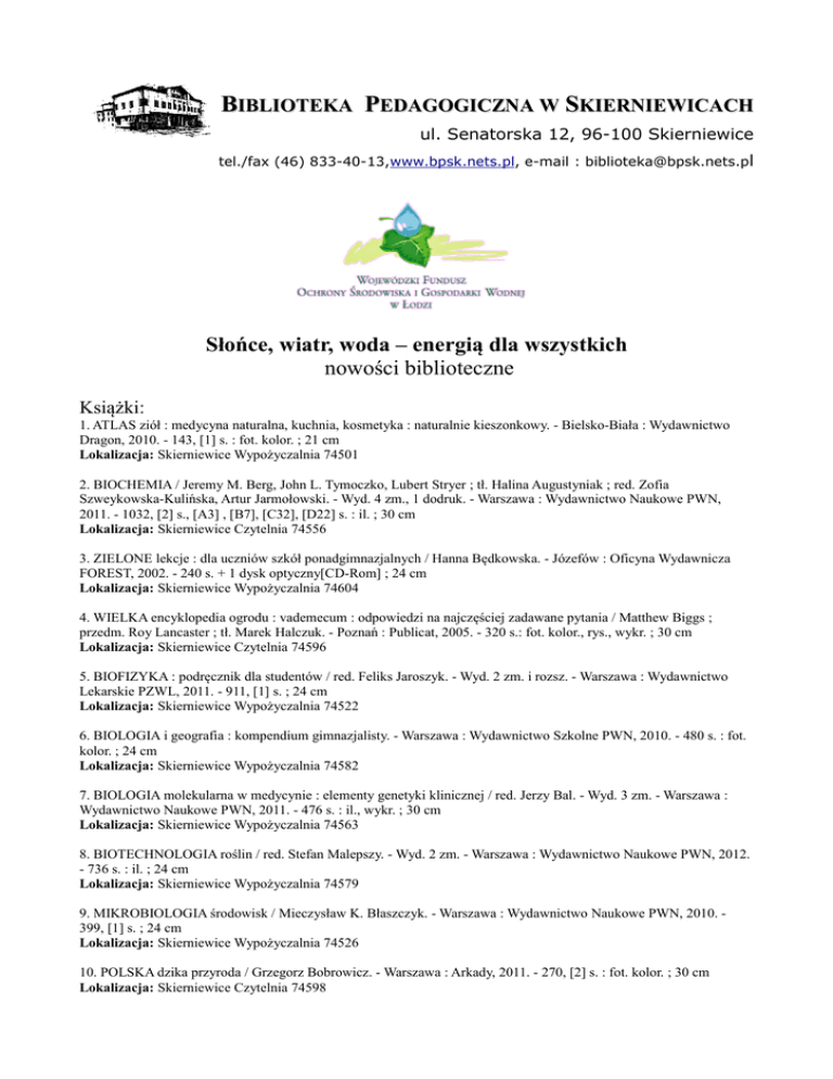 BIBLIOTEKA PEDAGOGICZNA W SKIERNIEWICACH ul. Senatorska 12, 96-100 Skierniewice tel./fax (46) 833-40-13,www.bpsk.nets.pl, e-mail : [email protected] Słońce, wiatr, woda – energią dla wszystkich nowości biblioteczne Książki: 1. ATLAS ziół : medycyna naturalna, kuchnia, kosmetyka : naturalnie kieszonkowy. - Bielsko-Biała : Wydawnictwo Dragon, 2010. - 143, [1] s. : fot. kolor. ; 21 cm Lokalizacja: Skierniewice Wypożyczalnia 74501 2. BIOCHEMIA / Jeremy M. Berg, John L. Tymoczko, Lubert Stryer ; tł. Halina Augustyniak ; red. Zofia Szweykowska-Kulińska, Artur Jarmołowski. - Wyd. 4 zm., 1 dodruk. - Warszawa : Wydawnictwo Naukowe PWN, 2011. - 1032, [2] s., [A3] , [B7], [C32], [D22] s. : il. ; 30 cm Lokalizacja: Skierniewice Czytelnia 74556 3. ZIELONE lekcje : dla uczniów szkół ponadgimnazjalnych / Hanna Będkowska. - Józefów : Oficyna Wydawnicza FOREST, 2002. - 240 s. + 1 dysk optyczny[CD-Rom] ; 24 cm Lokalizacja: Skierniewice Wypożyczalnia 74604 4. WIELKA encyklopedia ogrodu : vademecum : odpowiedzi na najczęściej zadawane pytania / Matthew Biggs ; przedm. Roy Lancaster ; tł. Marek Halczuk. - Poznań : Publicat, 2005. - 320 s.: fot. kolor., rys., wykr. ; 30 cm Lokalizacja: Skierniewice Czytelnia 74596 5. BIOFIZYKA : podręcznik dla studentów / red. Feliks Jaroszyk. - Wyd. 2 zm. i rozsz. - Warszawa : Wydawnictwo Lekarskie PZWL, 2011. - 911, [1] s. ; 24 cm Lokalizacja: Skierniewice Wypożyczalnia 74522 6. BIOLOGIA i geografia : kompendium gimnazjalisty. - Warszawa : Wydawnictwo Szkolne PWN, 2010. - 480 s. : fot. kolor. ; 24 cm Lokalizacja: Skierniewice Wypożyczalnia 74582 7. BIOLOGIA molekularna w medycynie : elementy genetyki klinicznej / red. Jerzy Bal. - Wyd. 3 zm. - Warszawa : Wydawnictwo Naukowe PWN, 2011. - 476 s. : il., wykr. ; 30 cm Lokalizacja: Skierniewice Wypożyczalnia 74563 8. BIOTECHNOLOGIA roślin / red. Stefan Malepszy. - Wyd. 2 zm. - Warszawa : Wydawnictwo Naukowe PWN, 2012. - 736 s. : il. ; 24 cm Lokalizacja: Skierniewice Wypożyczalnia 74579 9. MIKROBIOLOGIA środowisk / Mieczysław K. Błaszczyk. - Warszawa : Wydawnictwo Naukowe PWN, 2010. 399, [1] s. ; 24 cm Lokalizacja: Skierniewice Wypożyczalnia 74526 10. POLSKA dzika przyroda / Grzegorz Bobrowicz. - Warszawa : Arkady, 2011. - 270, [2] s. : fot. kolor. ; 30 cm Lokalizacja: Skierniewice Czytelnia 74598 11. KONIE / Gabriele Boiselle ; tł. Monika Wyrwas-Wiśniewska ; red. Elżbieta Adamska. - Ożarów Mazowiecki : Wydawnictwo Olesiejuk, 2010. - 735, [1] s. : fot. kolor. ; 17 cm Lokalizacja: Skierniewice Wypożyczalnia 74499 12. ORGANIZACJA i zarządzanie turystyką w Polsce / Jacek Borzyszkowski. - Warszawa : CeDeWu, 2011. - 142 s. : rys. ; 24 cm Lokalizacja: Skierniewice Wypożyczalnia 74517 13. CHEMIA organiczna : krótki kurs / Harold Hart, Leslie E. Craine, David J. Hart, Christopher M. Hadad ; tł. Winicjusz Ciesielski. - Wyd. 2. - Warszawa : Wydawnictwo Lekarskie PZWL, 2008. - 557 s. : il. ; 30 cm Lokalizacja: Skierniewice Wypożyczalnia 74570 14. ENERGETYKA słoneczna budynku / Dorota Chwieduk. - Warszawa : Arkady, 2011. - 527 s. : rys. kol. ; 25 cm Lokalizacja: Skierniewice Wypożyczalnia 74546 15. ZARYS współczesnej promocji zdrowia / Dorota Cianciara. - Warszawa : Wydawnictwo Lekarskie PZWL, 2010. 243, [1] s. ; 21 cm Lokalizacja: Skierniewice Wypożyczalnia 74551 16. DIETETYKA : żywienie zdrowego i chorego człowieka / Helena Ciborowska, Anna Rudnicka, Artur Ciborowski. Wyd. 3 uzup. - Warszawa : Wydawnictwo Lekarskie PZWL, 2010. - 670, [1] s. ; 24 cm Lokalizacja: Skierniewice Wypożyczalnia 74576, 73808 17. KWIATY w domu : 150 gatunków od A do Z : porady, pielęgnacja, ciekawostki / Barbara Ciereszko, Jarosław Rak. - Warszawa : Multico Oficyna Wydawnicza, cop. 2007. - 280 s. : il. kolor ; 28 cm Lokalizacja: Skierniewice Wypożyczalnia 74557 18. CZŁOWIEK globalny : globalizacja, ewolucja, historia kobiet, neuropolityka, neuroekonomia, kryzys ekologiczny / Dorota Czajkowska-Majewska. - Warszawa : Państwowy Instytut Wydawniczy, 2009. - 270, [2] s ; 20 cm. - (Biblioteka Myśli Współczesnej) Lokalizacja: Skierniewice Wypożyczalnia 74497 19. TURYSTYKA międzynarodowa w globalnej gospodarce / Barbara Jolanta Dąbrowska. - Warszawa : Polskie Wydawnictwo Ekonomiczne, 2011. - 146 s. ; 24 cm Lokalizacja: Skierniewice Wypożyczalnia 74516 20. ATLAS histopatologii : tajemniczy świat chorych komórek człowieka = Atlas of histopathology : the mysterious world of diseased human cells / Wenancjusz Domagała, Maria Chosia, Elżbieta Urasińska. - Warszawa : Wydawnictwo Lekarskie PZWL, 2010. - 384, [4] s. ; 24 cm Lokalizacja: Skierniewice Wypożyczalnia 74609 21. PODSTAWY patologii / Wenancjusz Domagała, Maria Chosia, Elżbieta Urasińska. - Warszawa : Wydawnictwo Lekarskie PZWL, 2010. - 706 s. ; 24 cm Lokalizacja: Skierniewice Wypożyczalnia 74608 22. DRZEWA naszych lasów : zeszyt z kalką 100 kształtów do odrysowania / red. Grażyna Maternicka ; rys. Andżelika Bielańska. - Warszawa : MULTICO Oficyna Wydawnicza, 2010. - 32 s. : fot. kolor., rys. ; 30 cm Lokalizacja: Skierniewice Wypożyczalnia 74610 23. DZIEJE nauki : nauki ścisłe i przyrodnicze. - Warszawa : Wydawnictwo Szkolne PWN, 2011. - 779 s. : il. kolor., portr. ; 25 cm Lokalizacja: Skierniewice Czytelnia 74124; Skierniewice Wypożyczalnia 74564 24. GROCH i kapusta : podróżuj po Polsce : południowy wschód / Elżbieta Dzikowska. - Wyd. 3. - Warszawa : Rosikon Press, 2011. - 319, [1] s. : fot. kolor. ; 25 cm Lokalizacja: Skierniewice Wypożyczalnia 74532 25. GROCH i kapusta : podróżuj po Polsce : północny wschód / Elżbieta Dzikowska. - Wyd. 3. - Warszawa : Rosikon Press, 2011. - 223, [1] s. : fot. kolor. ; 25 cm Lokalizacja: Skierniewice Wypożyczalnia 74531 26. GROCH i kapusta : podróżuj po Polsce : północny zachód / Elżbieta Dzikowska. - Wyd. 2. - Warszawa : Rosikon Press, 2009. - 287, [1] s. : fot. kolor. ; 25 c Lokalizacja: Skierniewice Wypożyczalnia 74533 27. EKONOMIKA turystyki i rekreacji / red. Aleksander Pa